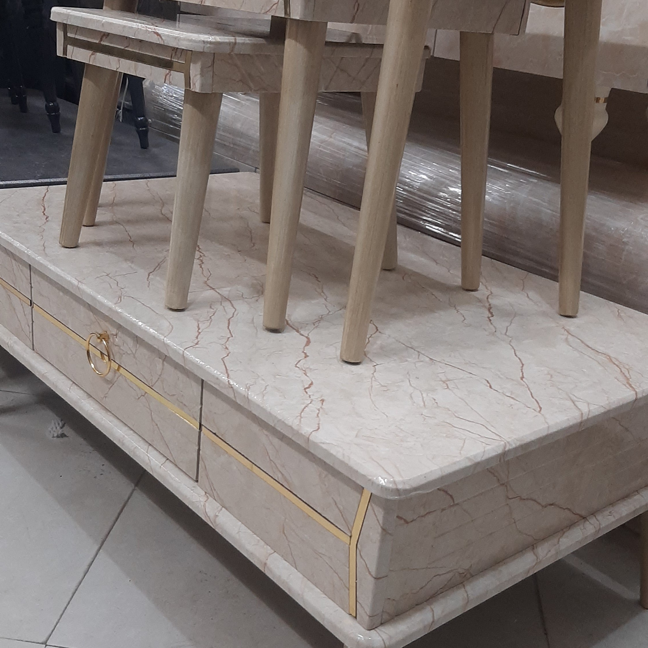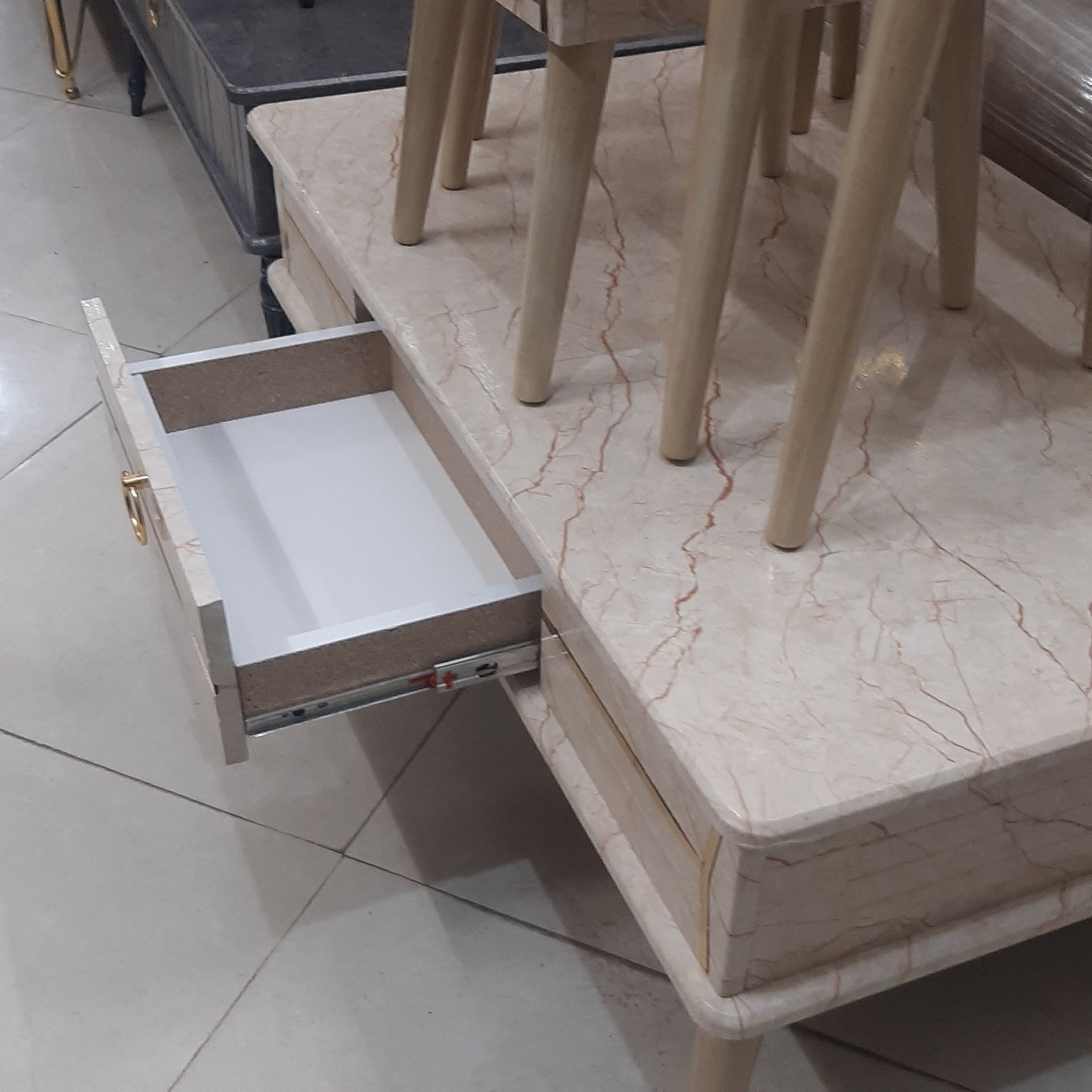 میزعسلی وکیوم شامل یک میز بزرگ و سه عدد عسلی رنگ بندی به سلیقه مشتری رنگ بندی بیشتر شامل سفید، کلیاف، والیس، بتنی ، مشکی یا دودی است. جنس رویه میز ام دی اف با رویه وکیوم ضدخش می باشد. جنس پایه ها نوعی پلاستیک فشرده محکم و بادوام می باشد . میز اصلی دارای کشو می باشد.