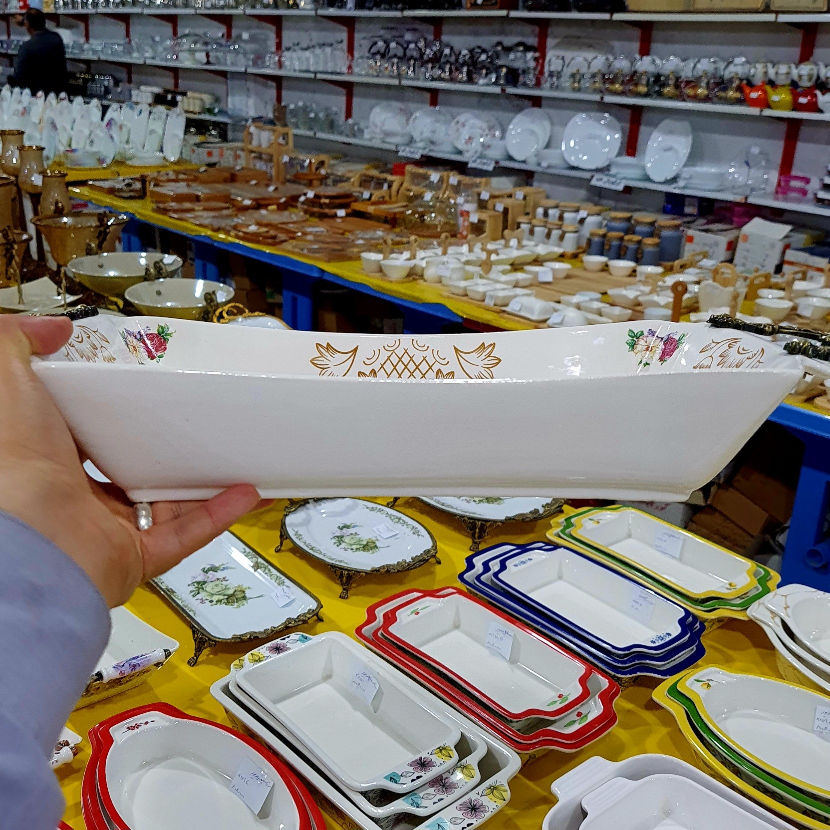 این ظروف سرامیکی با یک نقش بسیار زیبا و چشم نواز که بصورت کوره ای بر روی سطح ظرف چاپ شده از جنس سرامیک تولید شده اند این ظروف برای سرو انواع غذا و دسر، اجیل، شکلات ، میوه سوپ،آش، خورشت و... از میهمانان طراحی شده این ظروف قابلیت قرارگیری در ماشین ظرفشویی و فریزر را دارند برای این ظروف سرامیکی زیبا و با کیفیت جعبه های محکم و بسیار شیکی طراحی شده که هدیه دادن این ظروف را بسیار خوشگوار کرده است ابعاد محصول طول محصول 34 سانت عرض محصول 15.5سانت طول محصول با دسته 42 سانت ارتفاع محصول 6 سانت