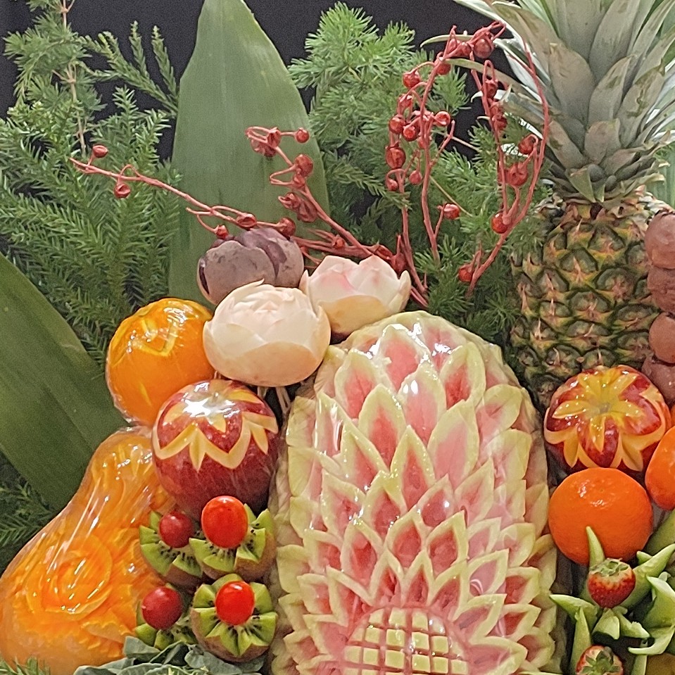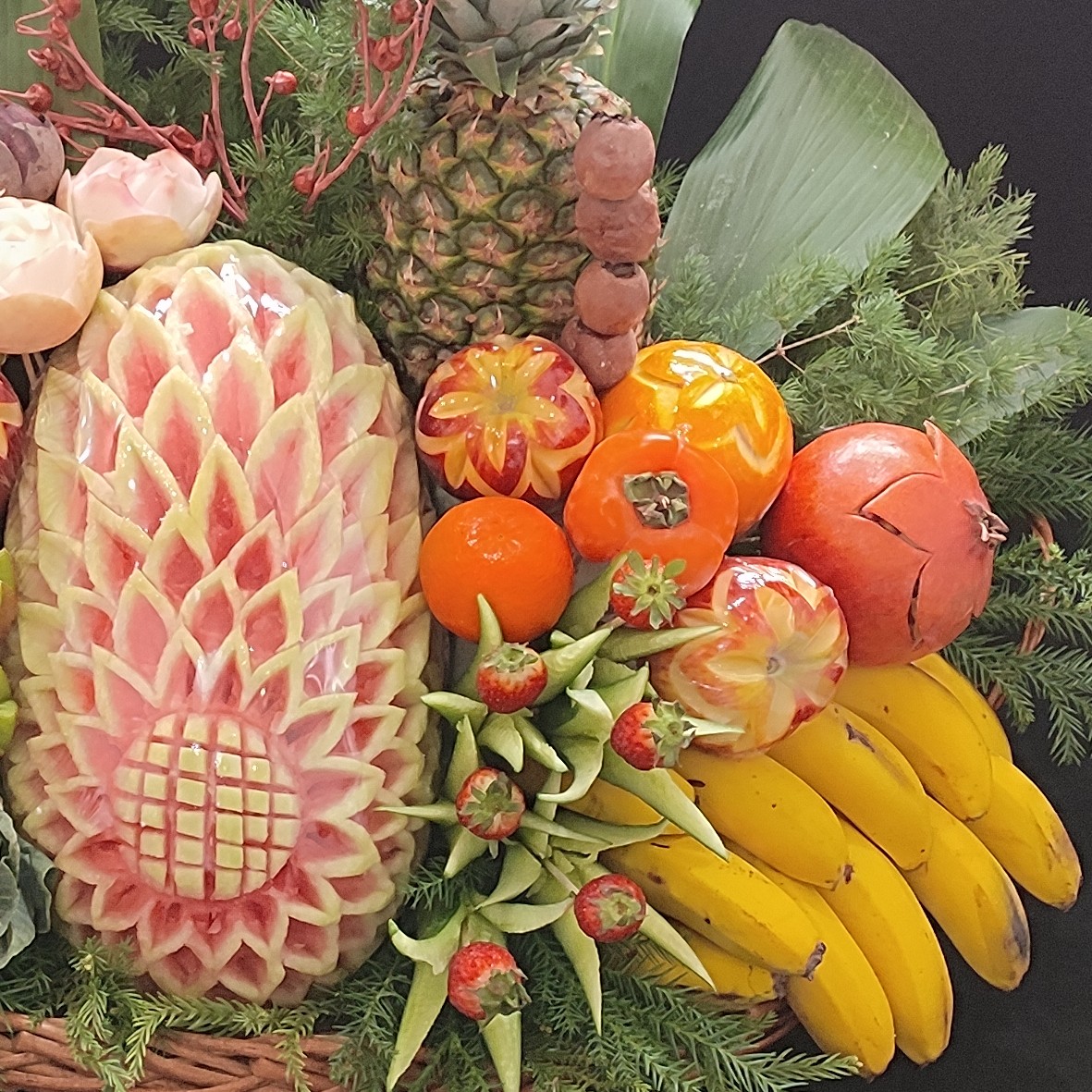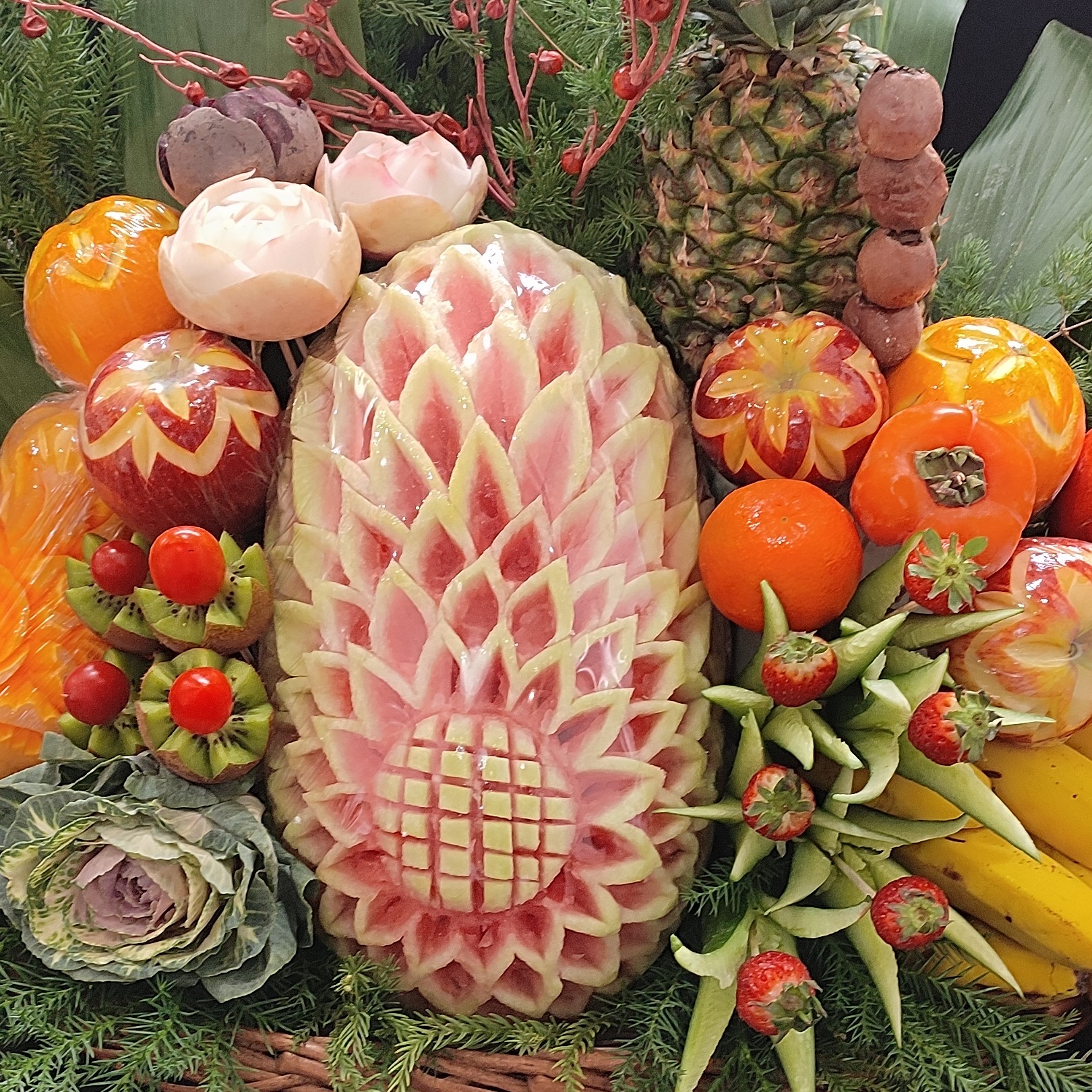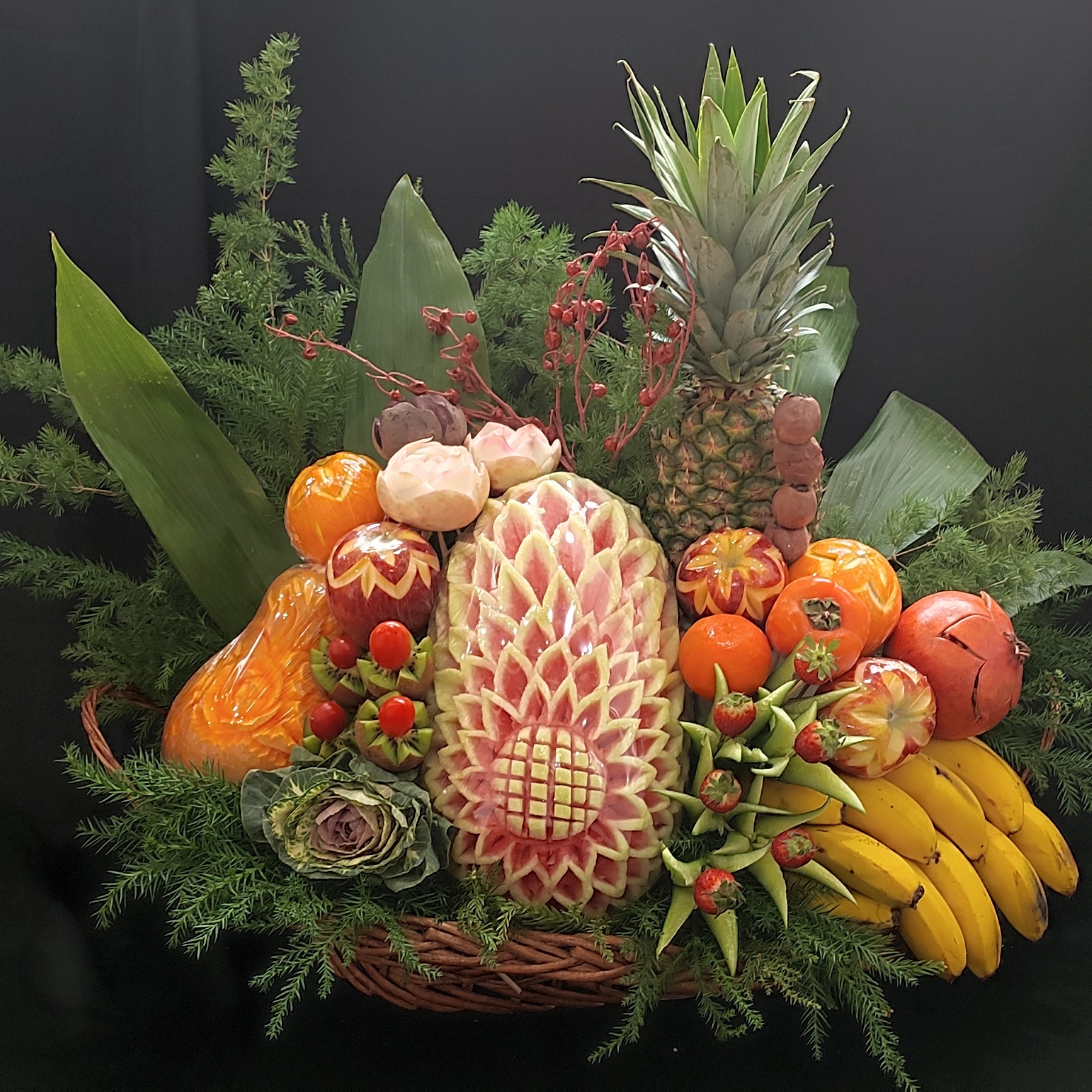سبد میوه آرایی شده هندوانه به همراه موز و آناناس و کدو ،گلهای لبو و شلغم اندازه حدودا 70 در 70 سانتی متر مبلمونسرا مدل 273315