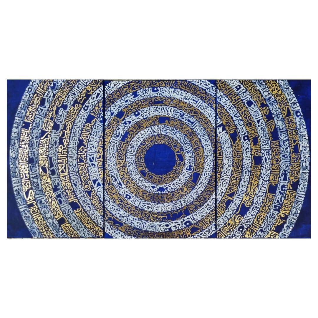 تابلو کالیگرافی نقاشیخط روی بوم سه لت با نوشته ورق طلا و رنک آکریلیک چهار قل و آیت الکرسی ابعاد پنج در نود و پنج