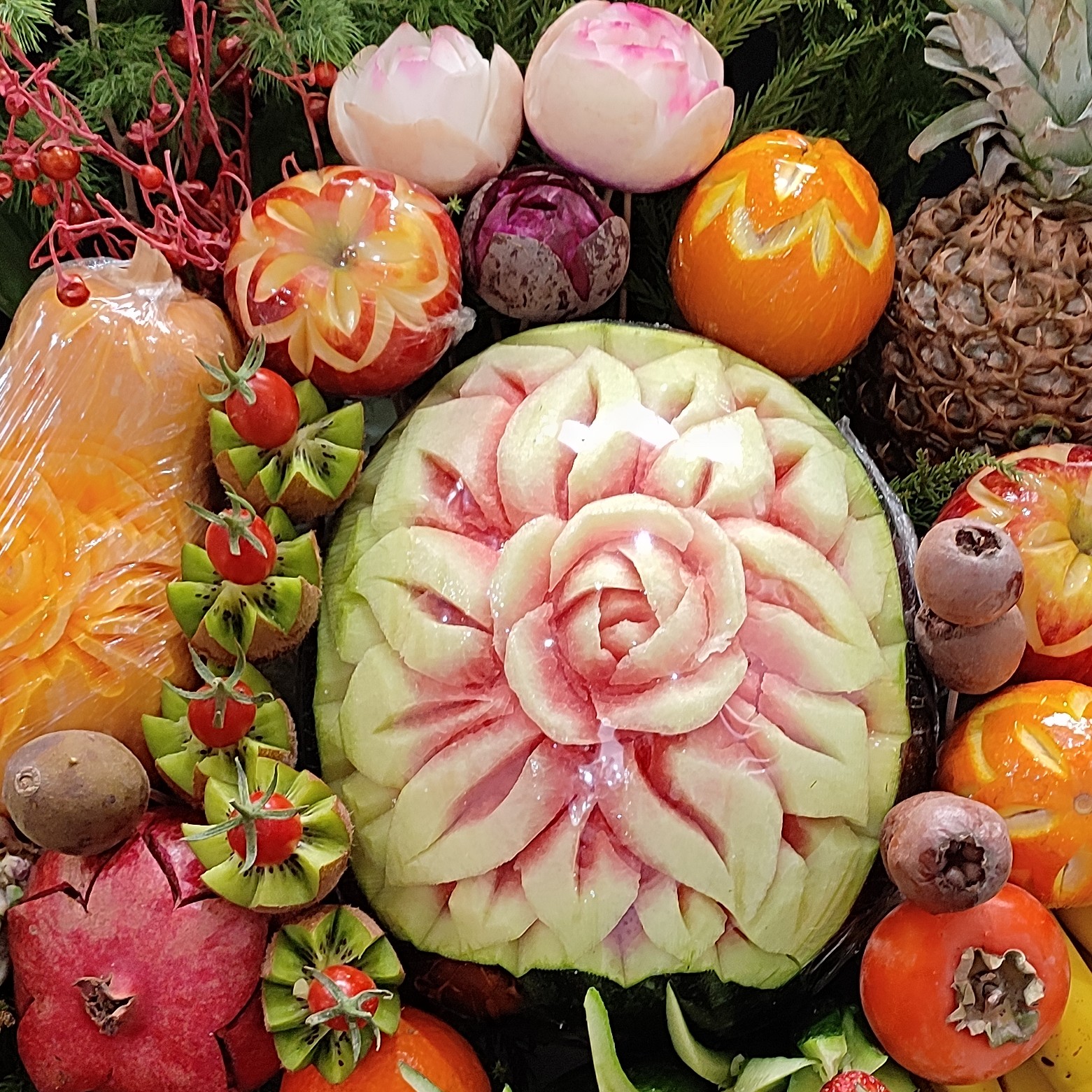 سبد میوه آرایی یلدا ،سایز بزرگ هندوانه و کدو حکاکی شده به همراه گل های لبو و شلغم شده اندازه حدودا 70در 70سانتی متر مبلمونسرا مدل 274644