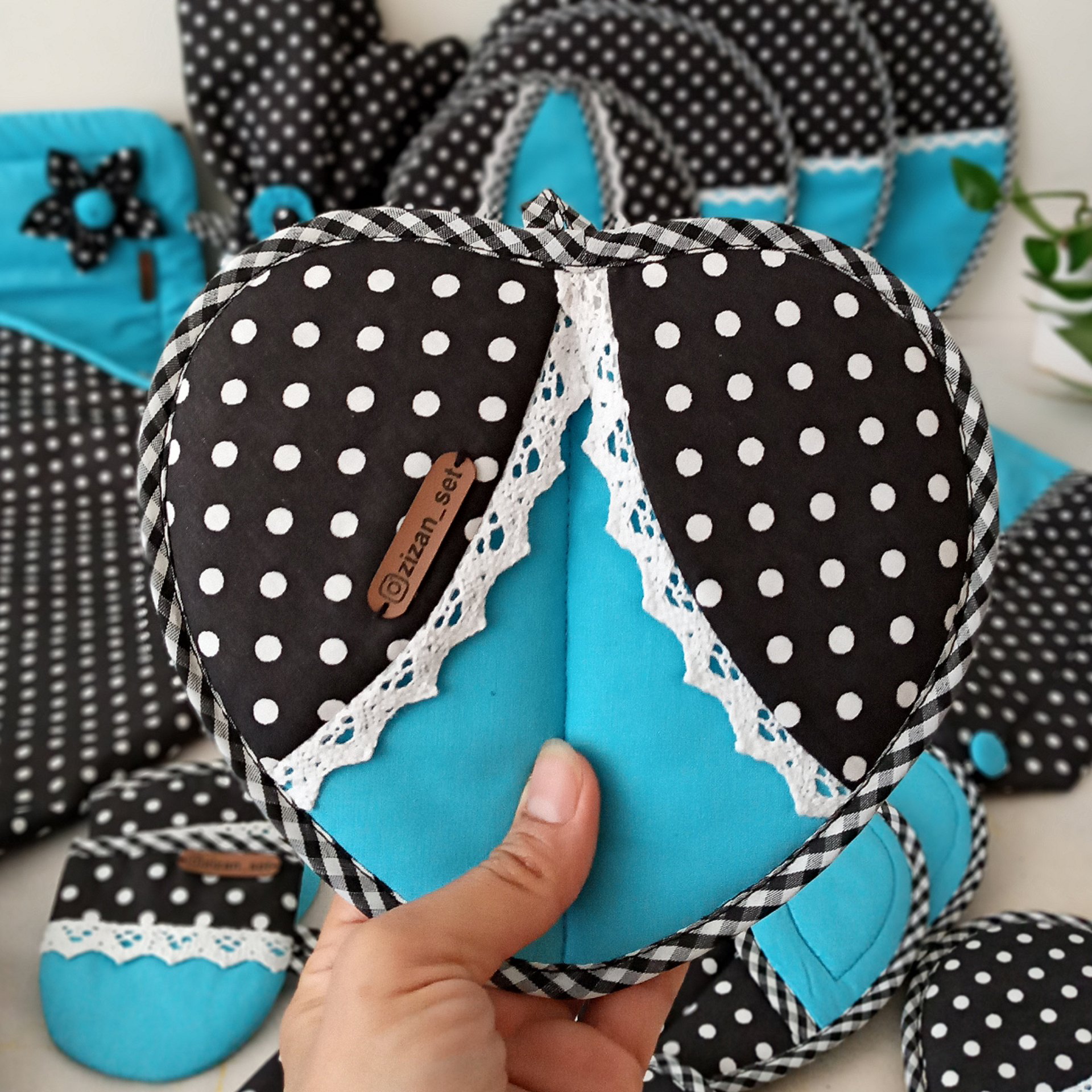 سرویس پارچه ای آشپزخانه 12 تکه شامل: 1_پیشبند دودامنه 2 لایه با پارچه برزنت ضد آب و ضد حرارت 2_کیسه سبزی سایز متوسط 3لایه با برزنت ضد آب و ضد حرارت وچلوار 3_کیف خرید نان 3 لایه با پارچه برزنت ضد آب و ضد حرارت و آستر چلوار 4_کاور قابلمه سایز متوسط 5_یک جفت دستگیره قلب 6_یک جفت دستکش فر 7_نمگیر ظروف 3 لایه ضد آب سایز 100×50 با آستر برزنت ضد آب و ضد حرارت 8_دمکنی مدل چشمی در 3 سایز مناسب درب قابلمه پیرکس ❌ هزینه تزیینات مانند دکمه ، تور کنفی ، مغزی ، چین پرک و... جدا محاسبه میشود.❌ دوستان عزیز پارچه استفاده شده در این کار از بهترین کتان نخهای ترک هست که از نظر کیفیت عالی هستند. ❌شما دوستان میتونید قبل از ثبت سفارش و به منظور تغییر طرح و رنگ پارچه یا تغییر تعداد اقلام موجود در ست به بنده اطلاع بدید . ❌حتما حتما قبل از ثبت سفارش با بنده در ارتباط باشید.با تشکر❌