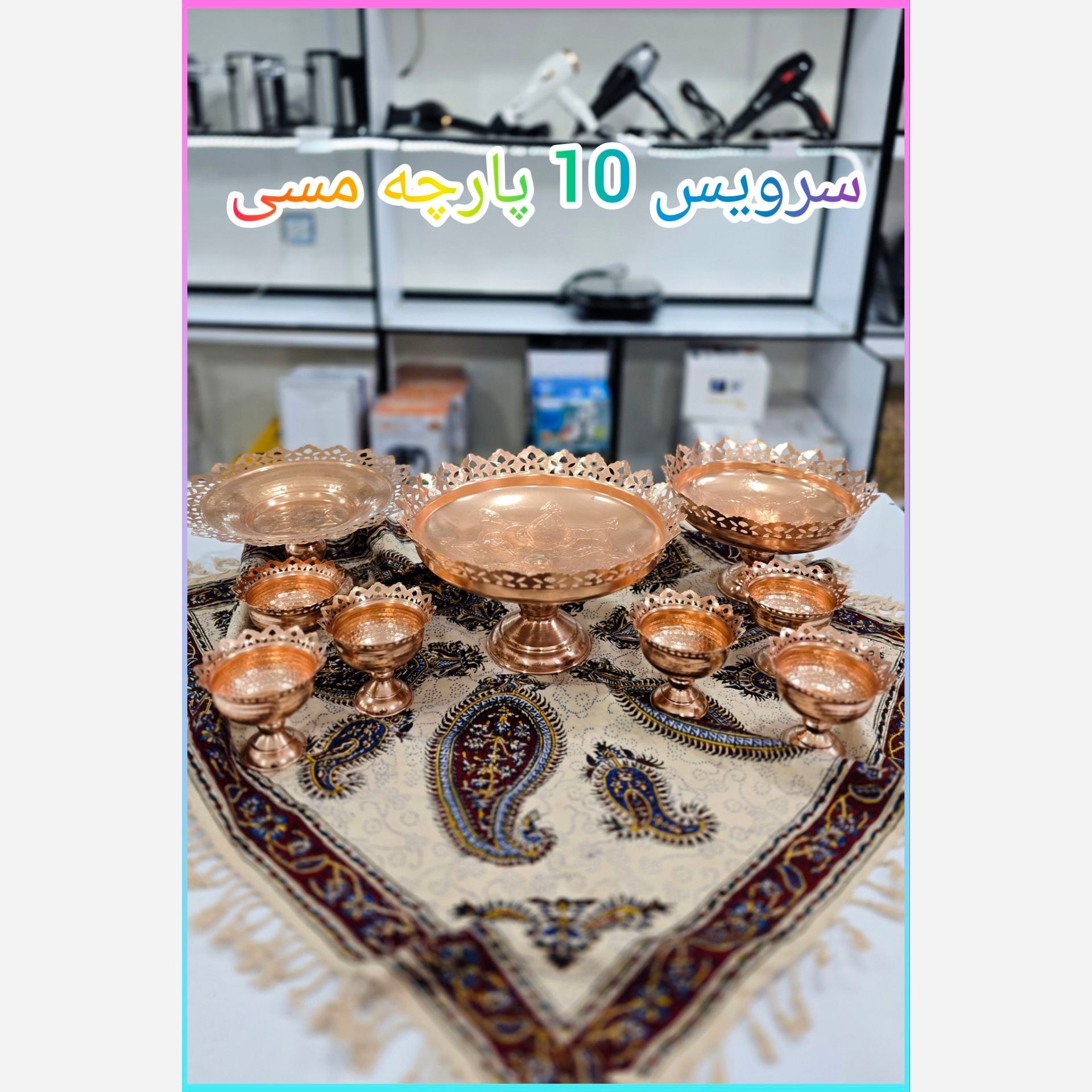 سرویس پذیرایی MATIN MES 💥 تمام مسی،طرح دار1عدد شیرینی خوری 1عدد آجیل خوری 1عدد جا میوه دارای 1 عدد ترمه سنتی با کیفیت بالا جنس ضخیم،نوع پرداخت چکشی👌 هم کاربردی هم درمانی هم دکوری🎈