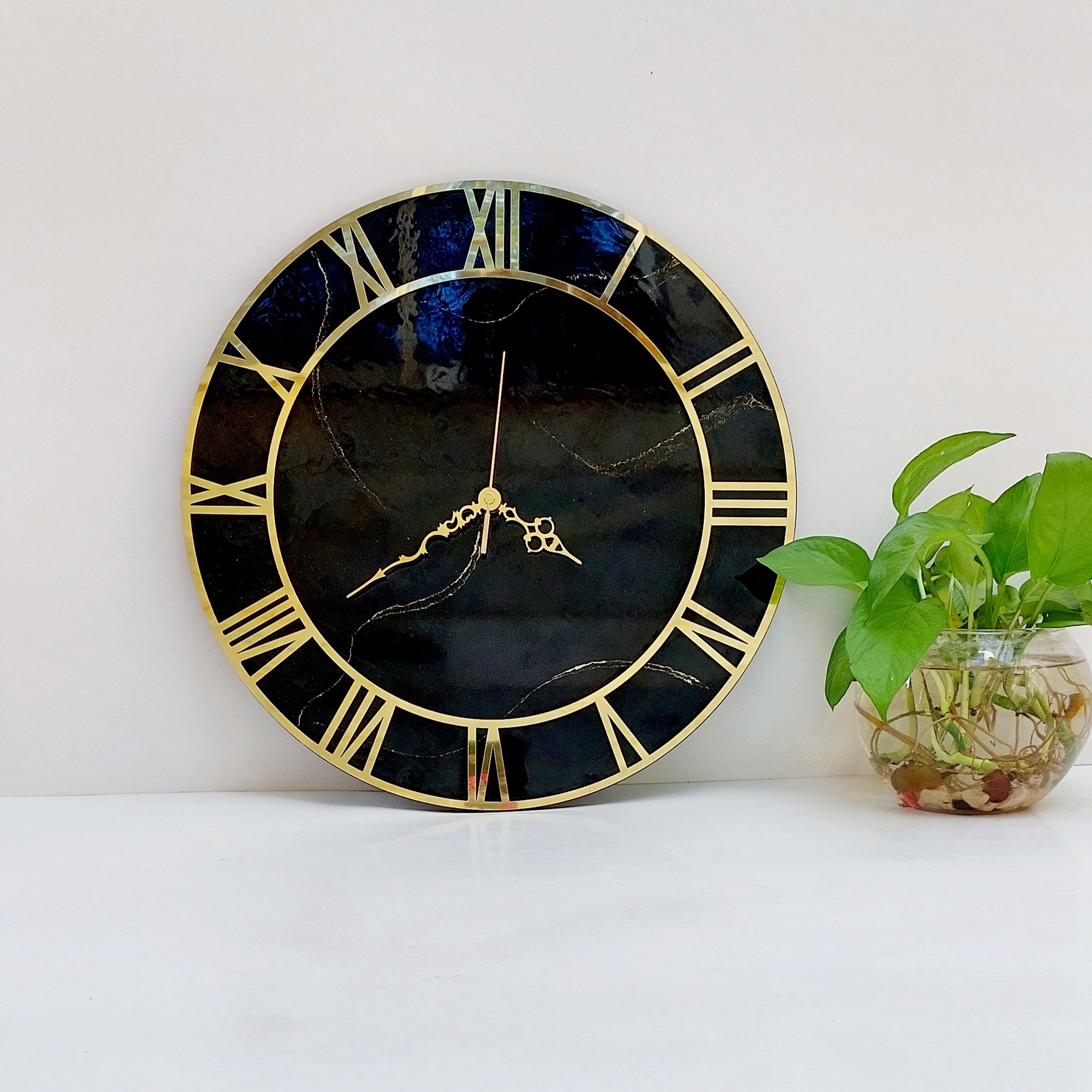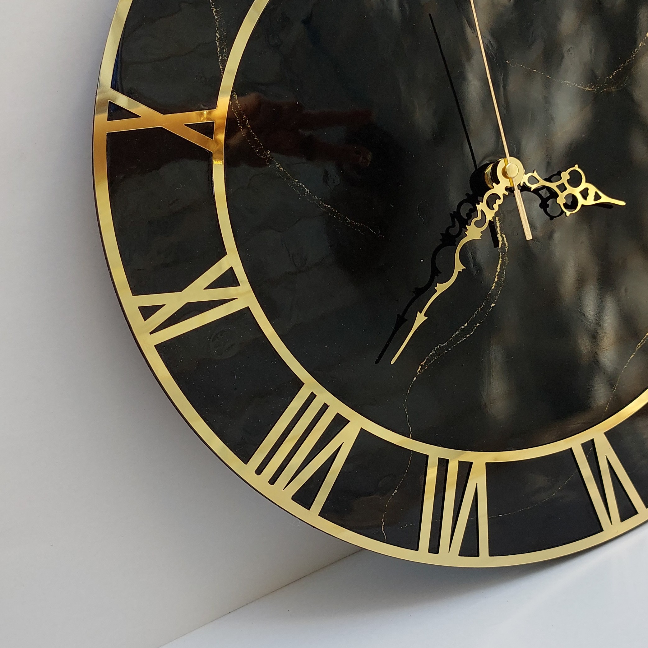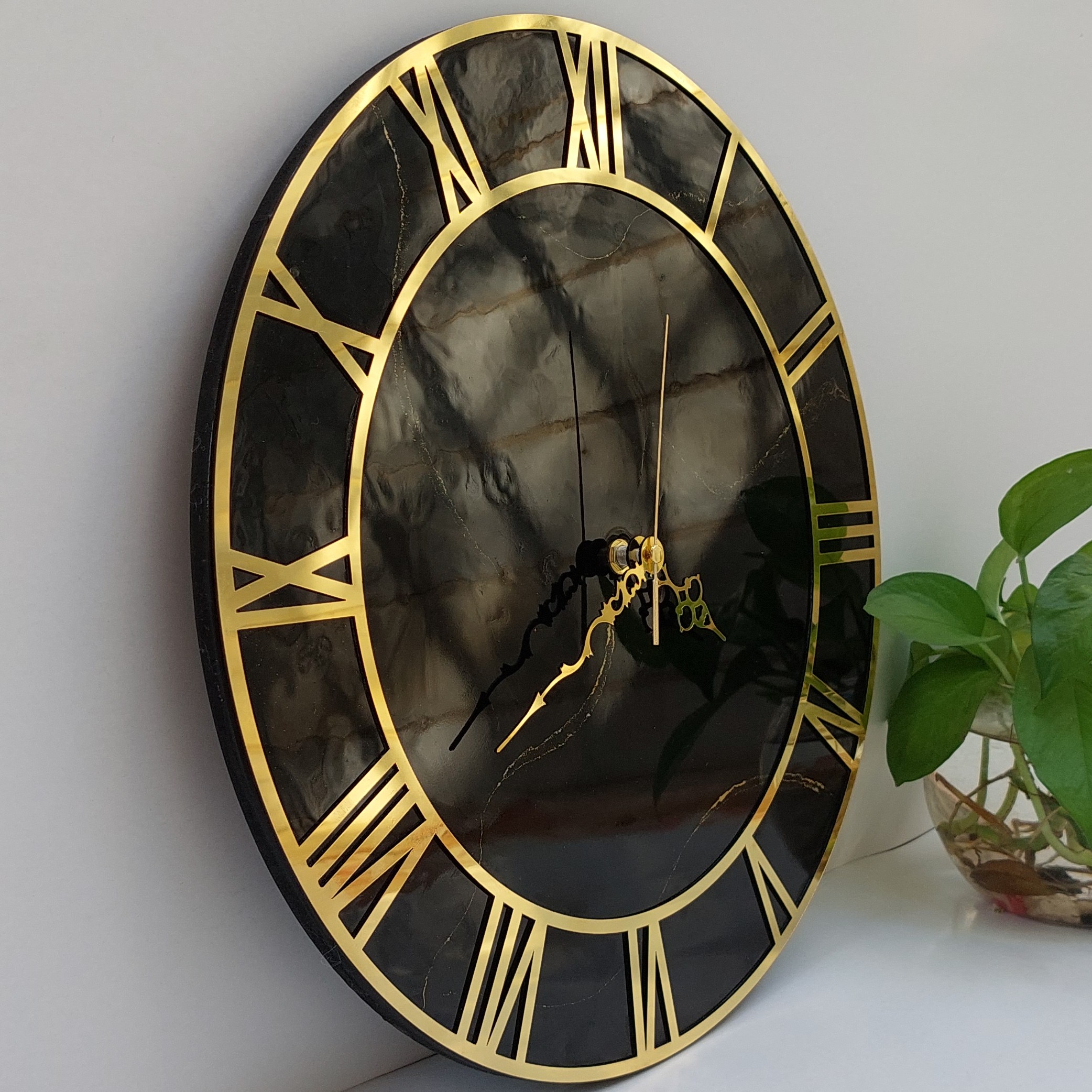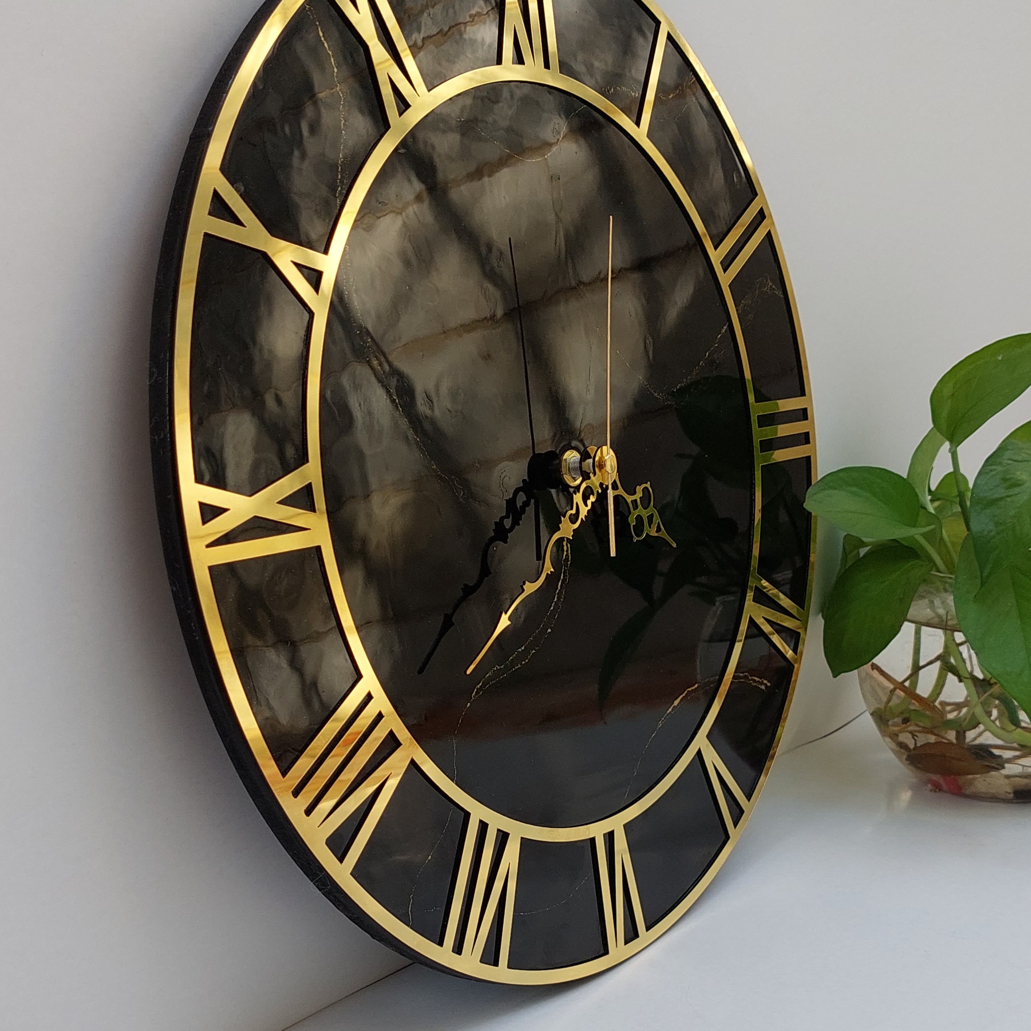 ساعت دیواری رزینی،جنس چوب ورزین،رنگ مشکی با خطوط طلایی،آیینه ای وشفاف مبلمونسرا مدل 239492