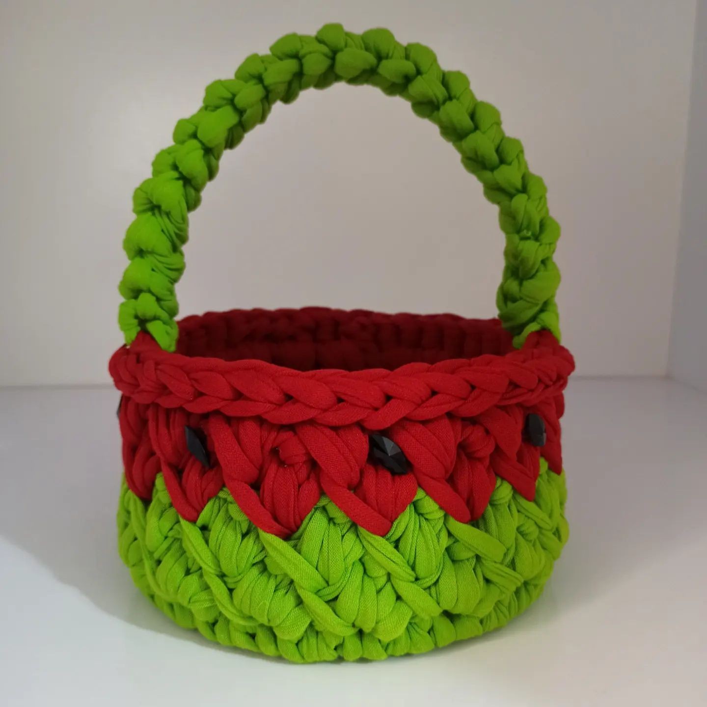 سبد تریکو با تم یلدایی، مدل هندوانه، دسته دار، جنس نخ ترکیه، جنس کفی چوبی،مدل بافت کج راه، مناسب جایگذاری انواع شکلات ،آجیل، شیرینی و...