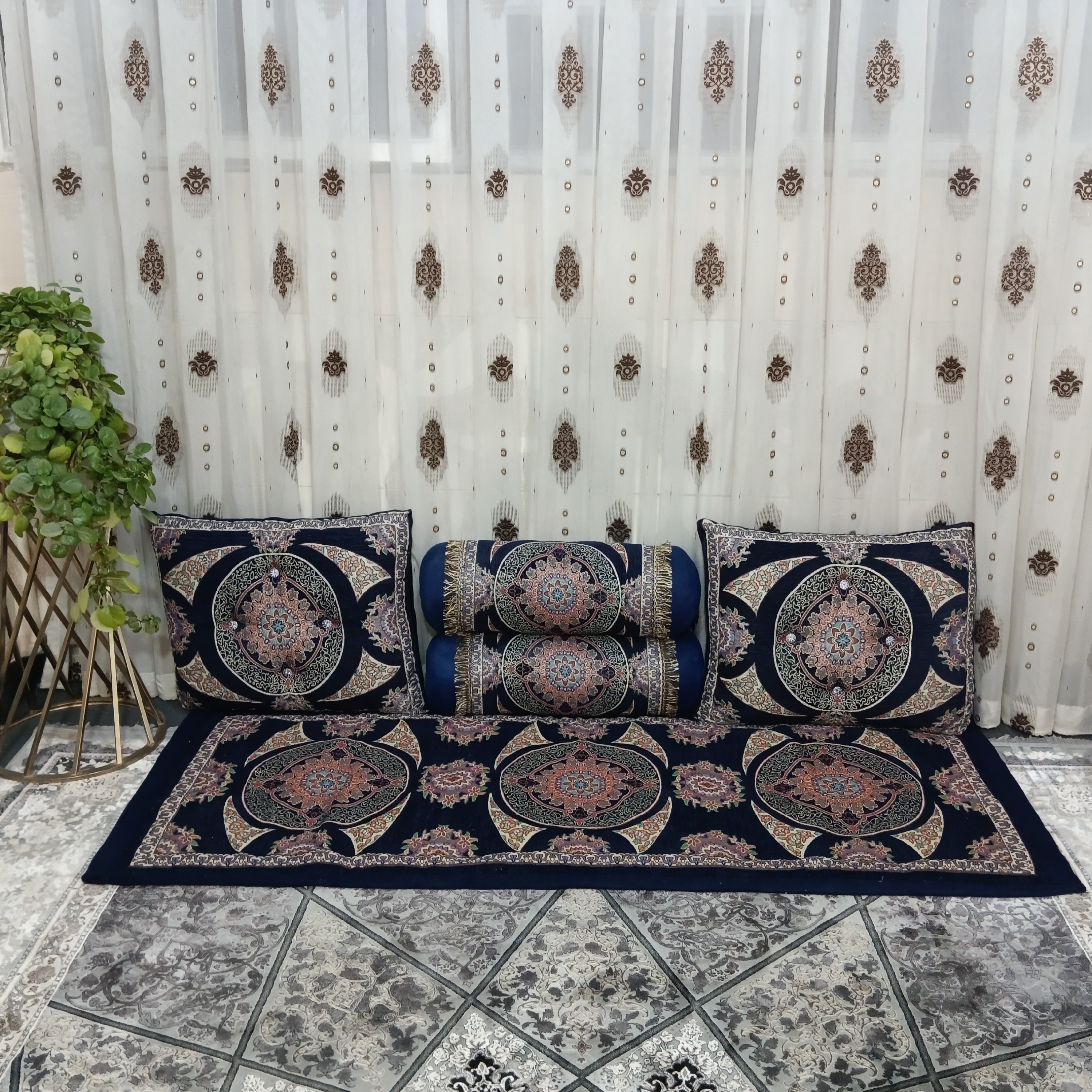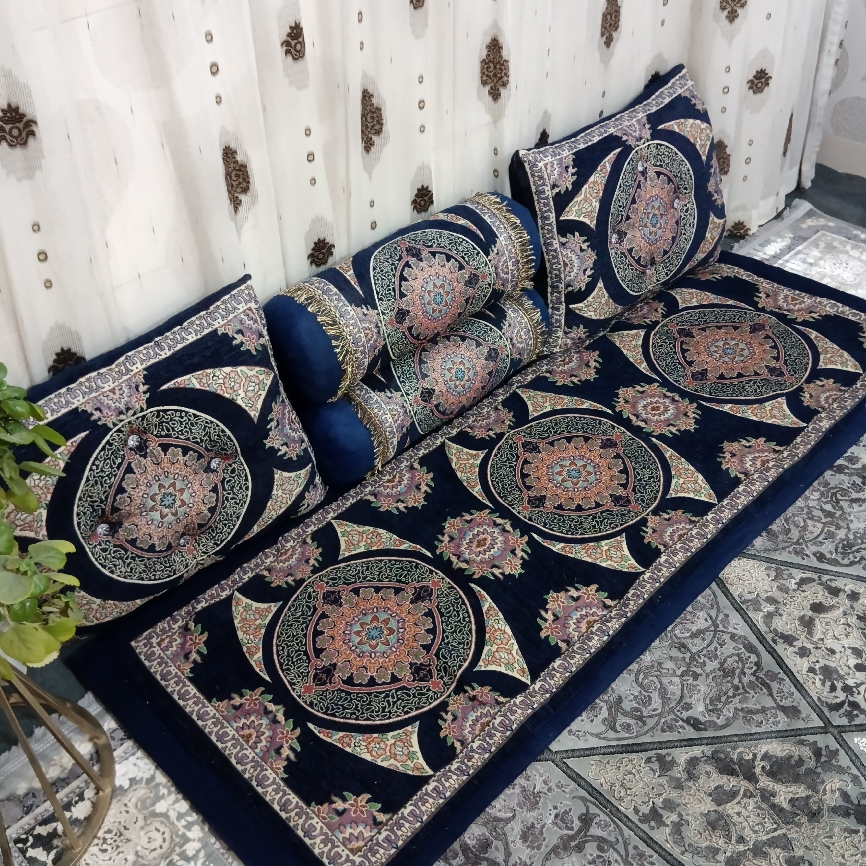 ست شاهنشین 5 تکه شامل یک عدد تشک با روی مخمل شانل و داخل تشک با یک لایه نمد صنعتی پر شده ، سایز تشک 7در 180 هست و دو عدد پشتی گرد دو عدد پشتی مربعی 🌹هرینه ارسال به عهده مشتری می باشد بصورت لطف دقت کنید دوست عزیز ارسال این محصول به دلیل سنگینی و حجم بزرگ بار توسط باربری و اتوبوس هست ، به اینصورت که باباربری ارسال میشه و وقتی رسید باربری شهرتون ، با شما تماس گرفته میشه ، شما نشریف میبرین باربری تحویل میگیرن و هزینه ارسال هم همونجا شهرتون به باربری پرداخت میکنین مبلغ دریافت شده از شما بابت هزینه گونی می باشد