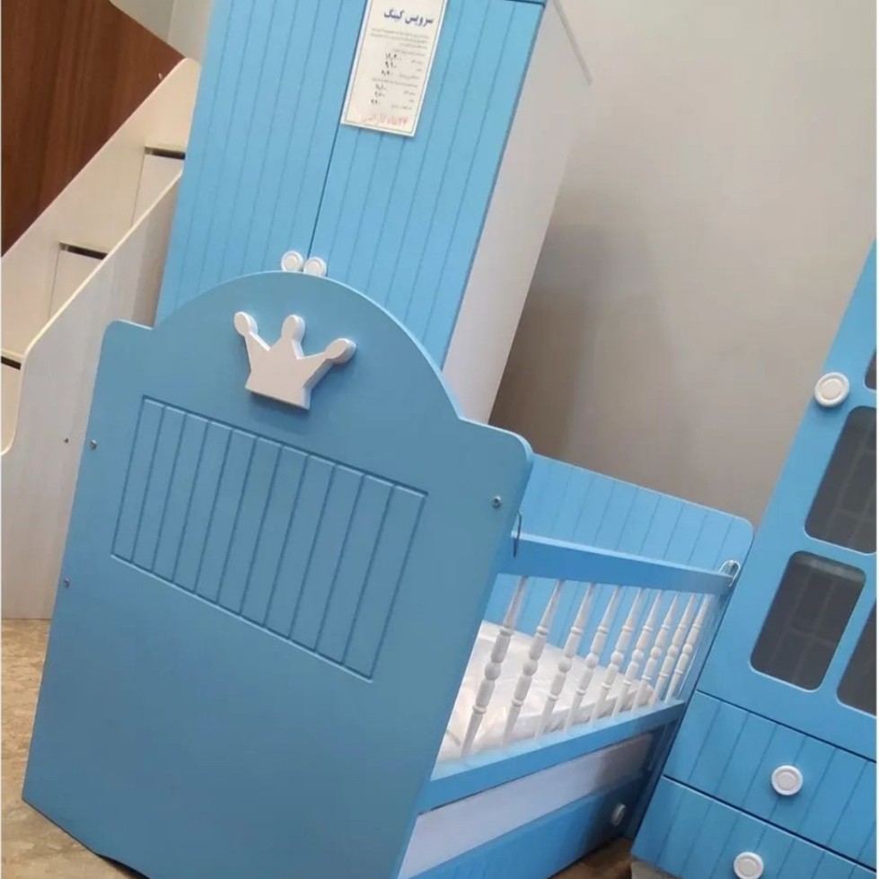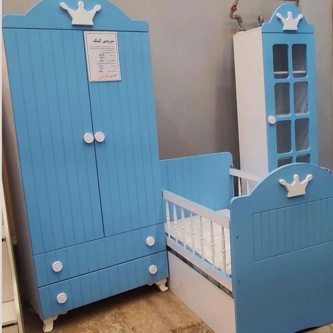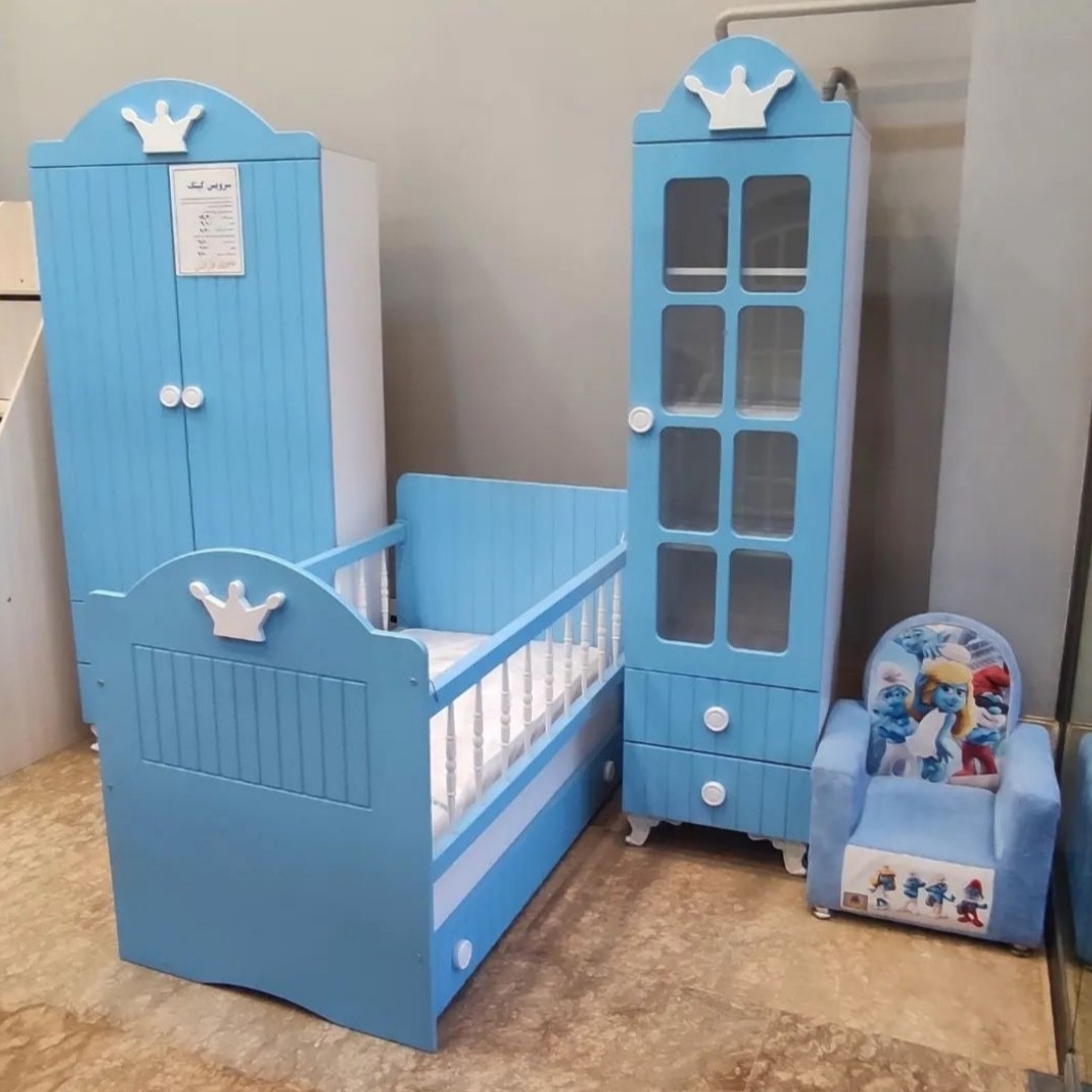 سرویس خواب کودک با تخت نوزادی و کمد دوتکه جالباسی و ویترین دارای دوسال گارانتی شرکت الیز چوب هزینه ارسال مشتری مبلمونسرا مدل 227856