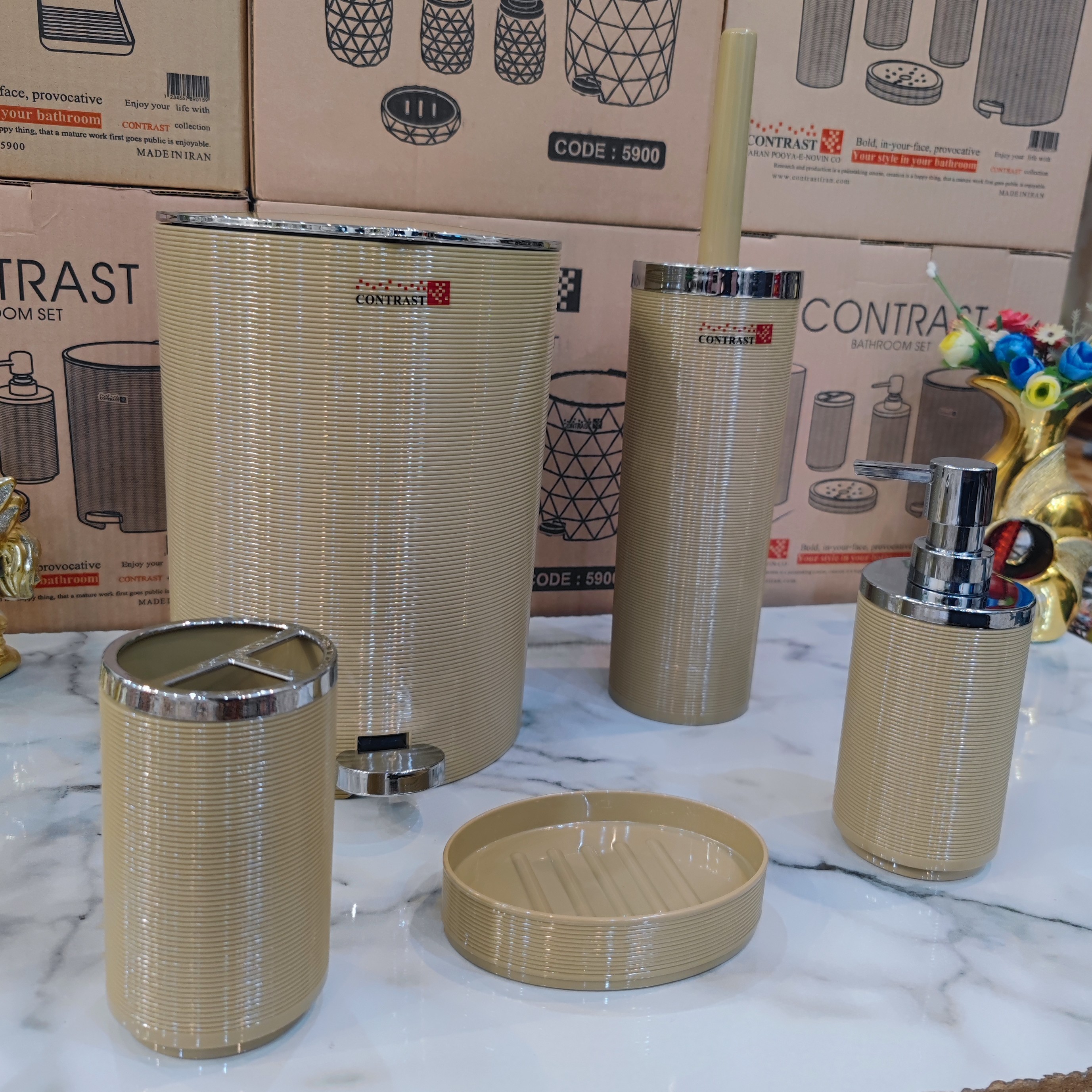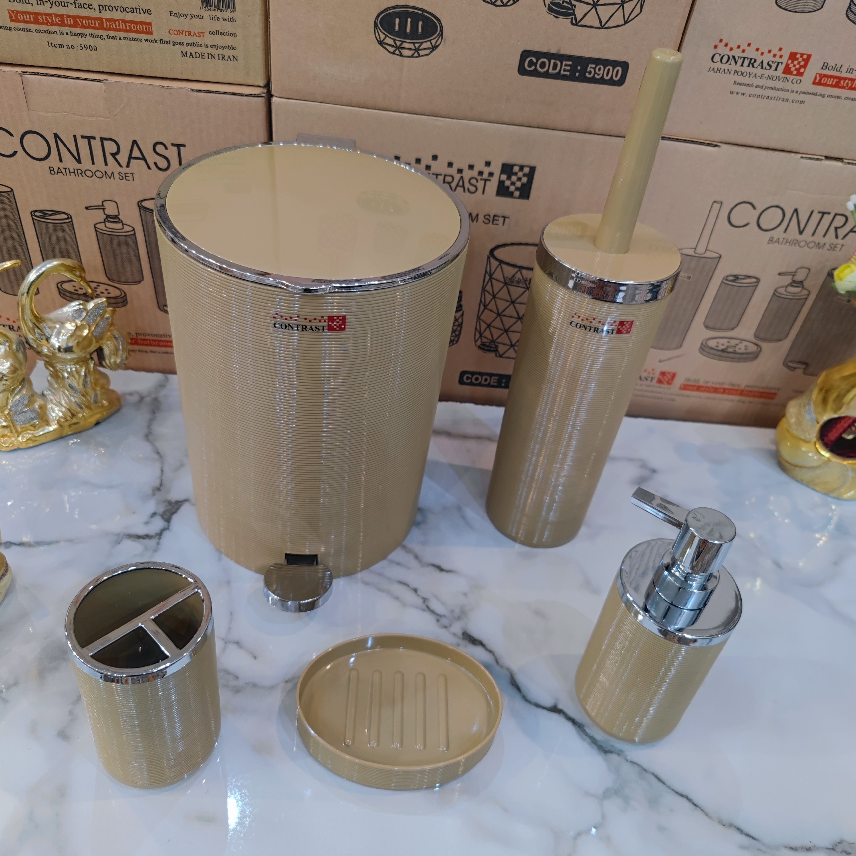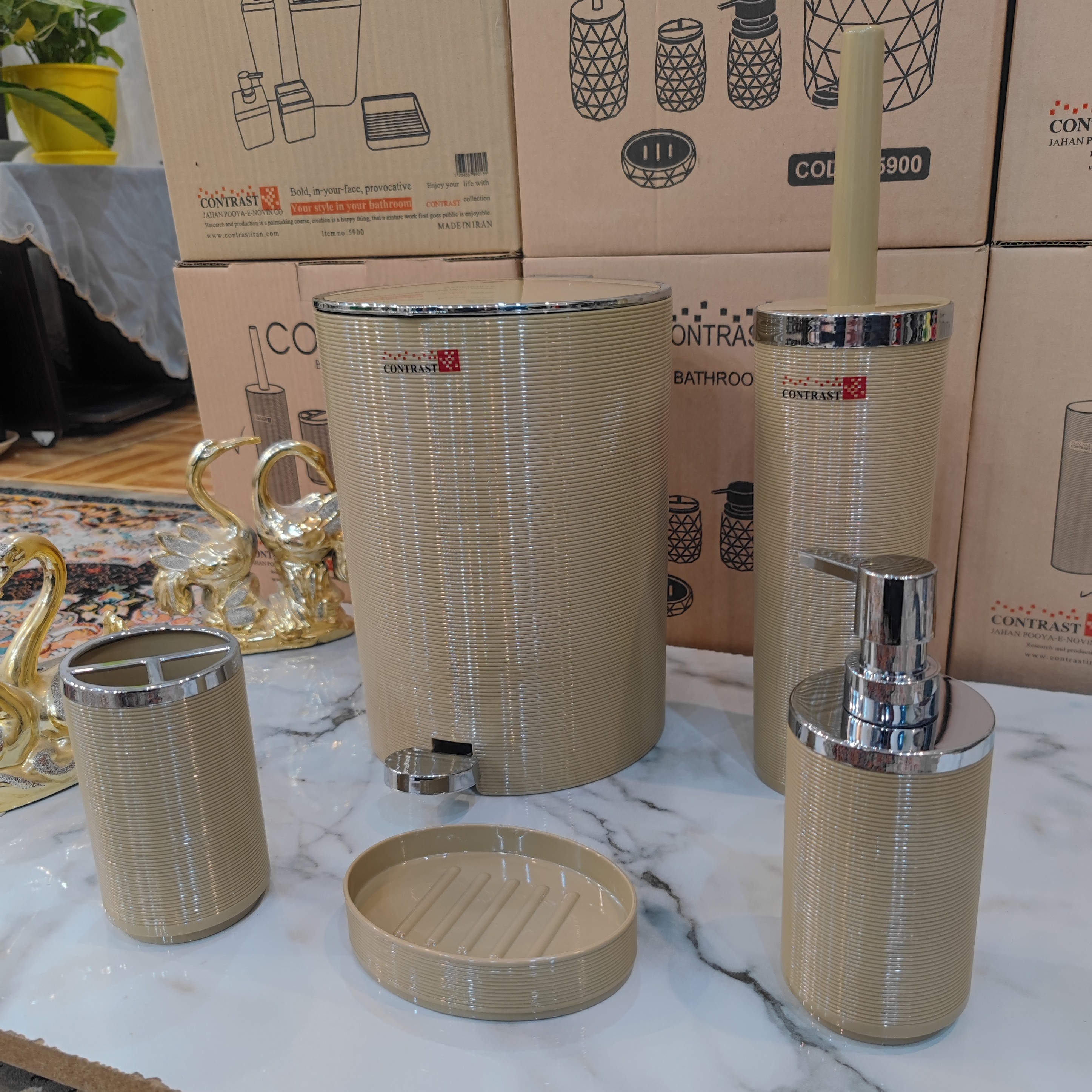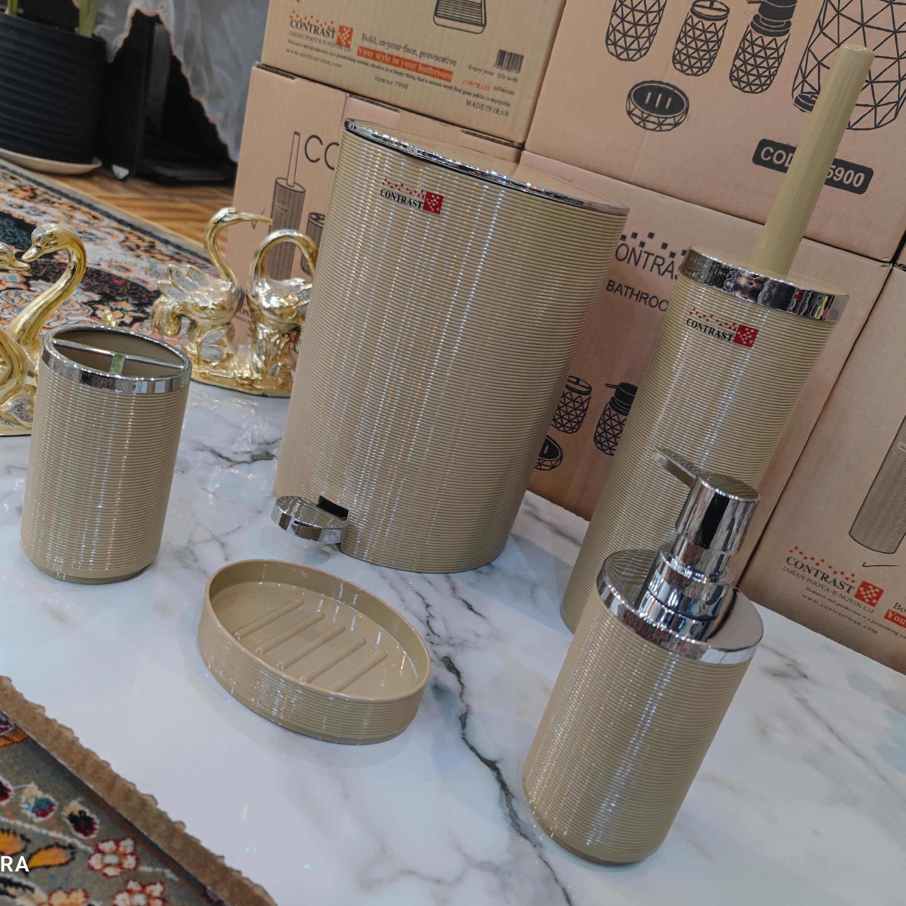 ست سرویس بهداشتی 5 پارچه طرح خط ریز برند کنتراست نو آکبند بسیار زیبا و باکیفیت و شکیل رنگ پرفروش و محبوب نسکافه ای کروم ست سرویس بهداشتی شامل : 1.سطل زباله پدال دار با درب آرامبند و تویی سطل اختصاصی 2. برس و فرچه مخصوص شستشوی سرویس بهداشتی 3.جامایع دستشویی با سرپمپ باکیفیت و تضمینی 4. جامسواک و جای خمیر دندان 5. جای صابون جامد تضمین کیفیت ساخت بسیار عالی و جنس عالی ارسال سریع و رایگان به تمام نقاط کشور برای خریداران عزیز