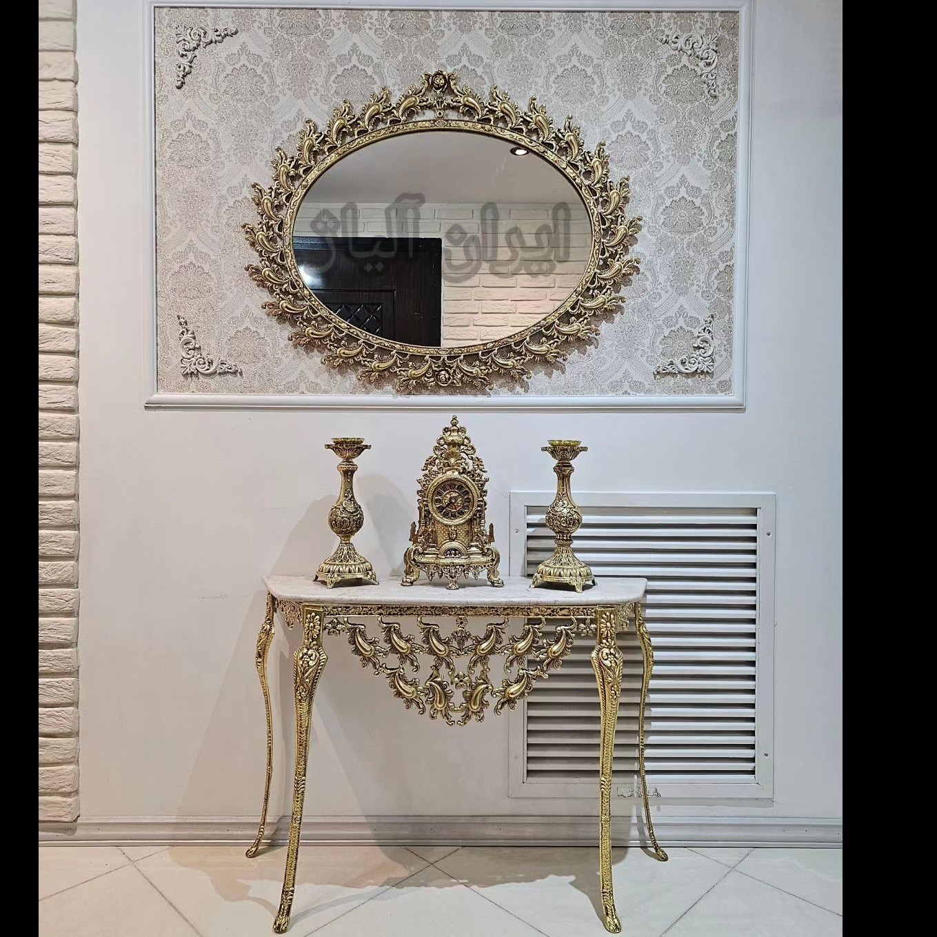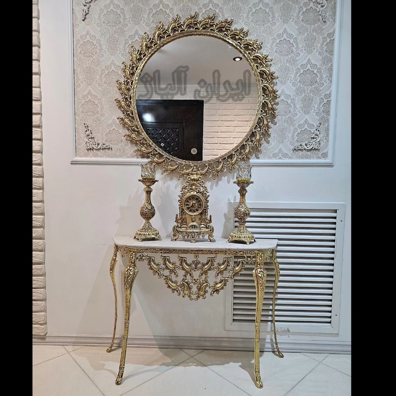 آینه کنسول همراه با ساعت و شمعدون طرح گرد و بیضی جنس آلیاژ آلومینیوم آبکاری برنج رنگ ثابت با ده سال ضمانت آبکاری و کارت گارانتی قابل سفارش در سایز های مختلف با آبکاری نقرهای طلایی انتیک