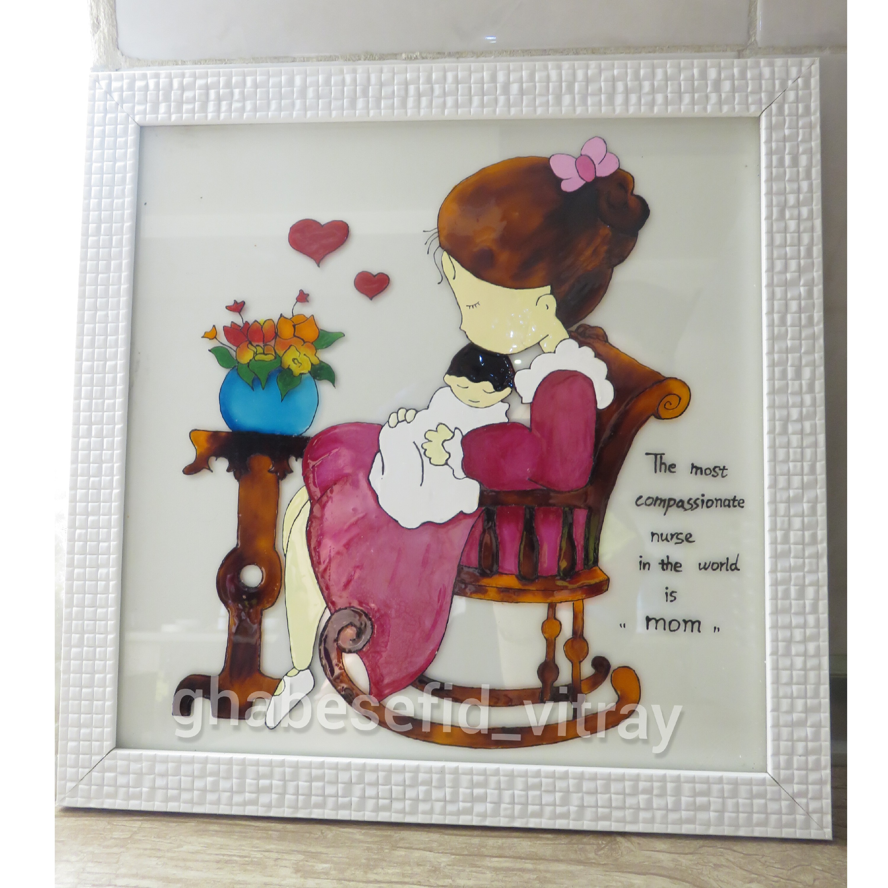 تابلو ویترای مادر و کودک کارشده با رنگهای با کیفیت باران کاملا کار دست کار باکیفیت و تمیز امکان انتخاب رنگ قاب مشکی یا سفید این کار کاملا سفارشی مختص شما آماده میشود.