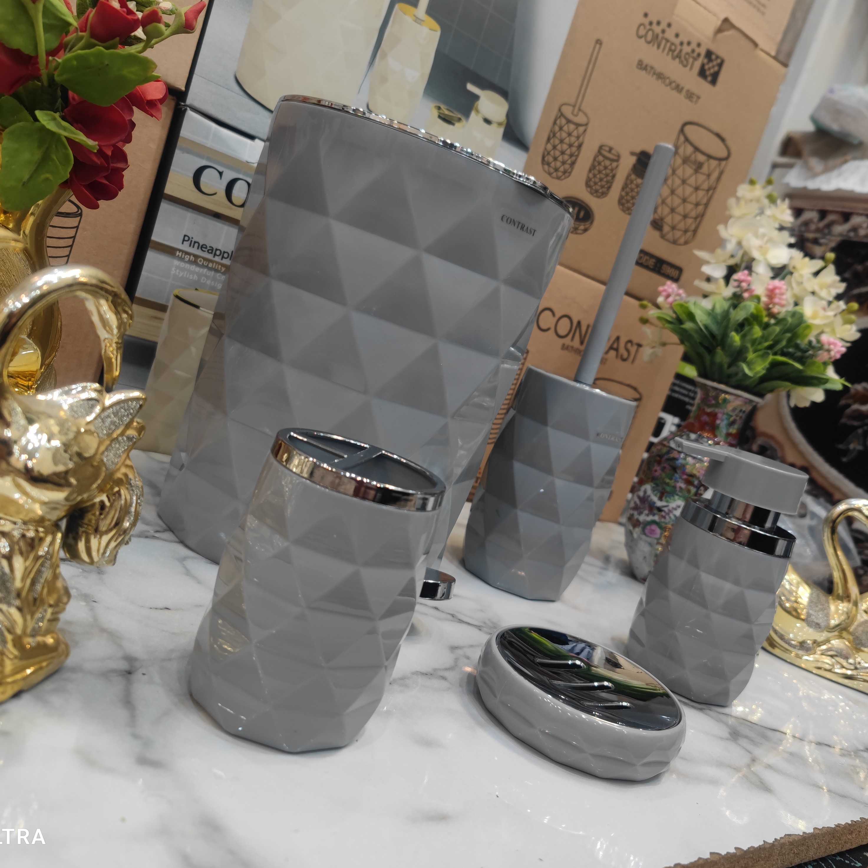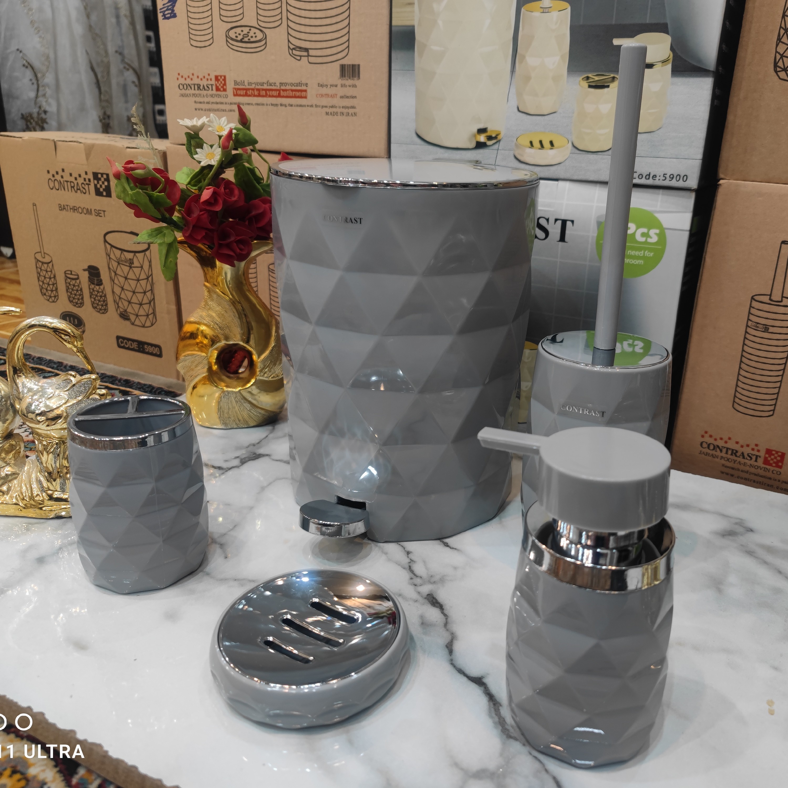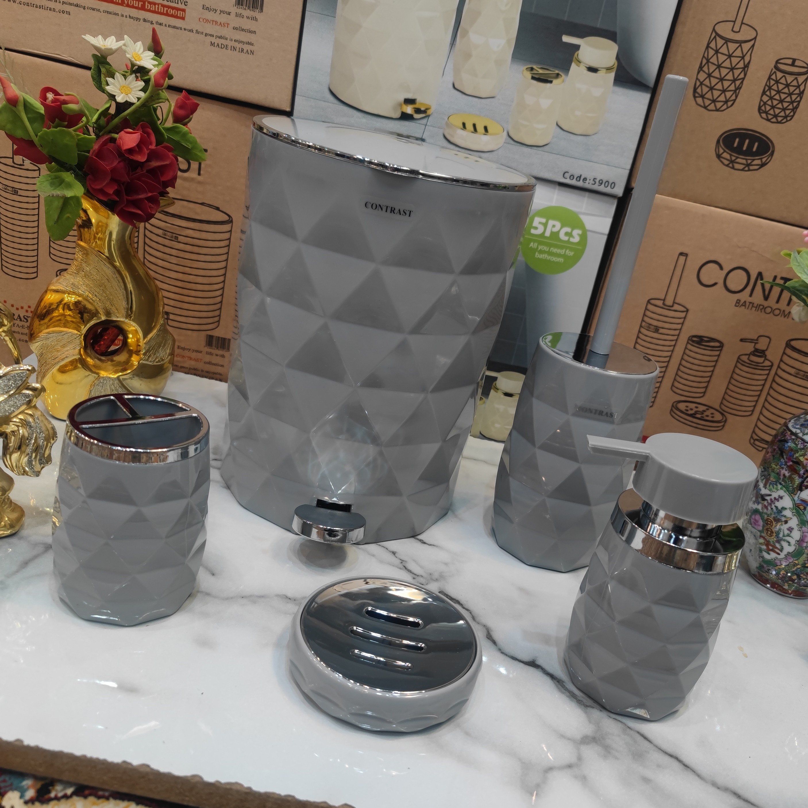 ست 5پارچه سرویس بهداشتی طرح شکیل آناناسی برند کنتراست رنگ زیبا و جذاب و پرطرفدار طوسی روشن کروم نو آکبند مبلمونسرا مدل 266216