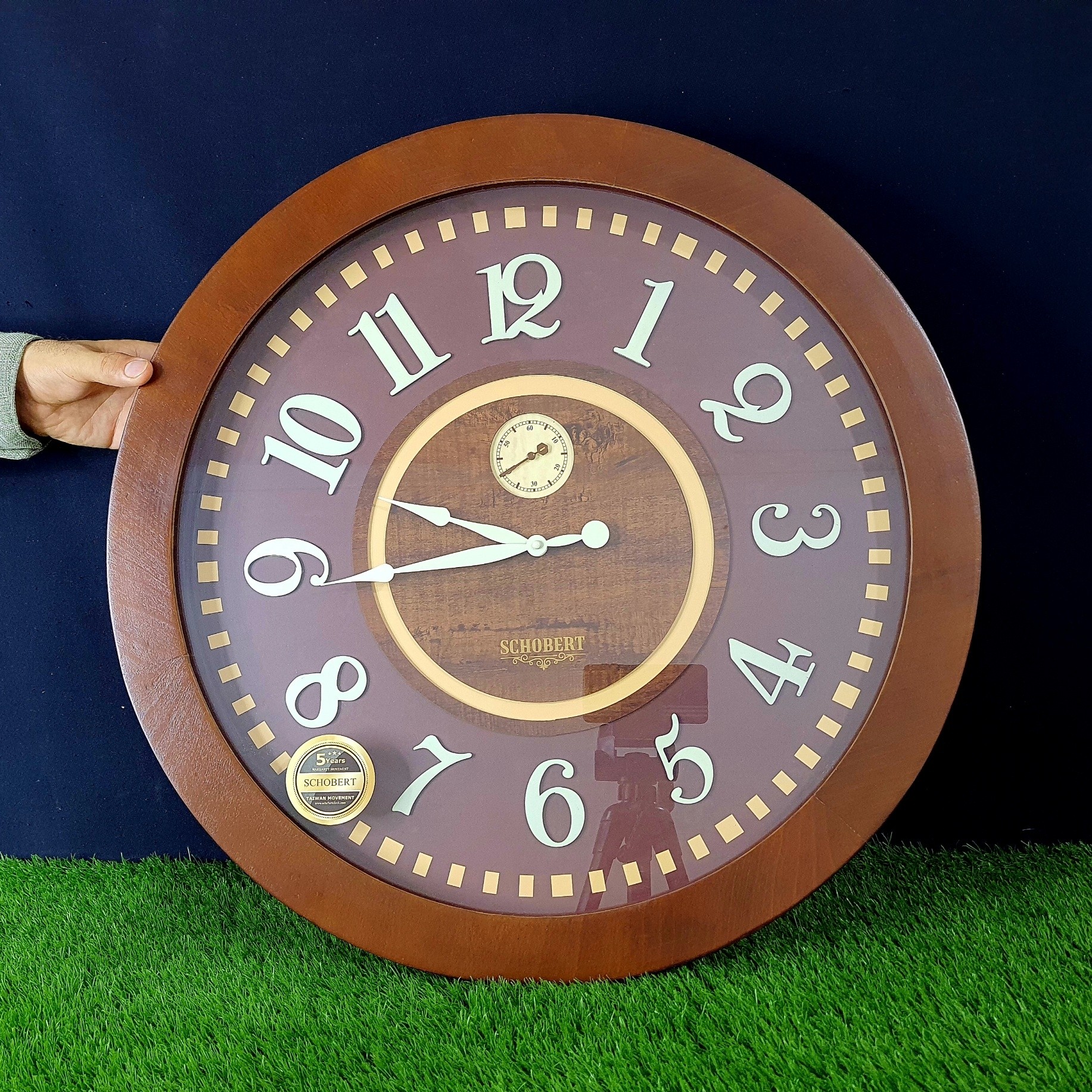 این ساعت ساخت شرکت شوبرت میباشد که تماماً ساخته شده از چوب و بدون صدا همراه با مصرف کم باتری میباشد که یک موتور نشان دهنده دقیقه و ساعت و دیگری برای نمایش ثانیه میباشد. اختلاف رنگ صفحه و اعداد برجسته با عقربه باعث شده ساعت از فاصله دور هم خوانا باشد.. ابعاد 58 سانت وزن 4 کیلوگرم جنس قاب چوب قطر صفحه 58 سانتی متر با ضمانت 5 ساله