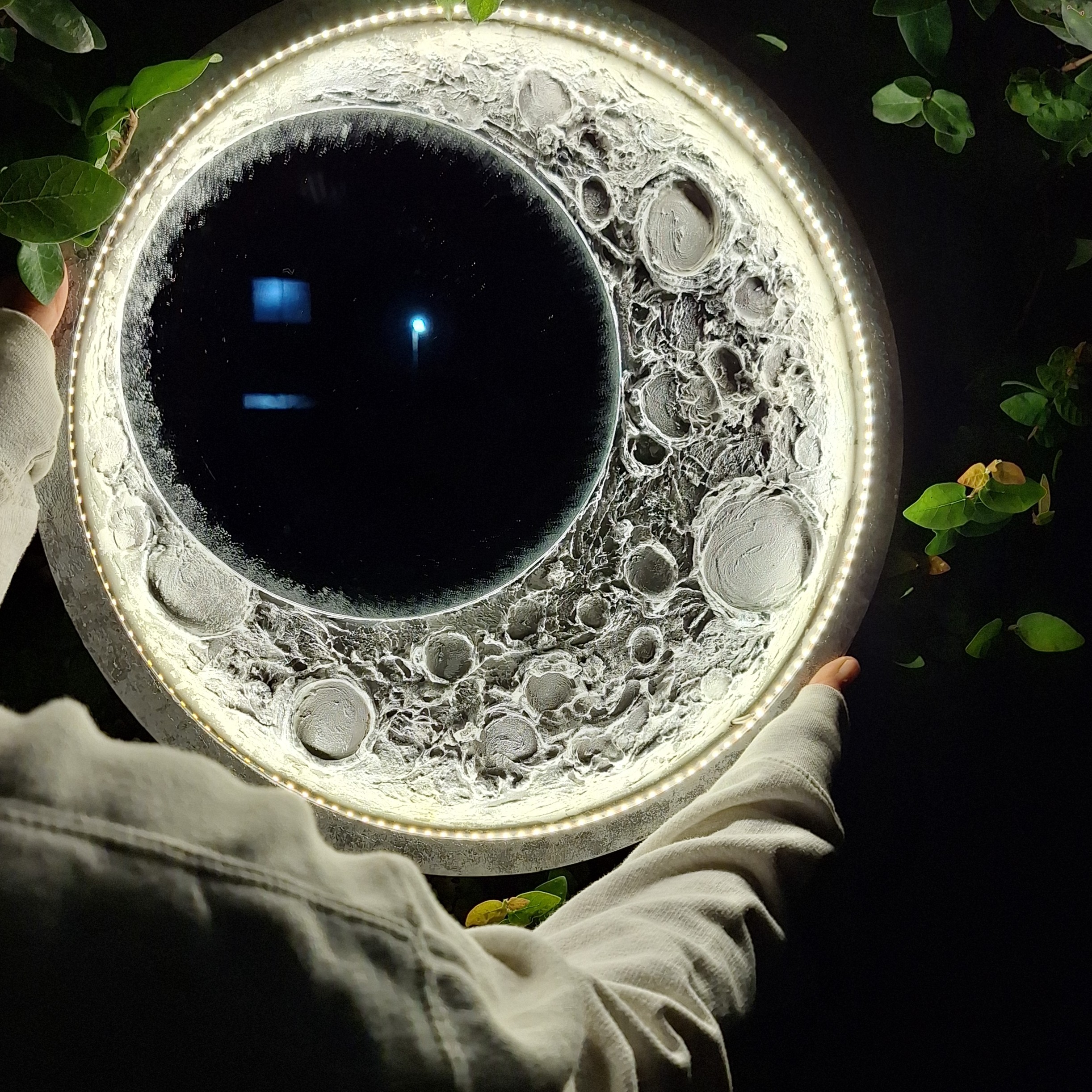 تابلو ماه که ترند شده برجسته و زیبا نورپردازی عالی با ادابتور با کیفیت و عالی سیم بلند گیره اویز دارد کاملا دستساز شیک و متفاوت قابل سفارش در سایز های مختلف