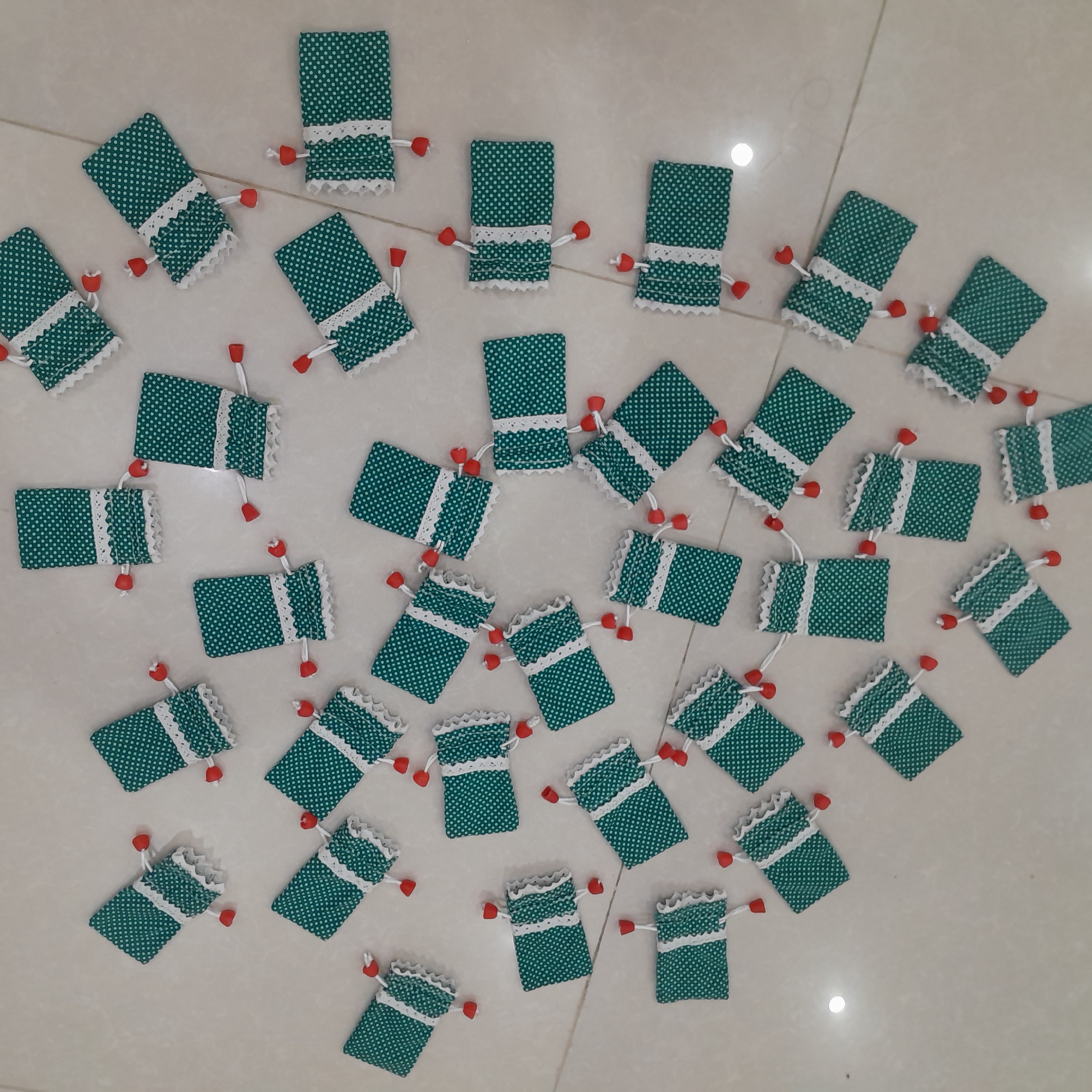 کیسه کوچک پارچه ای تزئین شده هر دو طرف تور کار شده به همراه بند دوطرفه که کامل جمع میشه میتونید برای هدیه دادن وگذاشتم چیزهای کوچک با ارزش از این کیسه ها استفاده کنید ارتفاع 10 و عرض 6 سانت قیمت کل 40 عدد 720000تومان