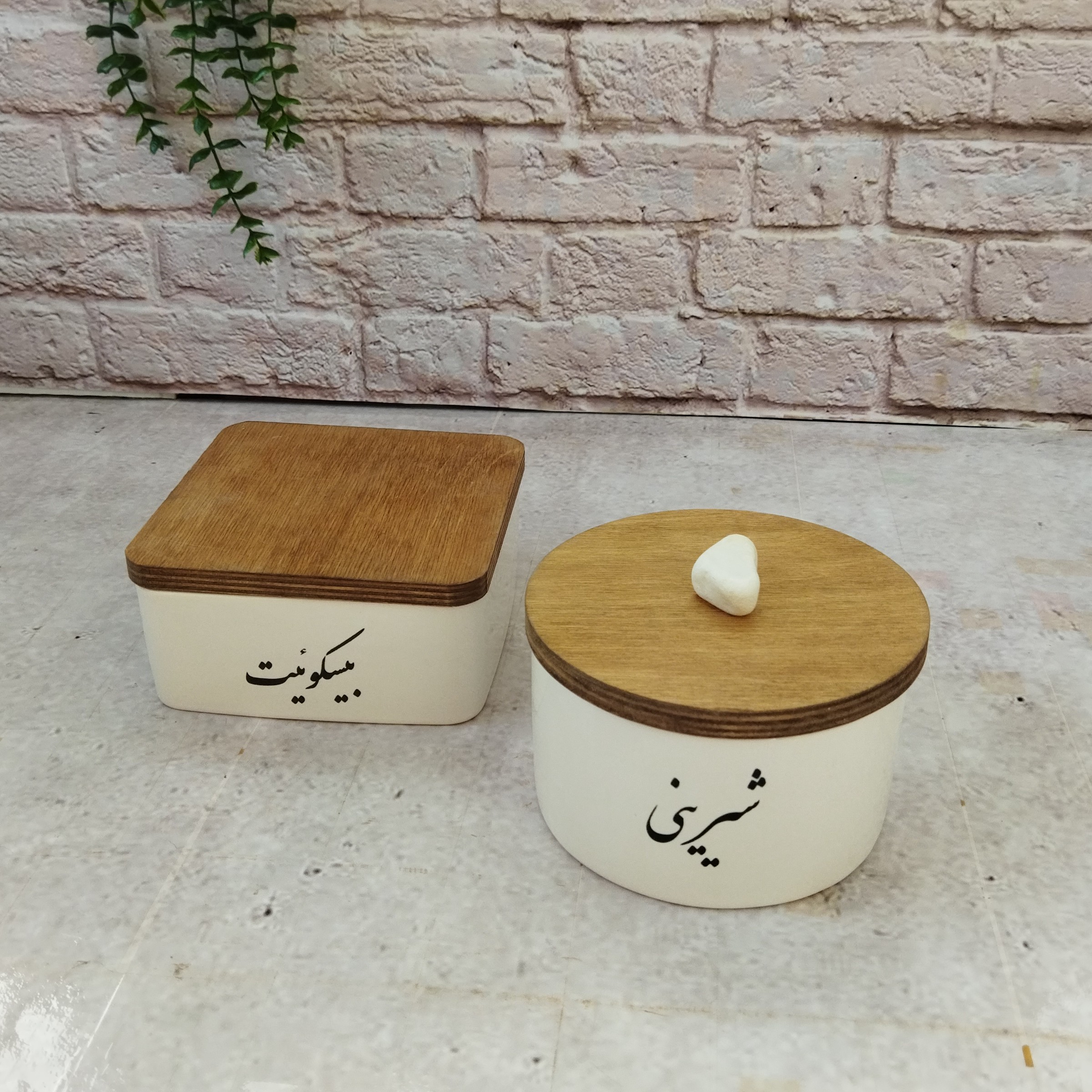 ظرف کوکی وشیرینی مناسب برای پذیرایی خاص باظرف خاص بادامون حس قشنگتری ب اشپزخونتون بدید درچوبی بدنه سرامیک