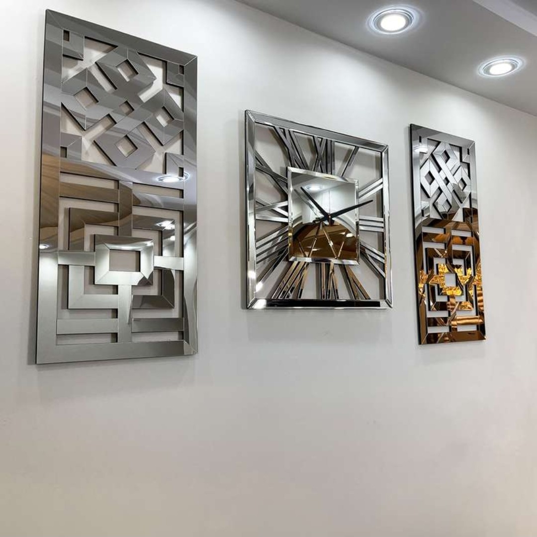 تولید کننده انواع ساعتهای دیواری طرح های مختلف این ساعت سه تیکه میباشد تمام آینه کاری شده است سایز سه تیکه باهم یک متر در 60 میباشد سایز قابل تغییر است ارسال رایگان موتور آرام گرد