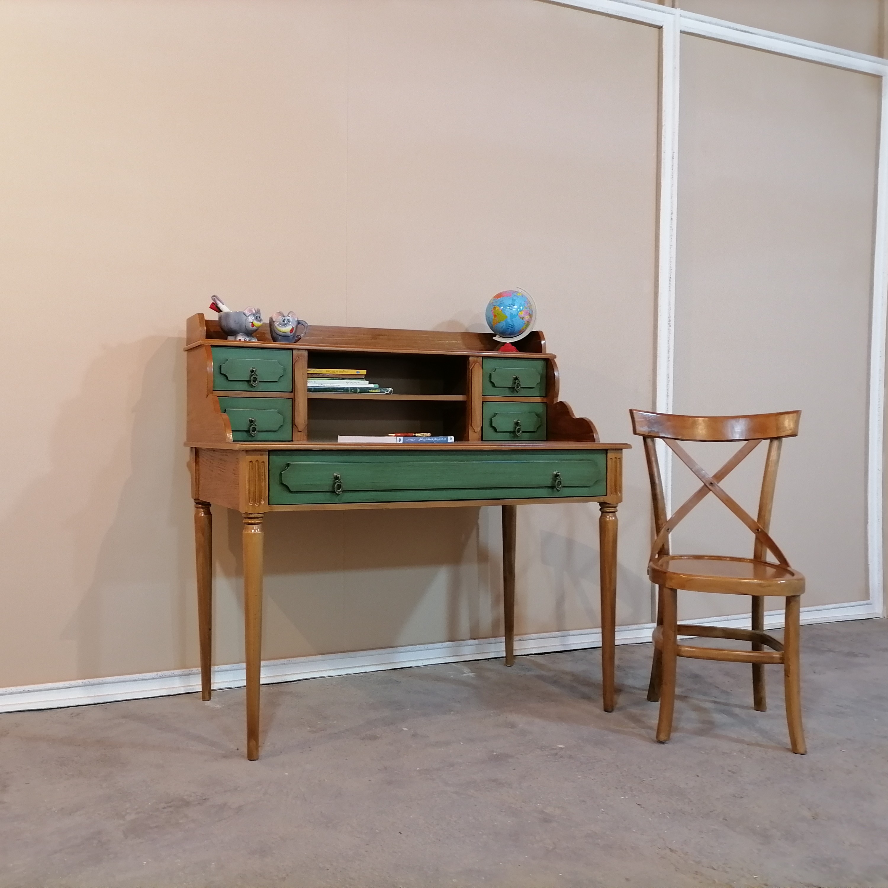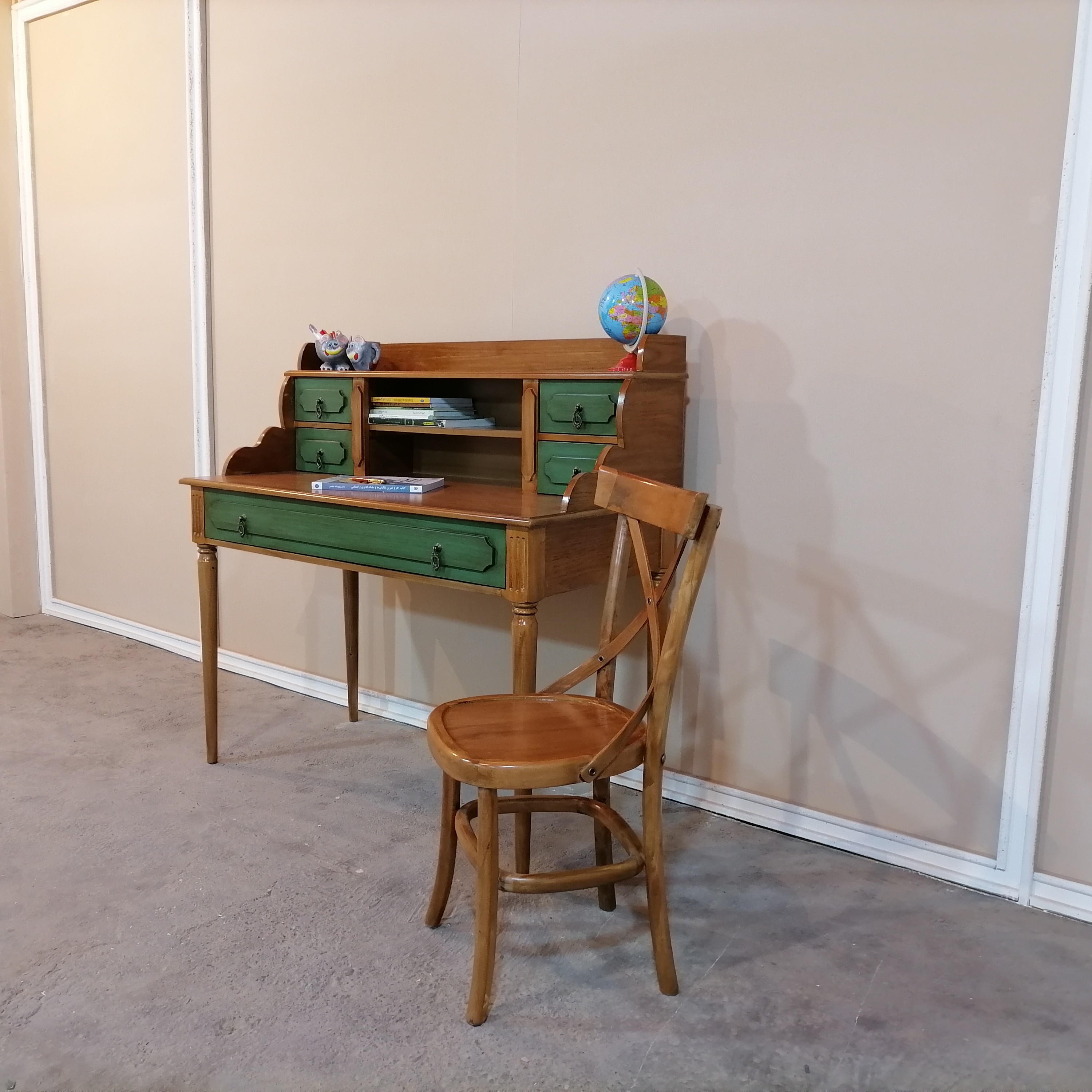 میزتحریر کلاسیک جدید و صندلی رنگ سبز قهوهای طول 120 ✍🏻📚 طرح عالیه این میزتحریر به کنار فقط ترکیب رنگ میزتحریر رو ببین و صفا کن😍 ترکیب رنگ جذاب سبز پتینه و قهوه ای که البته هر رنگی که بخوای میتونی سفارش بدی 🌈 متریال 🪵 پایه ها چوب روس، بدنه ام دی اف روکش چوب بلوط. ابعاد میزتحریر : 120/60/110 صندلی ضربدری چوب توسکا🪑 ارسال به سراسر کشور داریم 🚛 هزینه ارسال به عهده مشتری و به صورت میباشد .