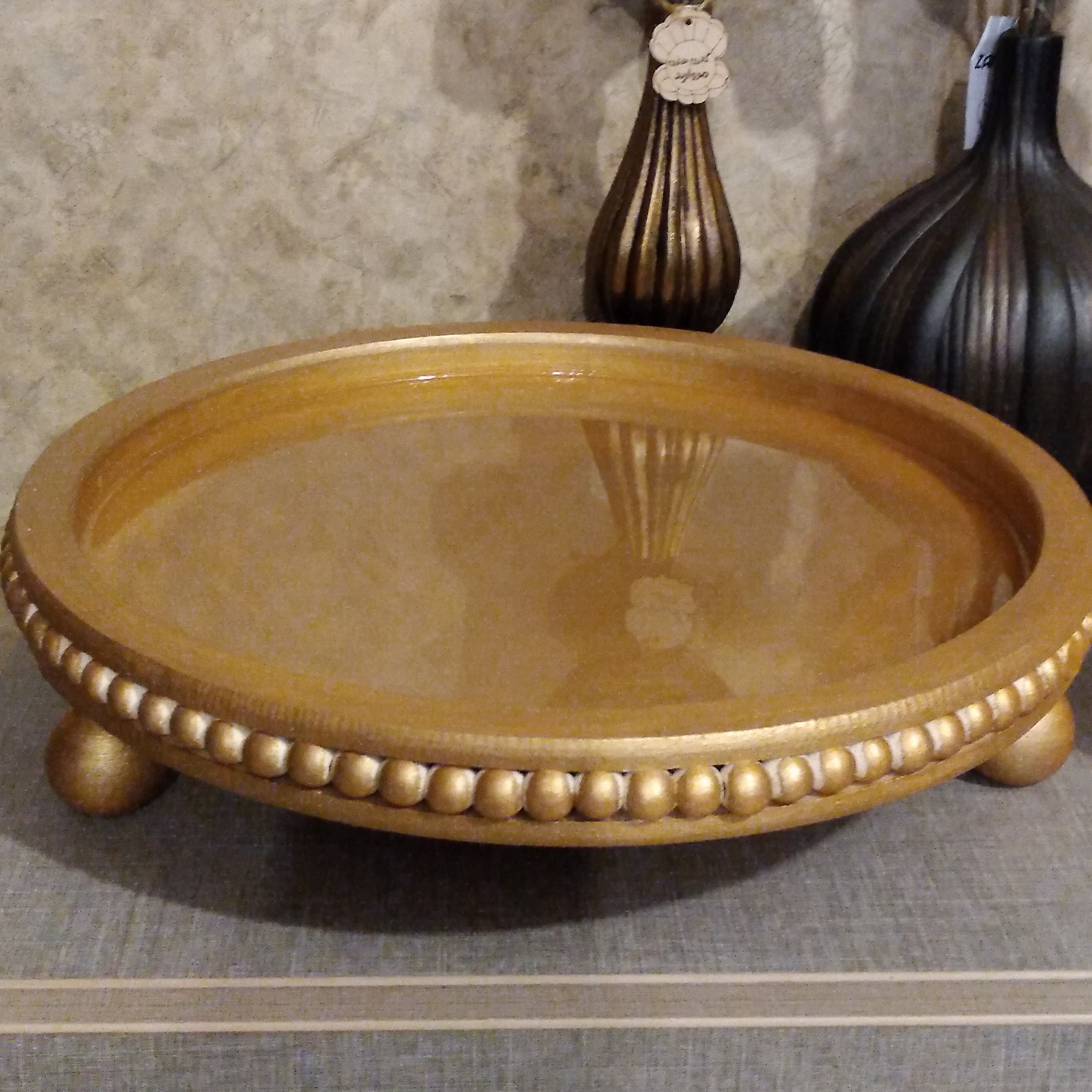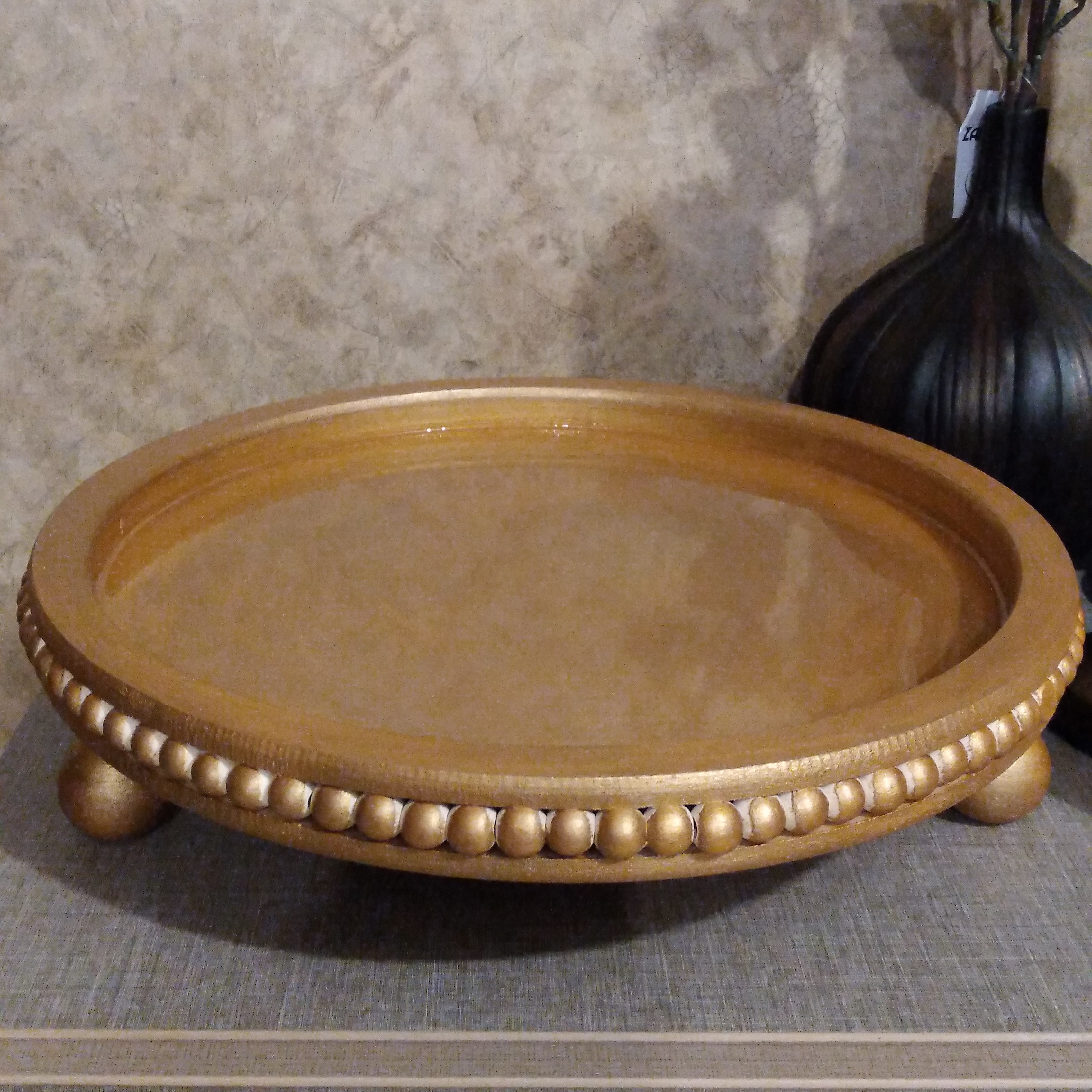 سینی چوبی مهره دارقطر سی و پنج رزین کاری شده و ورق طلا خورده بسیار شیک و کاربردی قایل اجرا در رنگ و س مبلمونسرا مدل 274861