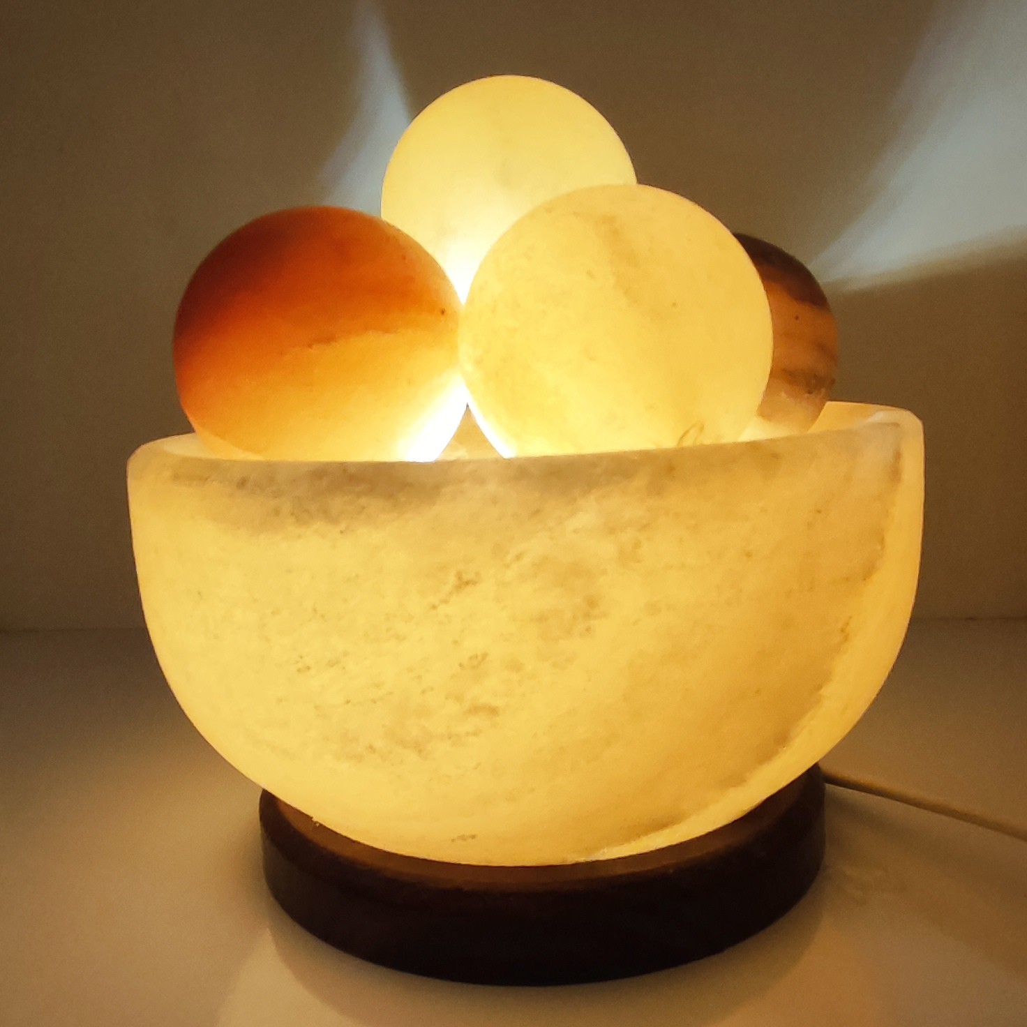 آباژور کاسه ای از جنس سنگ نمک به همراه قلوه سنگهای نمکی باپایه چوبی و سیم کلیددار و لامپ اس ام دی