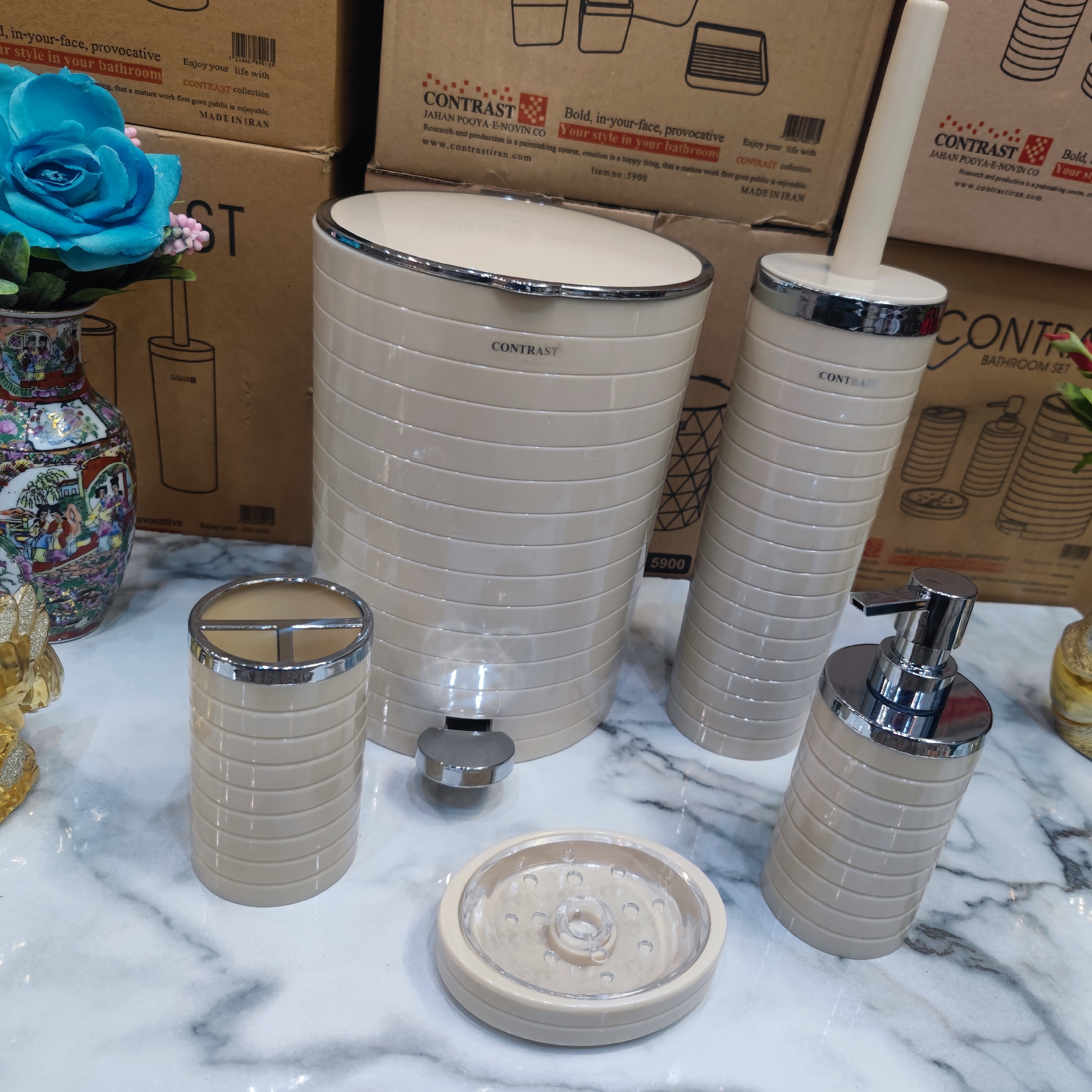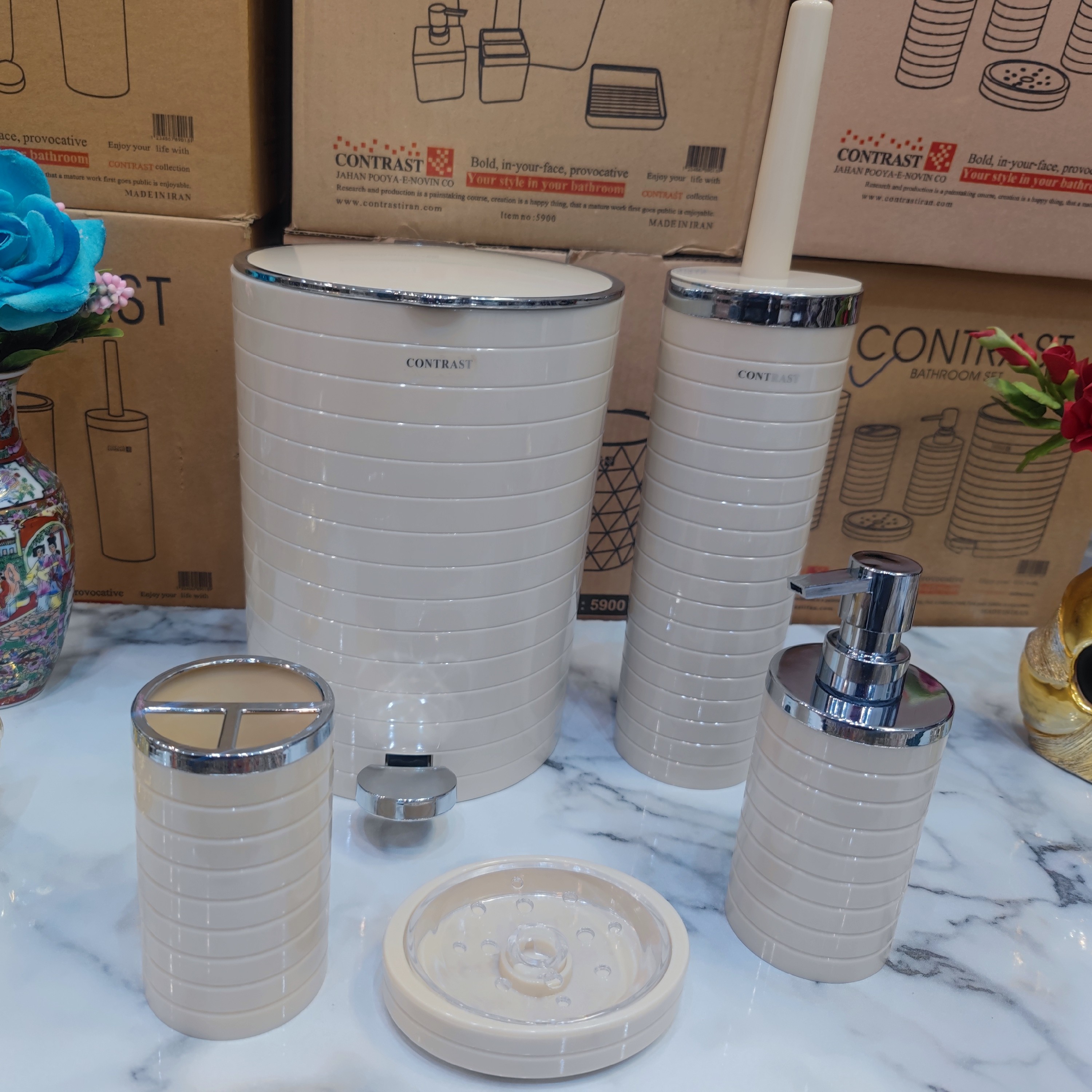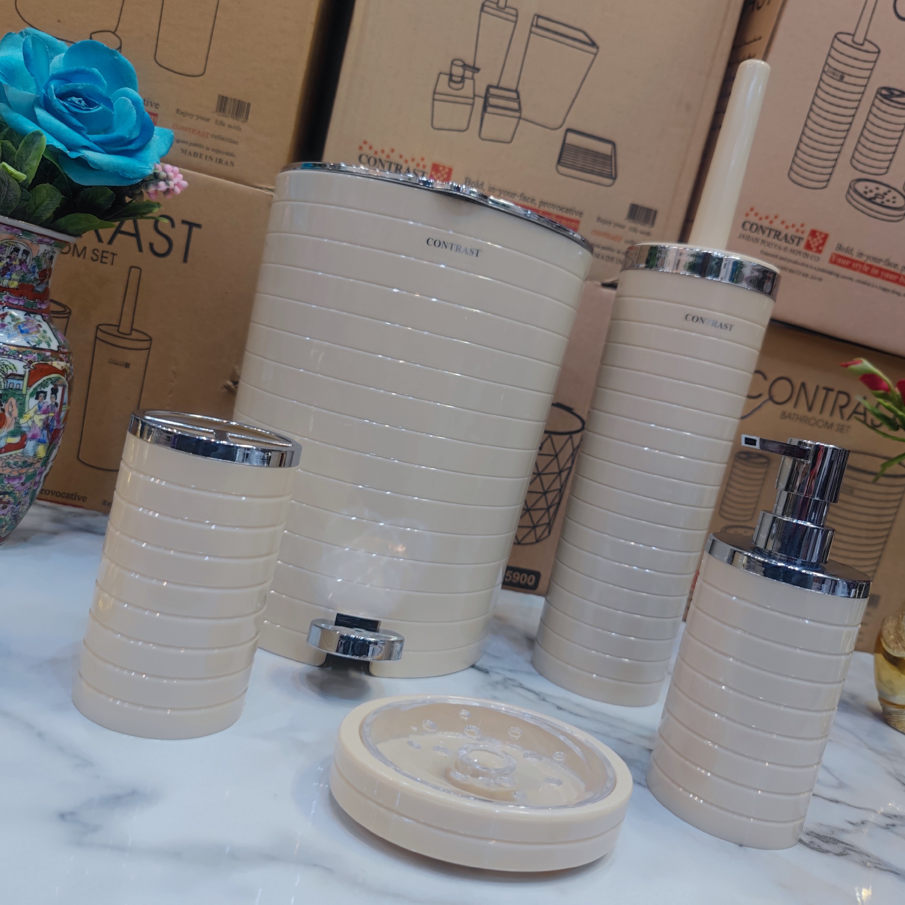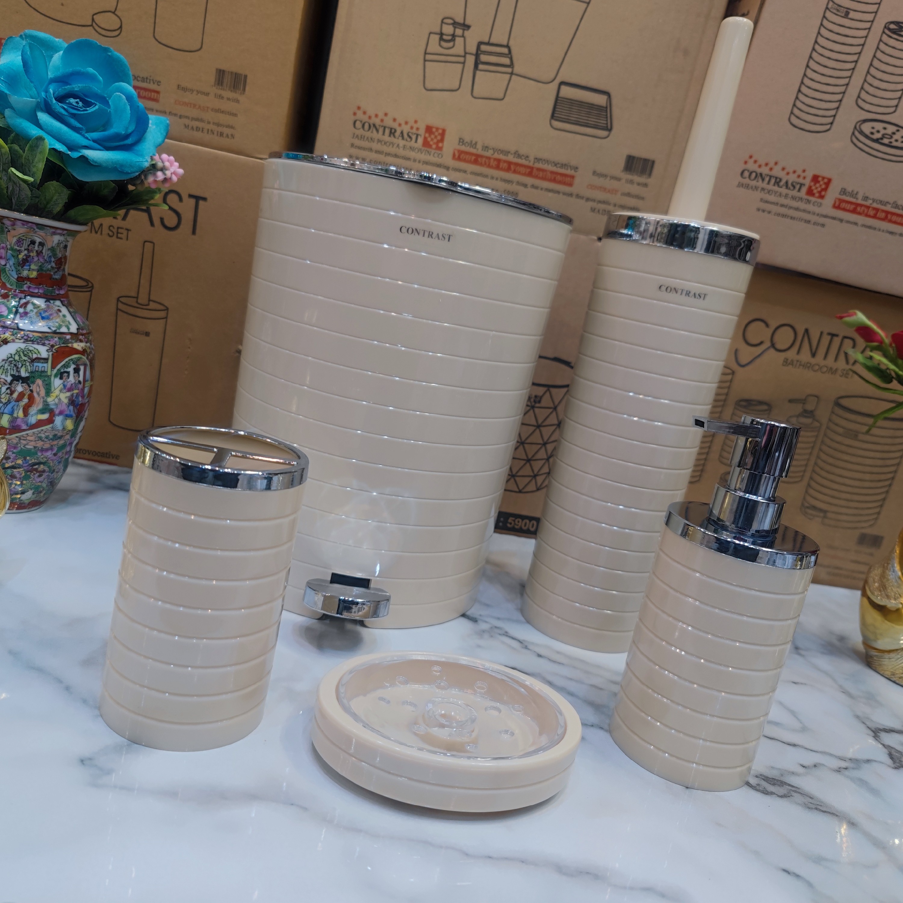 ست سرویس بهداشتی 5 پارچه طرح خط درشت برند کنتراست رنگ بسیار زیبا و پرطرفدار وانیلی کروم نو آکبند به همراه ارسال سریع مبلمونسرا مدل 266223