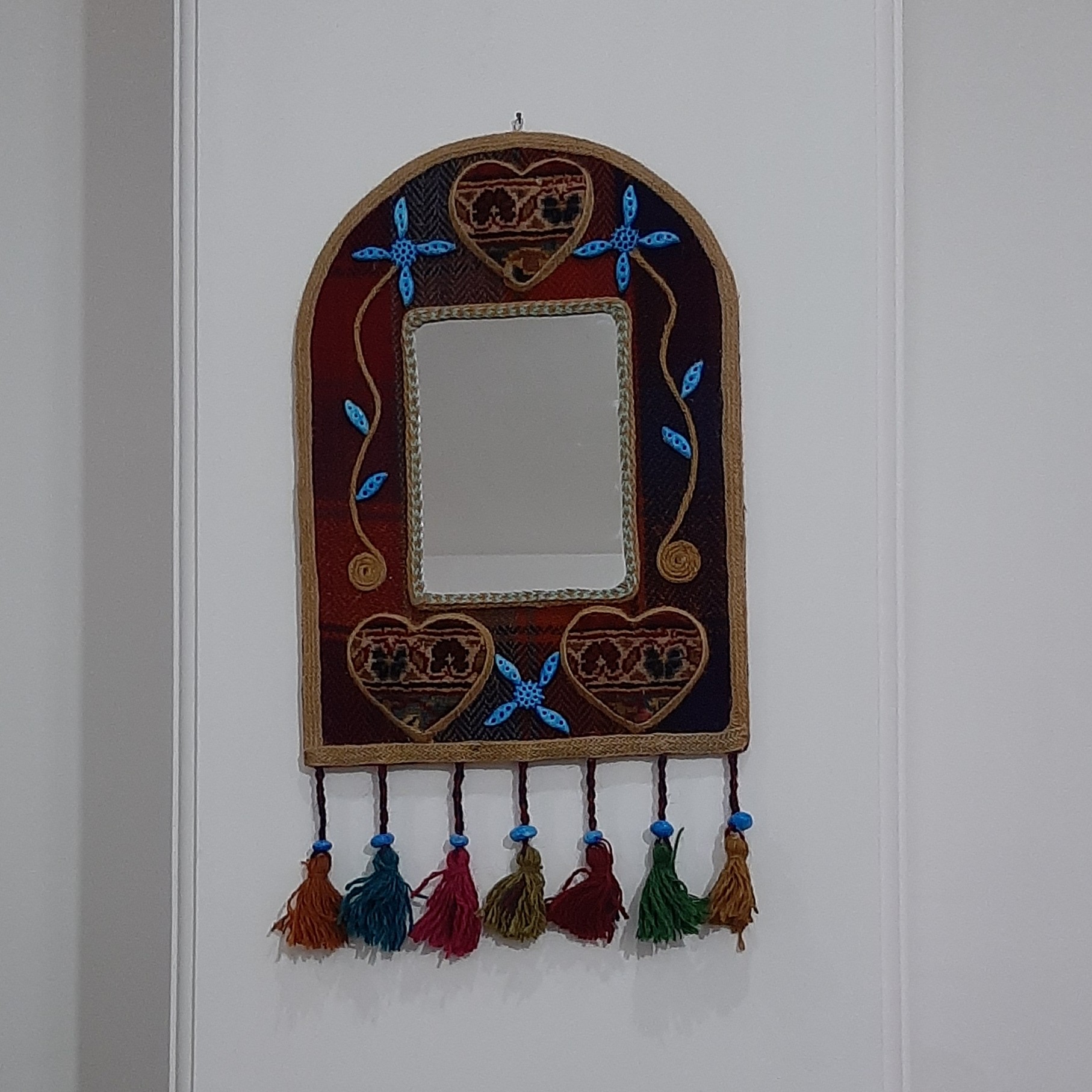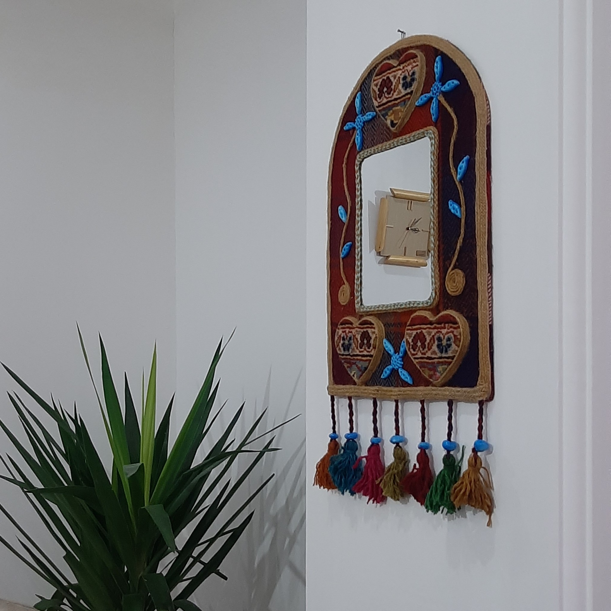 آینه سنتی گنبدی مزین ب فرش دستبافت و جاجیم دست بافت و کنف آرایی و گل بوته های چشم و نظر