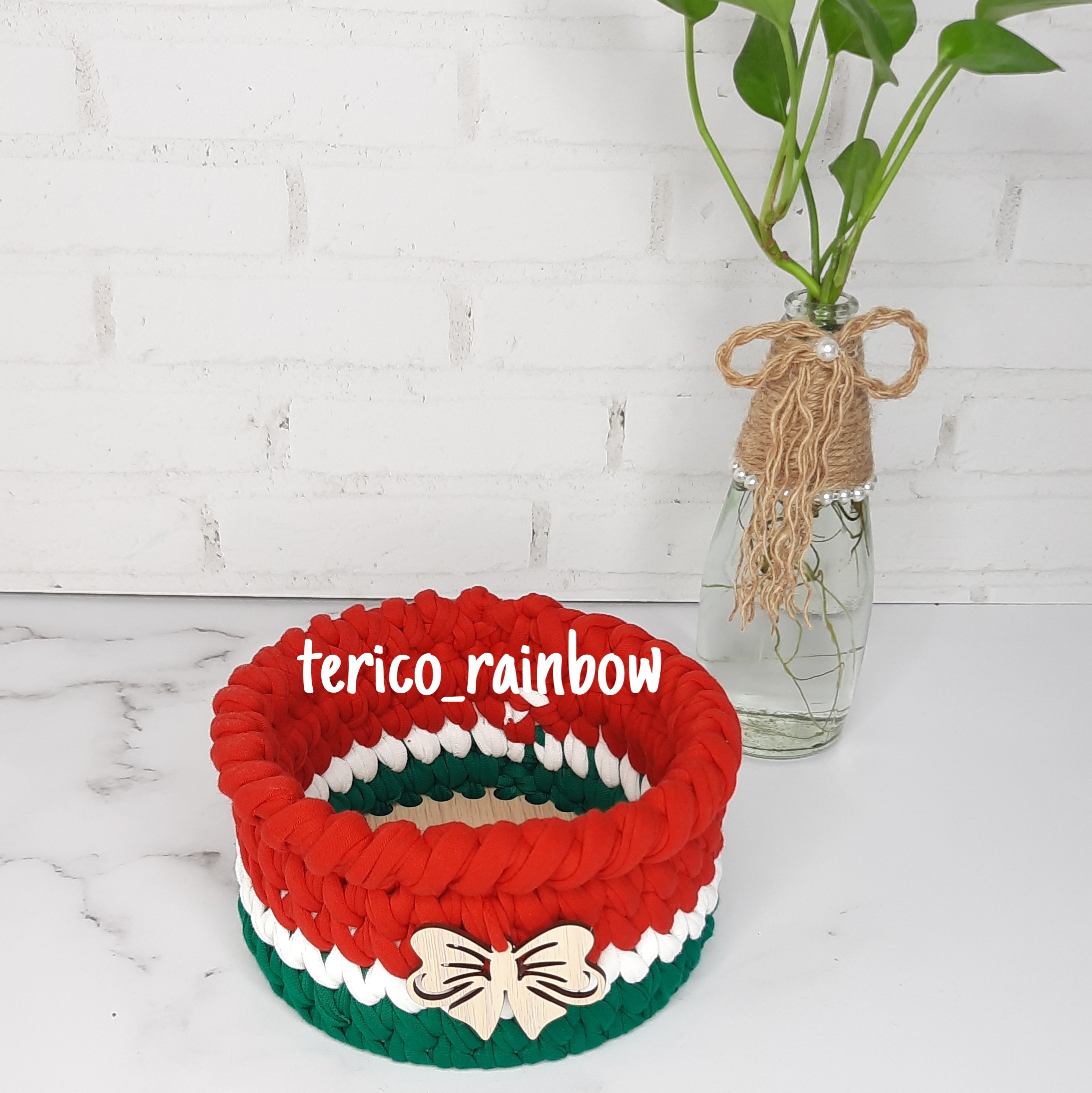 سبد تریکو طرح یلدا مناسب برای چیدمان میوه آجیل و شیرینی و شکلات قطر ۱۵ سانت کف کار چوبی