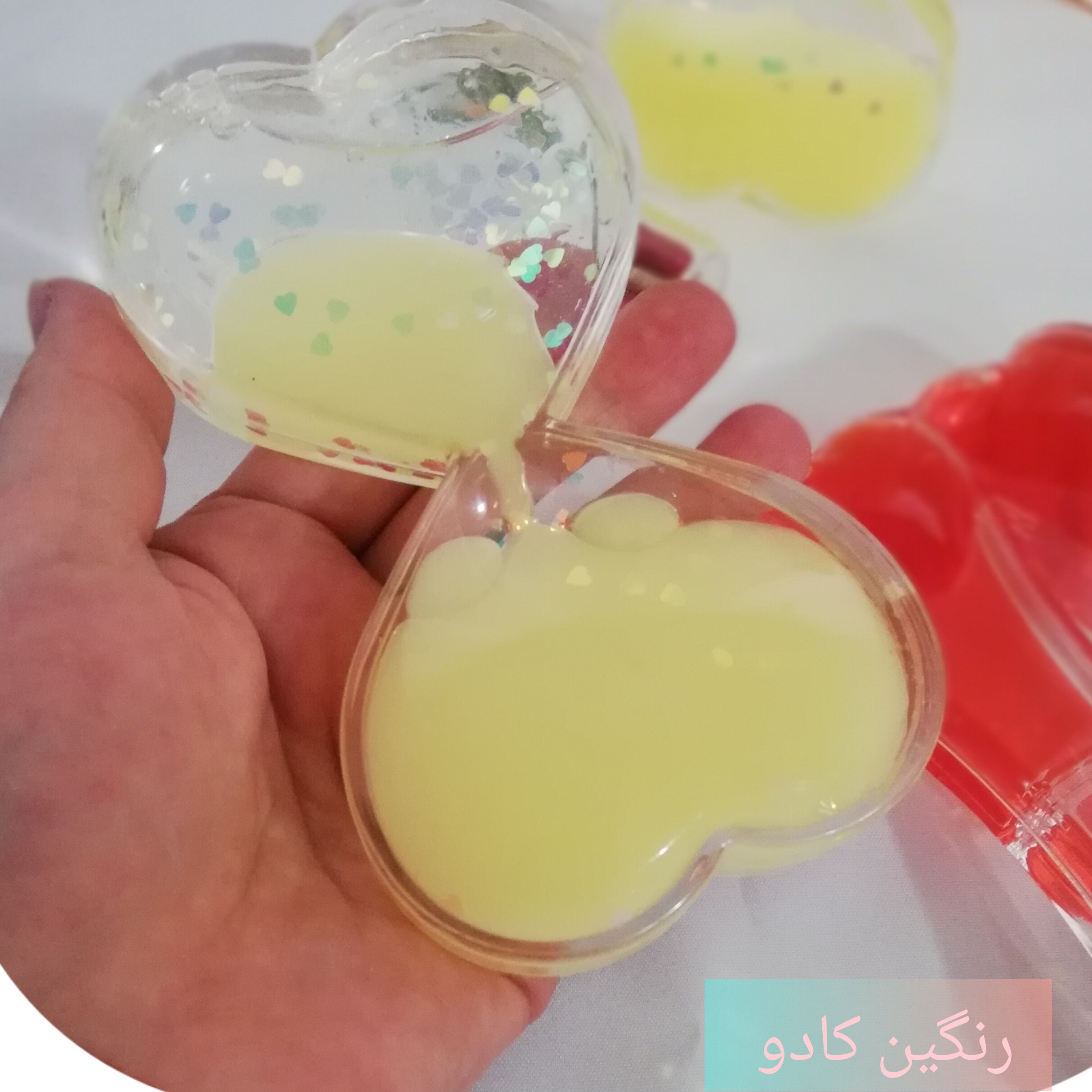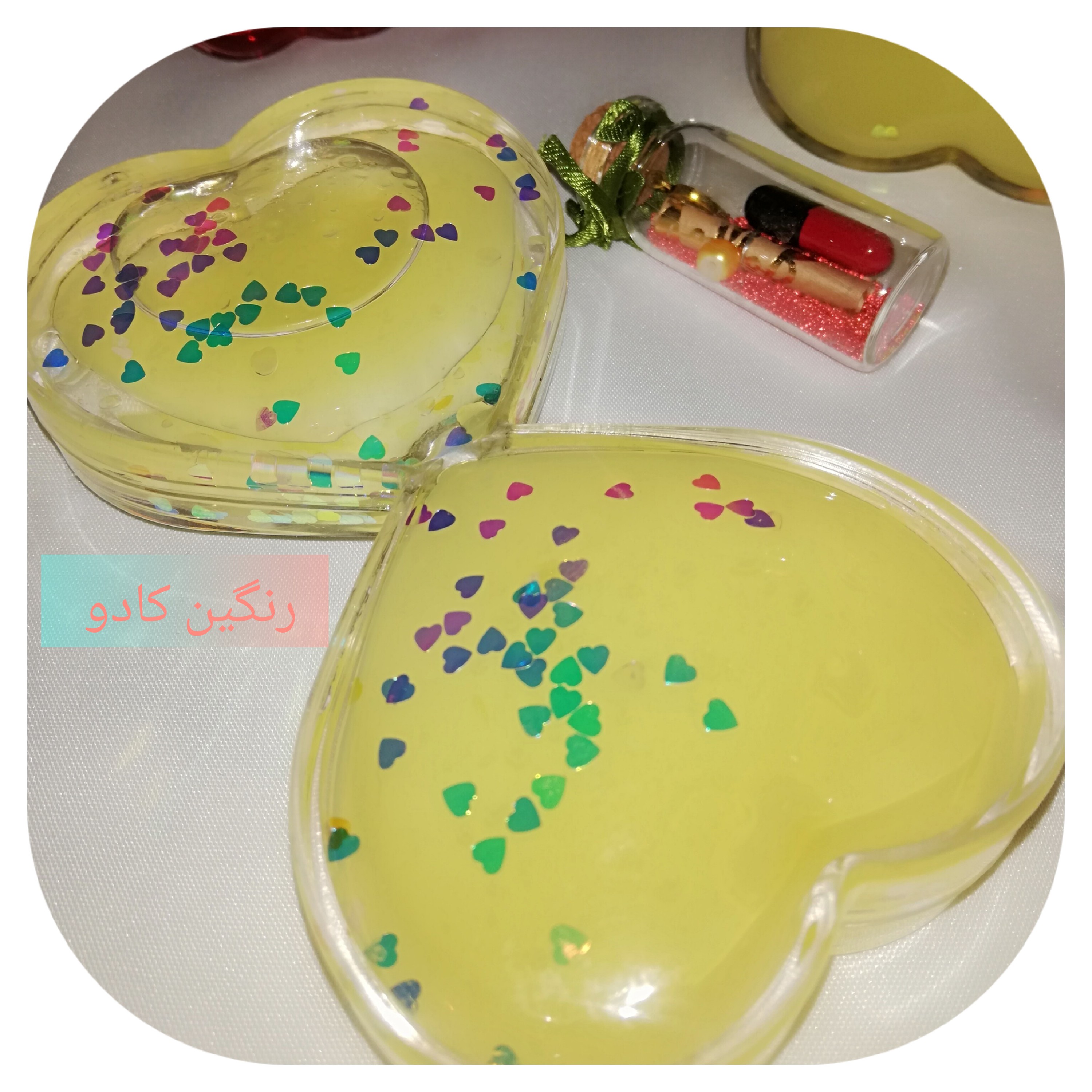 ساعت ژله ای طرح قلبي با ارتفاع 14 سانتیمتر مناسب برای کادو و تزئین با رنگ های پاستیلی زرد با قلب های ریز اکلیلی براق