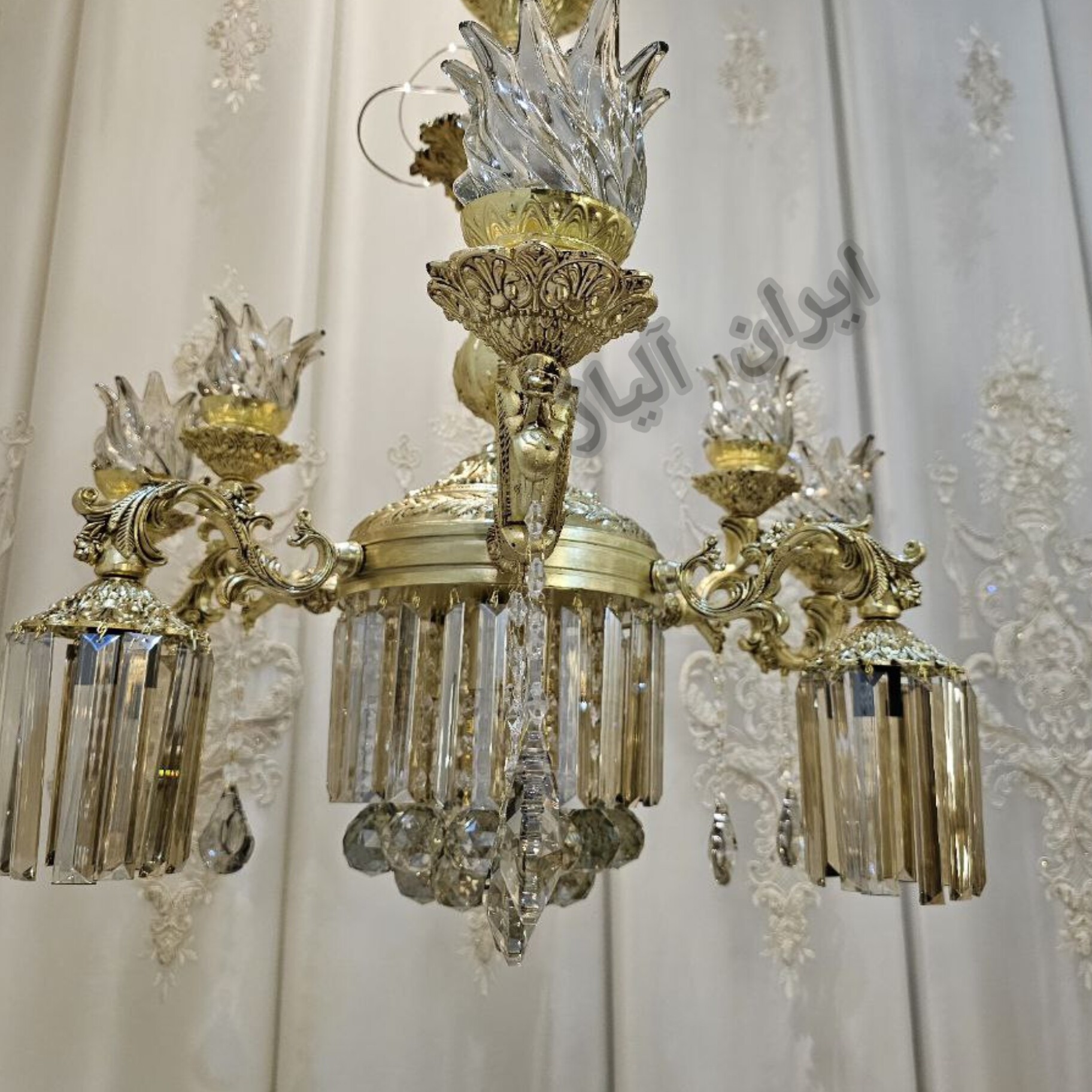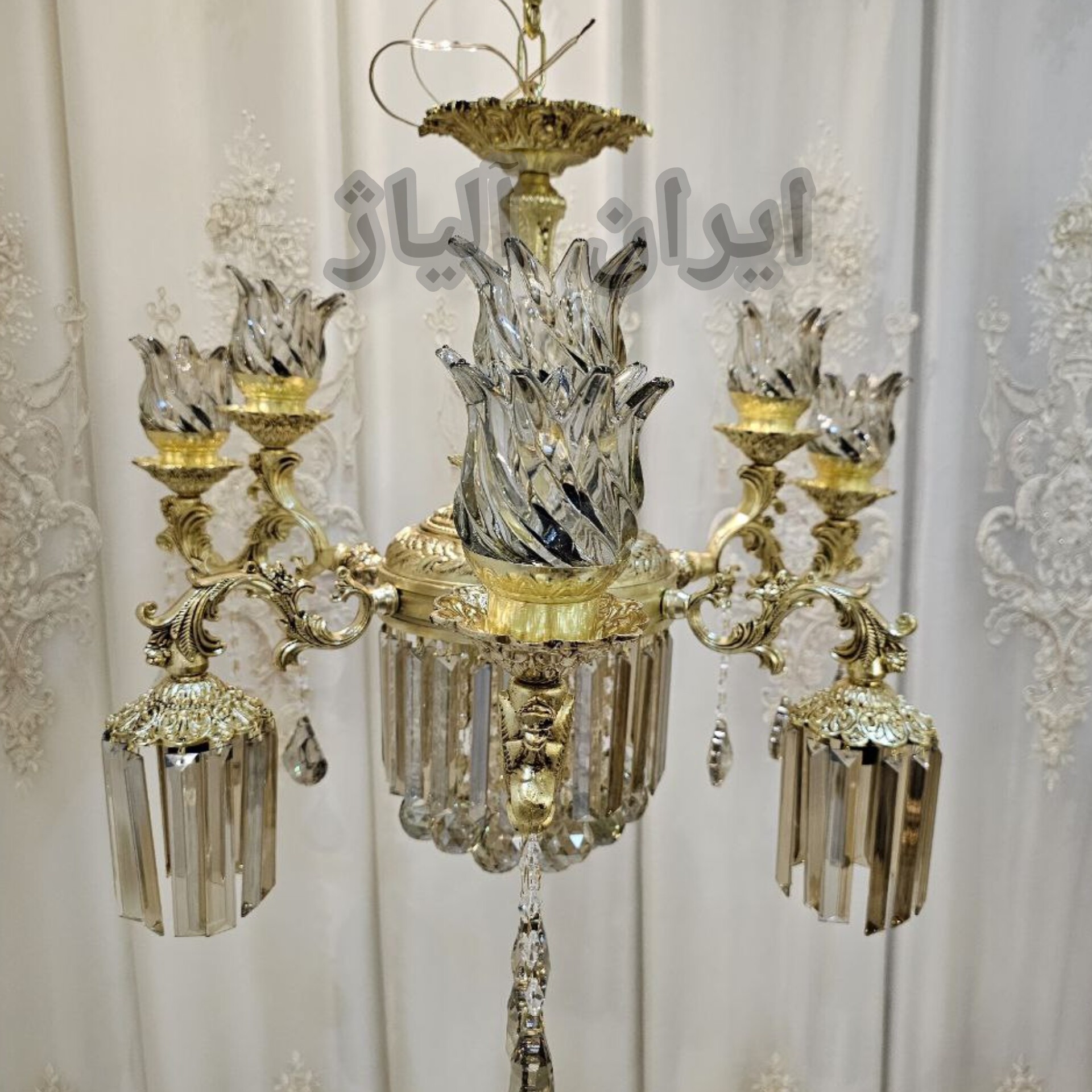 لوستر 6شاخه شاخه برگردون 15شعله زیر کریستال جنس آلیاژ آلومینیوم آبکاری برنج رنگ ثابت ده سال ضمانت آبکاری و کارت گارانتی