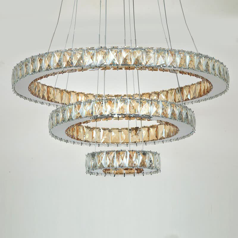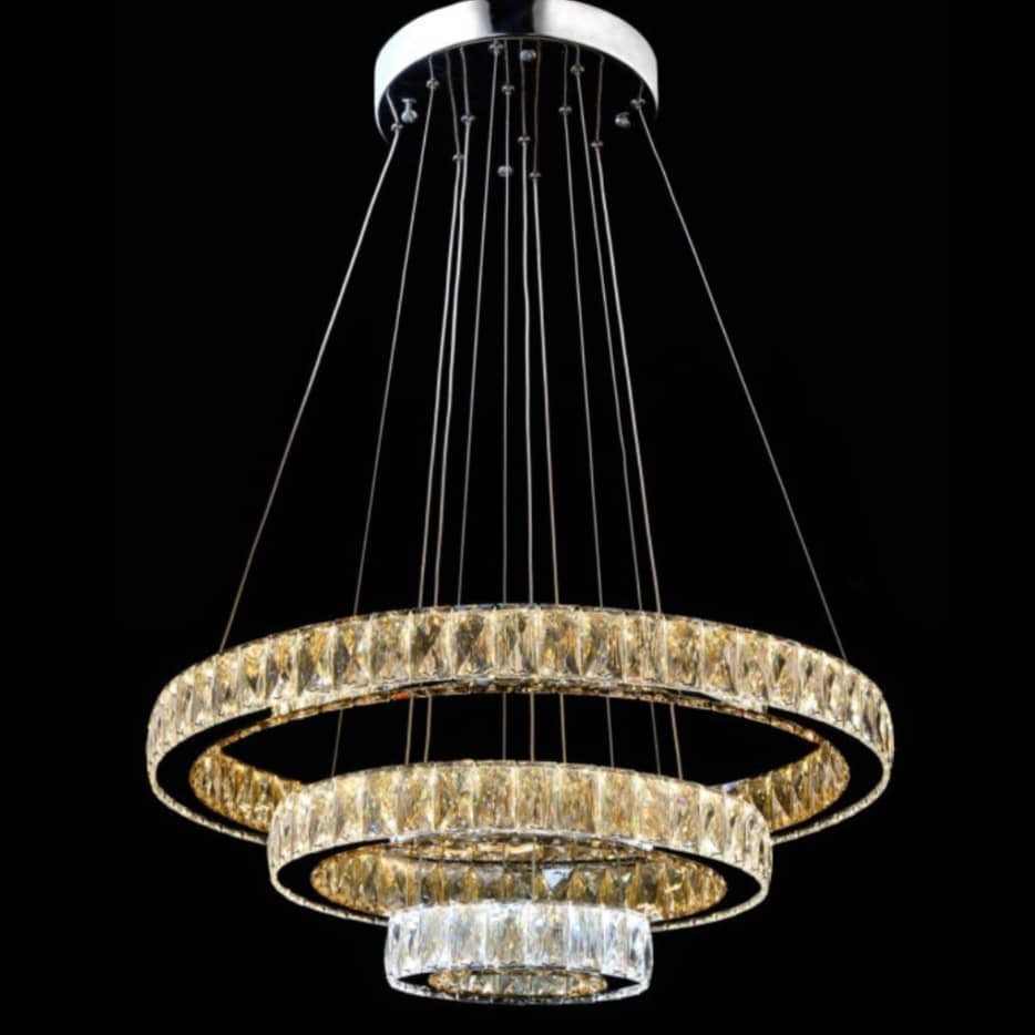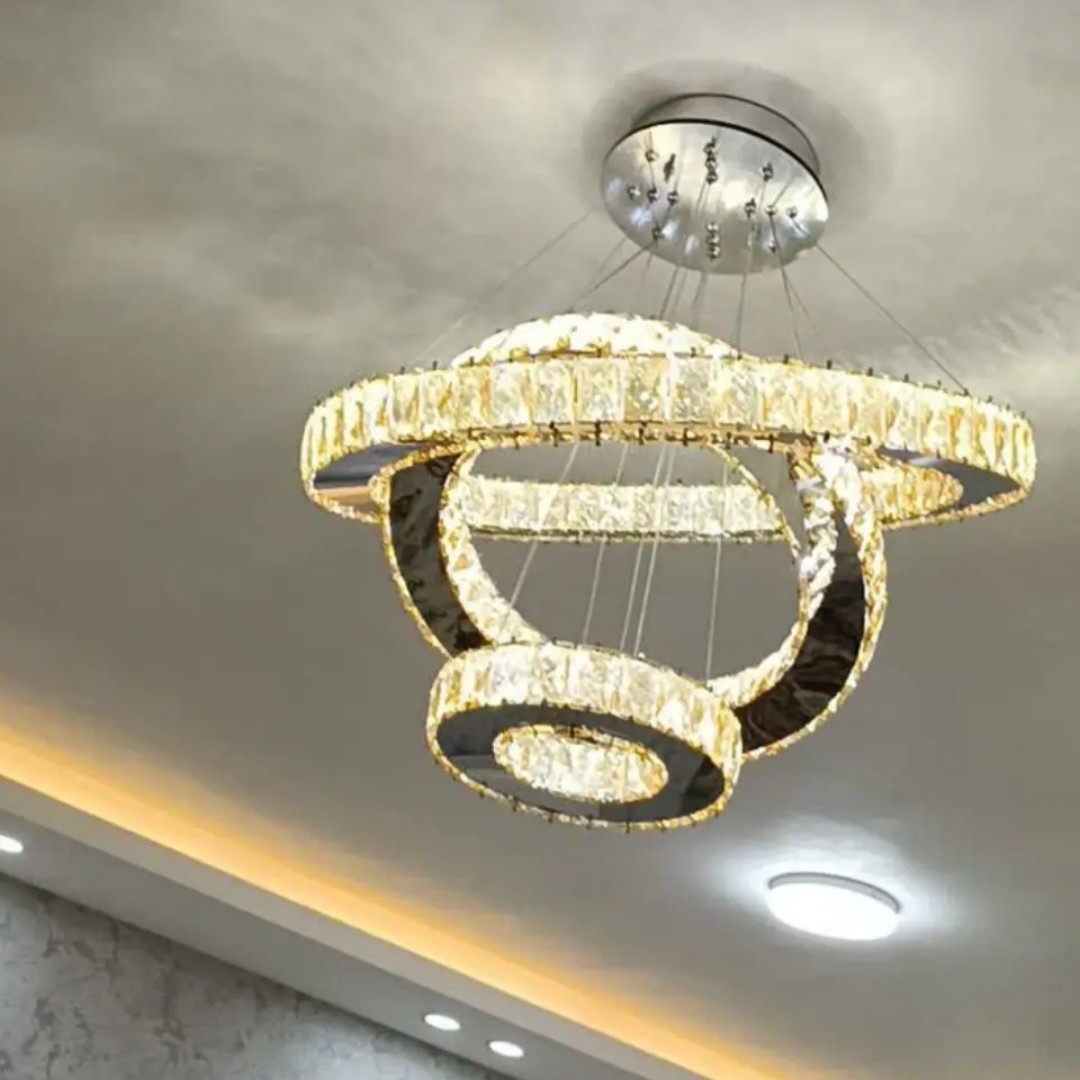 لوستر سه حلقه مدل کهکشان کریستالی ابعاد حلقه ها به ترتیب 60 و 40 و 20 سانتمتر موجود در دو رنگ استیل طلایی و نقره ای اویز ها قابل تنظیم و تغییر حالت به سلیقه شما میباشد کریستال درجه یک وارداتی 3×5 سانت و همگی سفید قابلیت نصب ریمونت کنترل هوشمند برای تغییر رنگ افتابی و سفید و نچرال ریسه ال ای دی با تراکم 240 پر نور استیل خارجی درجه یک مناسب برای سالن تا 40 متر خرید مستقیم و بدون واسطه از تولیدی ارسال رایگان تا باربری شهر مقصد