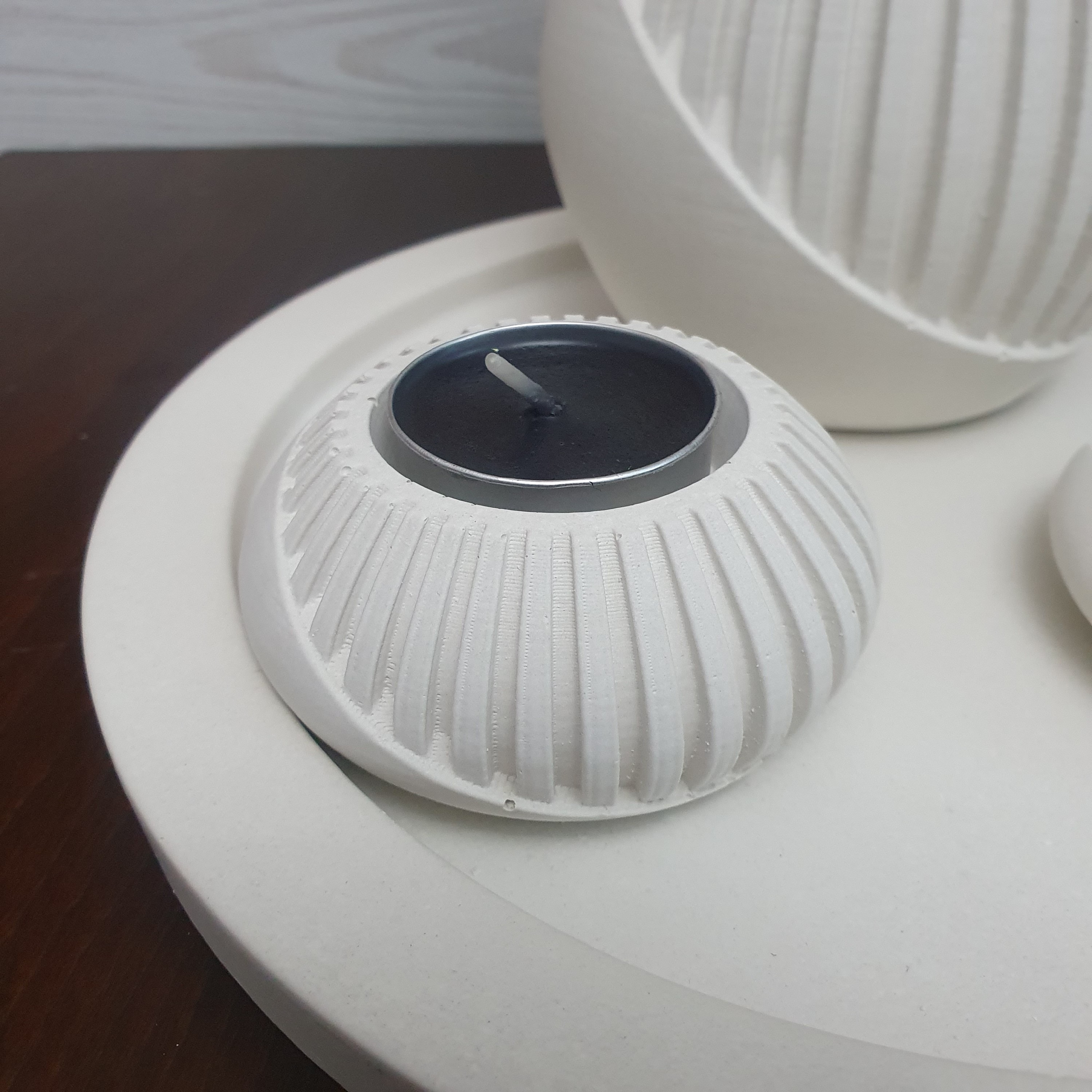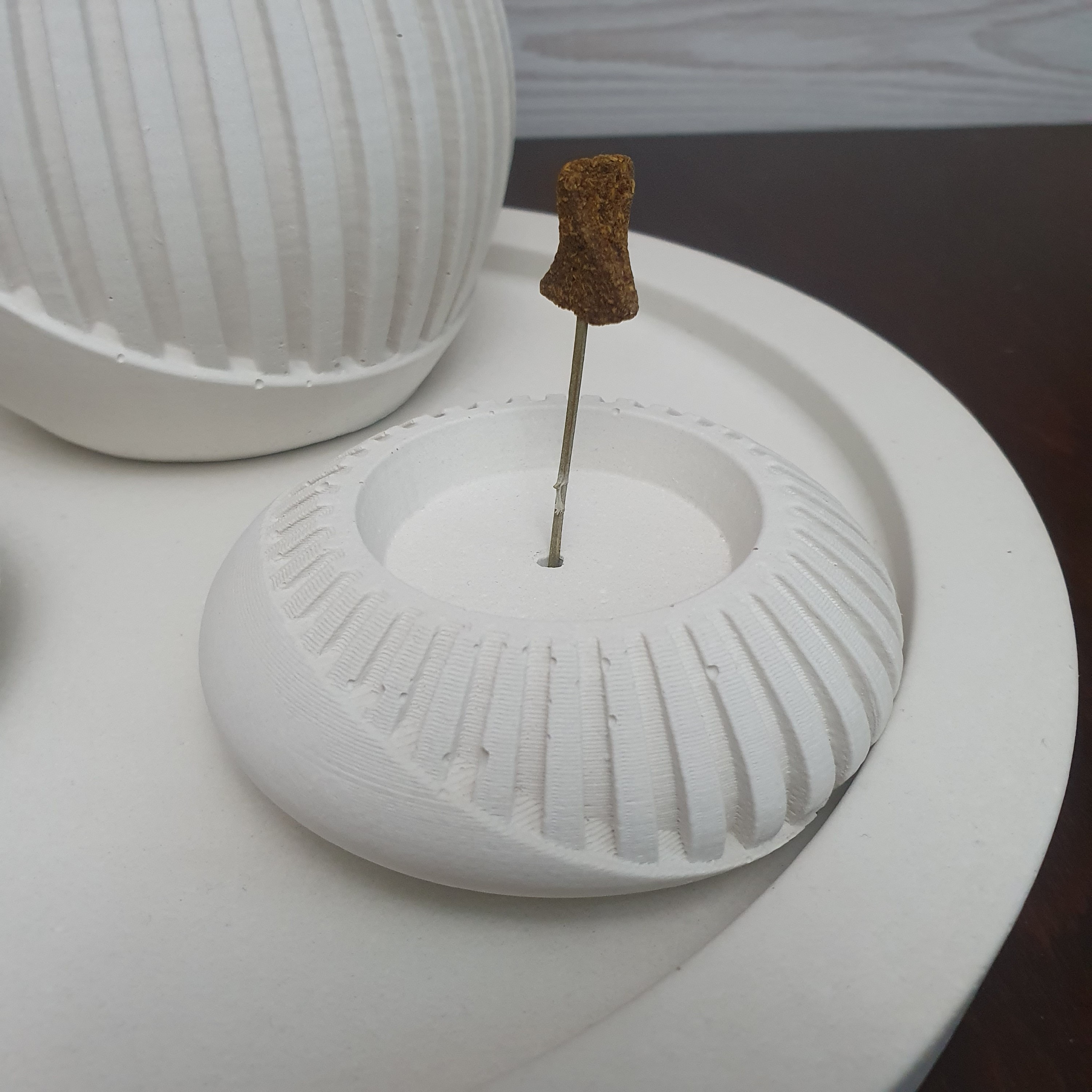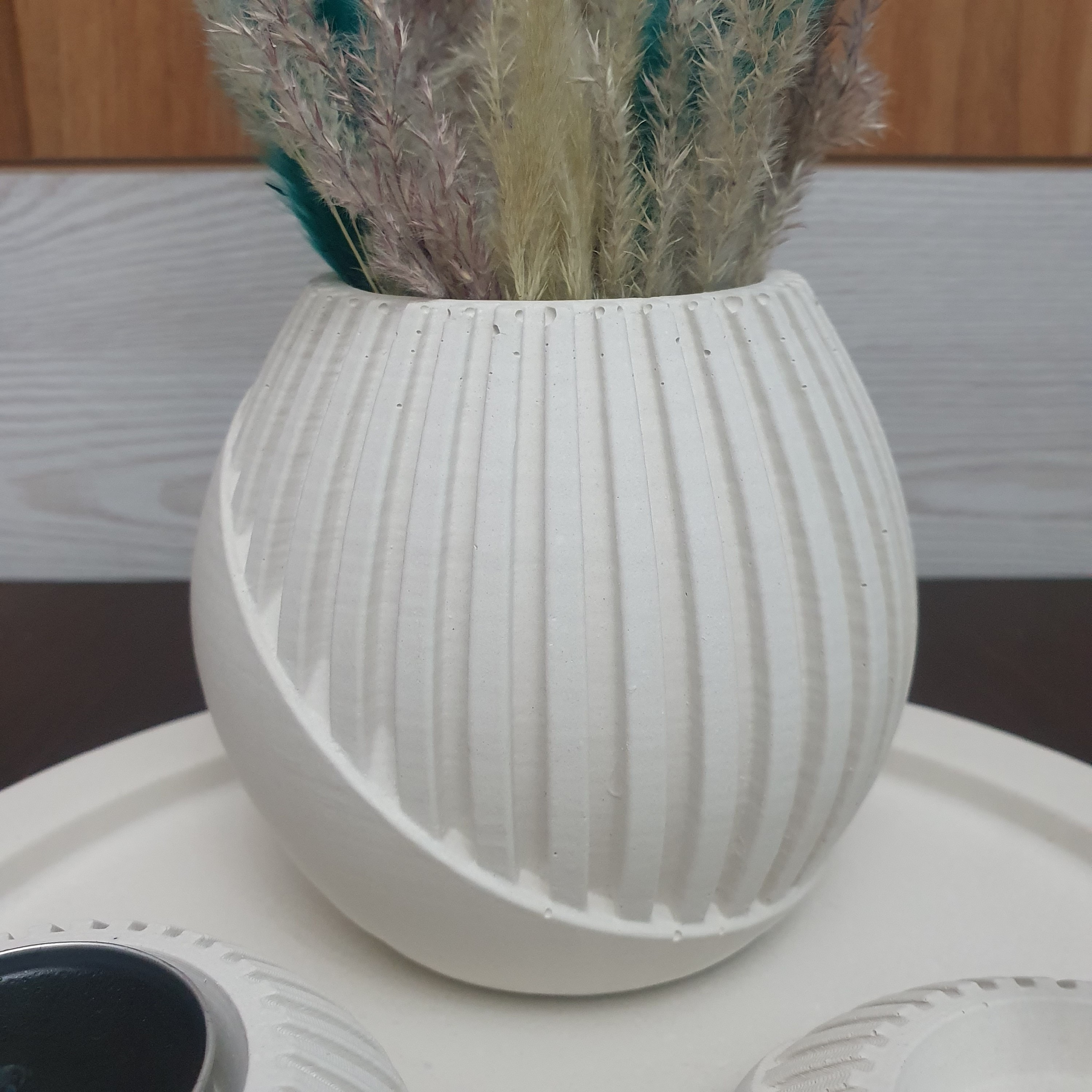 گلدان دکوری شیار دار ، جاوارمری، سینی، جاعودی و یک بسته عود دستساز طبیعی، جنس سنگ مصنوعی رنگ سفید مبلمونسرا مدل 286878
