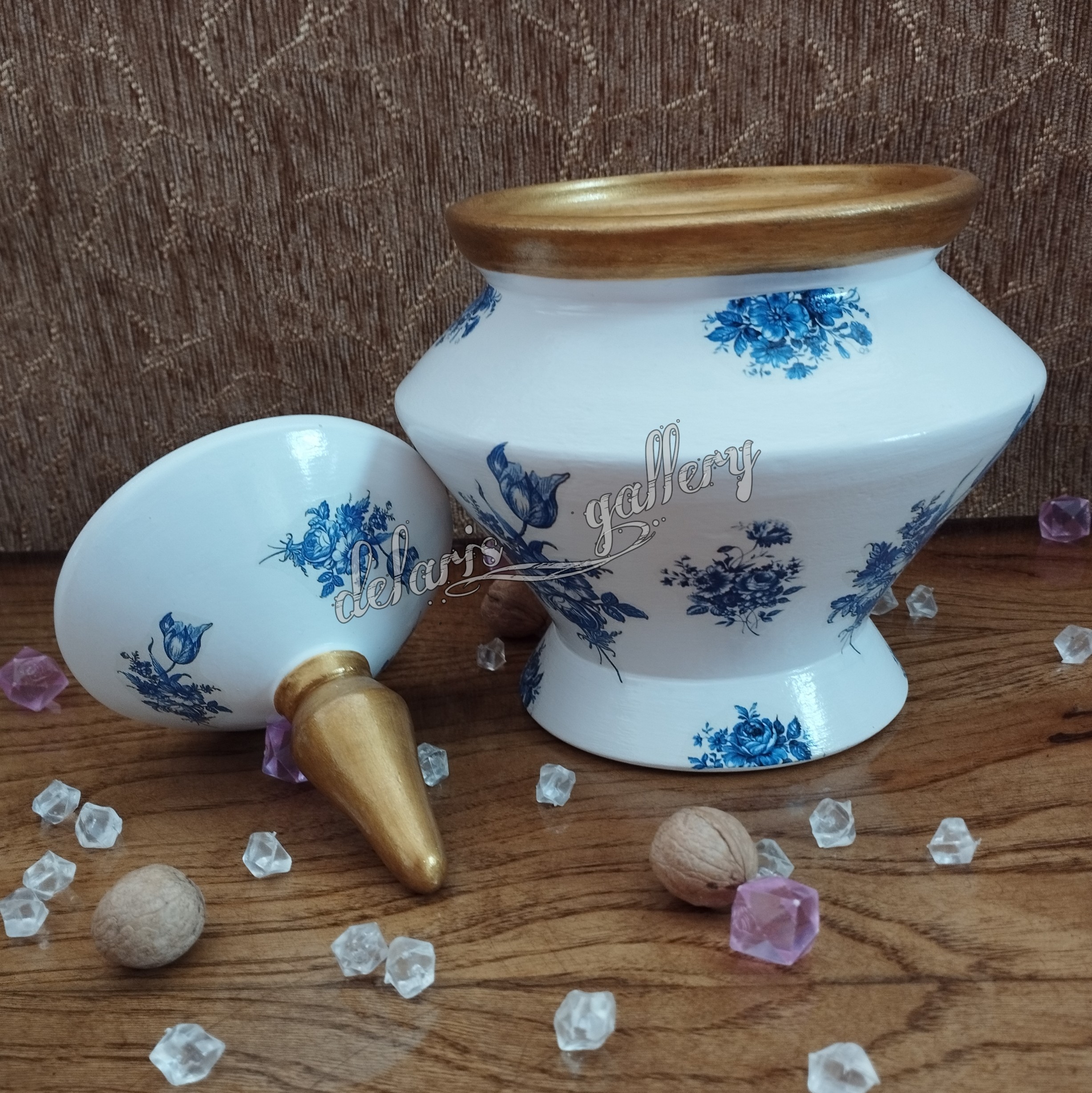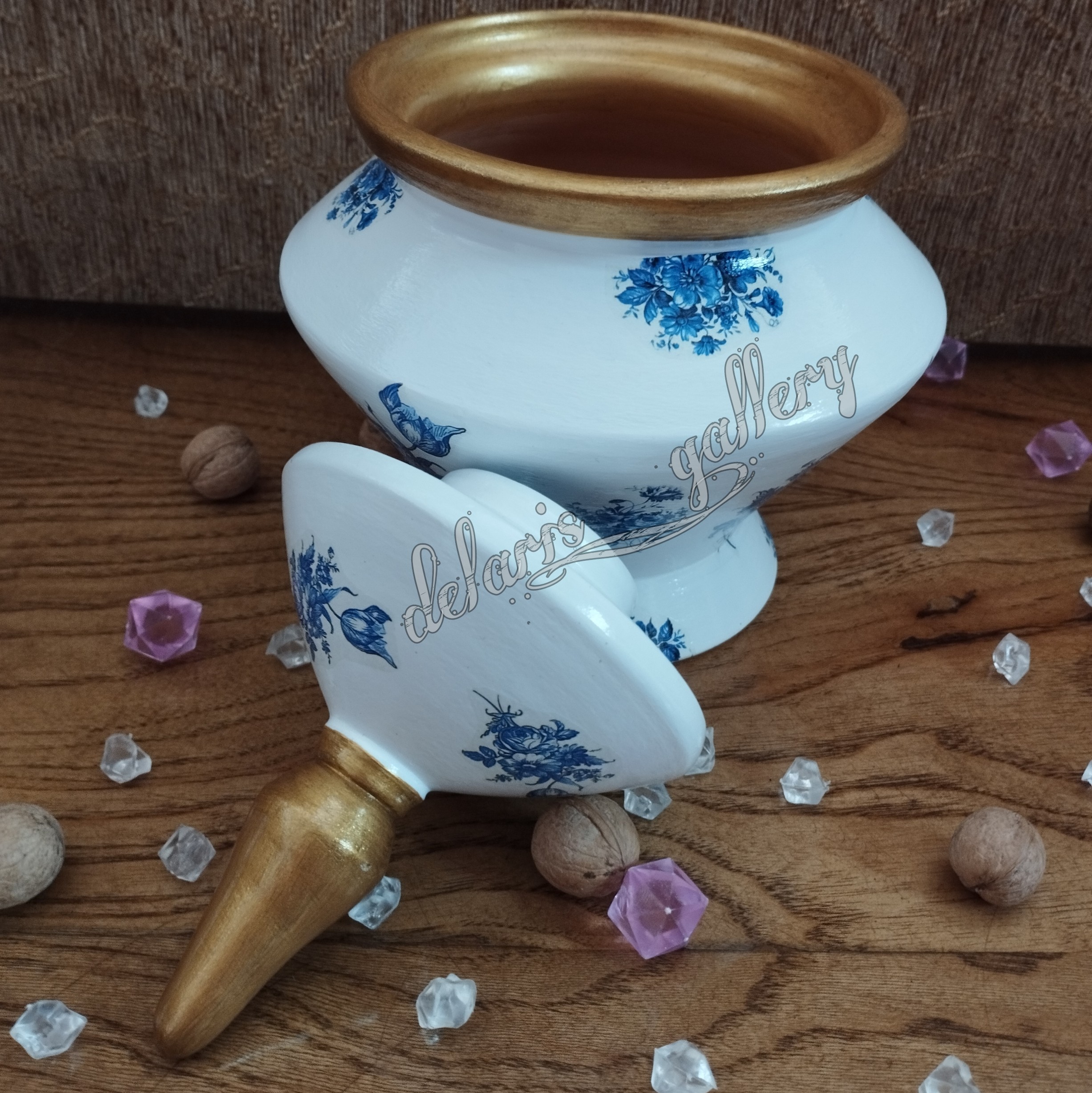 شکلات خوری سلطنتی.. طرح پرطرفدار قلم آبی.. میتونه یک پیشنهاد خاص و شیک برای محافل شما.. یا یک باکس زیبا برای اکسسوری و جواهرات تون باشه.. یا یه گلدون برای جلوی کنسول.. جنس سفال.. کار دست ✋ قابل شستوشو.. تکنیک ترانسفر.. پتینه طلایی آنتیک روی لبه ها و درب.. سایز: ارتفاع با درب 23 سانت،بدون درب 13سانت.. قطر 17 سانت...قطر دهنه 13 سانت..