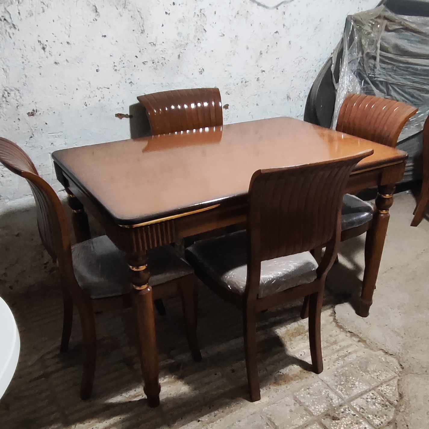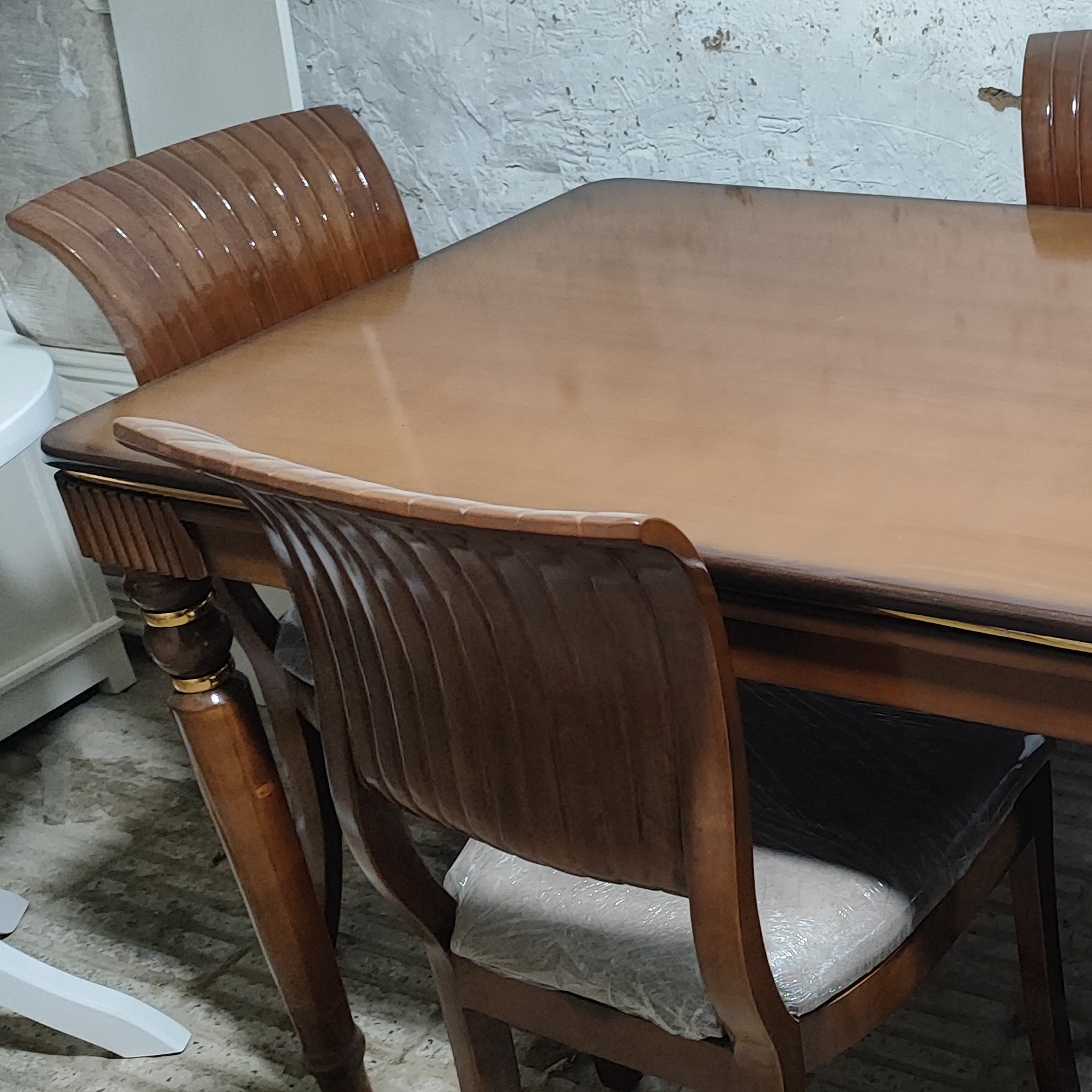میز ناهارخوری مدل صدفی تمام چوب ۱جنس صندلی چوب توسکا ۲.میز خراطی روس با نوار طلایی ۳.جنس پارچه صافت ۴ رنگ قهوهای رنگ پلی استر براق ۵.ارسال محصول به صورت
