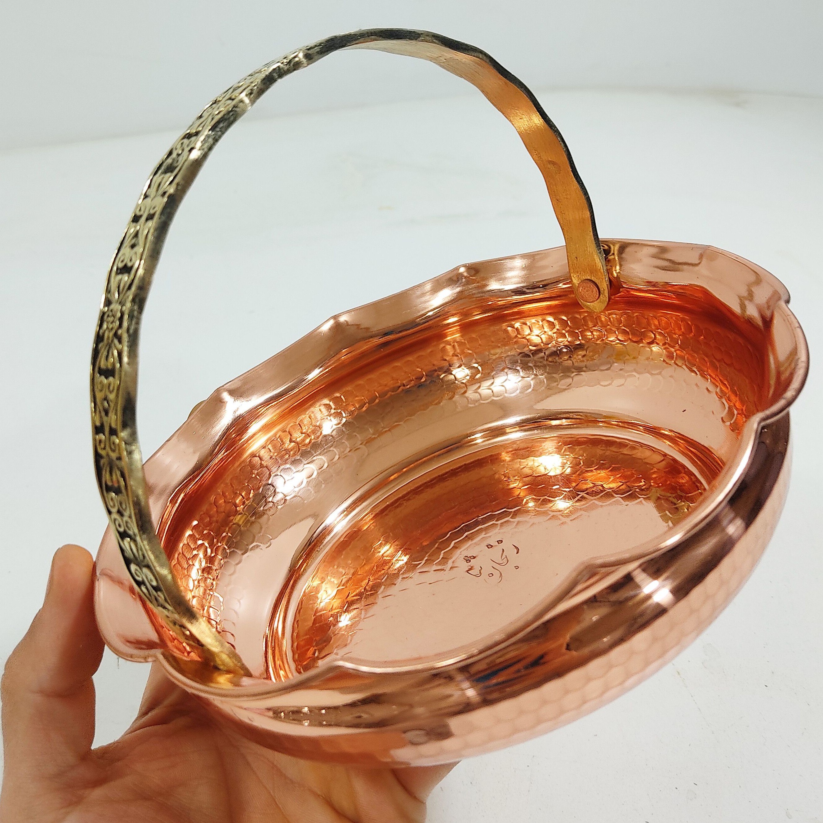 محصول بسیار زیبا کاربردی دست ساز و رنگ ثابت دور چین کنگره دار دسته برنجی سیاه قلم بدنه تمام مس بسیار شفاف و براق چکش کتری شده ساخته شده از خالص ترین و شفاف ترین ورق مسی