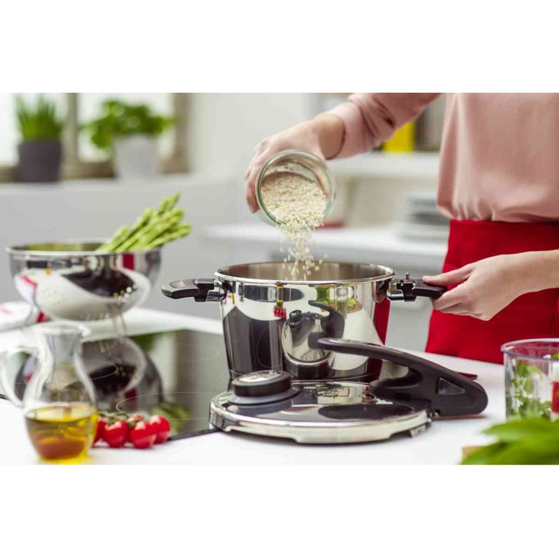 به عنوان اولین تولیدکننده زودپز، 170 سال پیش (1845) توسط کارل فیلیپ در آلمان پایه گذاری شد. «زودپز مدل Vitavit Edition Design - 6 لیتر» یکی از مدلهای سری ویتاویت است که طراحی زیبایی دارد .زودپز جزو یکی از امنترین زودپزهای تولیدشده در سراسر جهان است. حجم فشار تولیدشده در این زودپز 150 کیلو پاسکال بوده که در مقایسه با زودپزهای معتبر دیگر بیشتر است. از این رو سرعت پخت در زودپز بالاتر از سرعت پخت در زودپزهای دیگر است. پس میتوان نتیجه گرفت که زمان کمتری از شما گرفته خواهد شد و هرچه قدر سرعت پخت بالاتر باشد ویتامینهای مواد غذایی بیشتر حفظ خواهد شد. این زودپز با تمامی انواع گازها، مانند گازهای الکتریکی یا گازی سازگاری دارد. این دستگاه بهطور معمول بدون فشار نیز کار میکند و میتوانید در مواقع دلخواه در آن را به منظور همزدن یا اضافه کردن موادغذایی بردارید و به همه روند پختوپز احاطه داشته باشید. بر روی درزودپز انتخابگری وجود دارد که میتوانید میزان فشار حبس شده داخل زودپز را کنترل نمایید بدینصورت که مطابق دفترچهراهنما برای یکسری از موادغذایی بر روی قسمت 1 و برای موادغذایی دیگر بر روی قسمت 2 قابل تنظیم خواهد بود. همچنین این انتخابگر به شما این امکان را میدهد تا بعد از اتمام پخت بخار حبسشده در زودپز را به راحتی تخلیه نمایید. این زودپز از استیل 10/18 ساختهشده که بهترین و مرغوبترین کیفیتاستیل را دارد. دستگیره این مدل، جوری طراحی شده تا جایکمتری را اشغال کند. داخل زودپز مندرج شده است تا شما بدوننیاز به لیوان یا کاسهمندرج، مقدار مواد یا آب موردنظر خود را به داخل ظرف اضافه کنید. در این مدل از زودپز مراحل پخت به صورت خطوط رنگی (زرد – سبز – قرمز) مشخص شده است که این امکان را به کاربر میدهد که در صورت لزوم میزان حرارت زیر زودپز را تغییر دهید. «زودپز مدل Vitavit Edition Design - 6 لیتر» دارای ظرفمخصوص بخارپز است که شما میتوانید با استفاده از آن، انواع سبزیجات و مواد خوراکی دیگر را هم بخارپز نمایید.