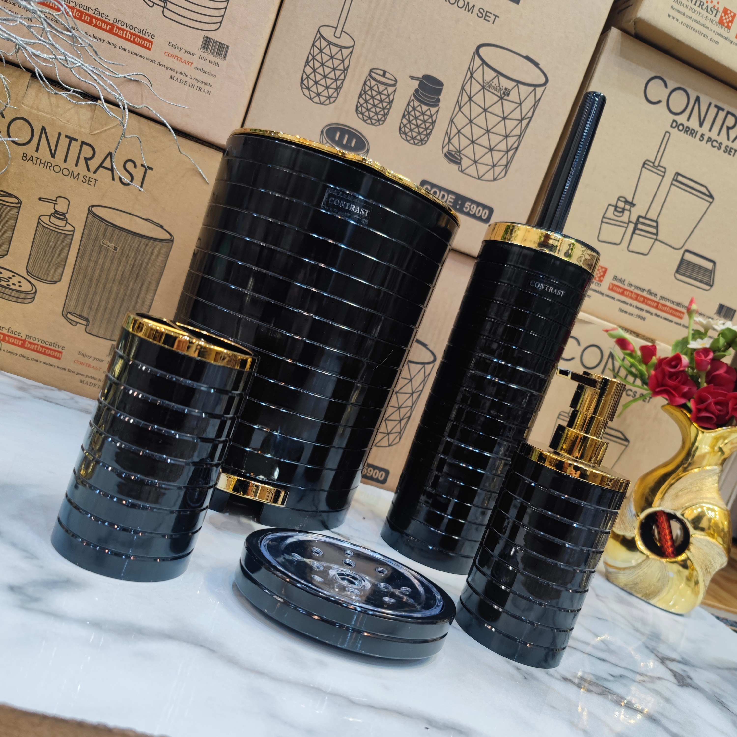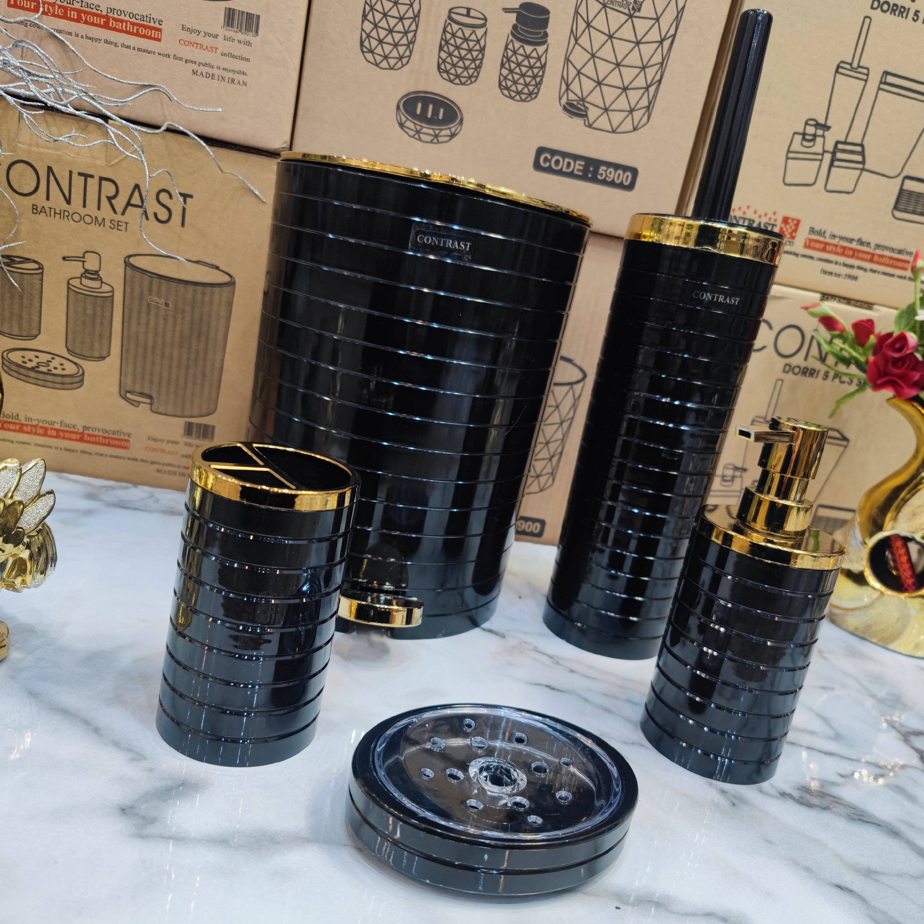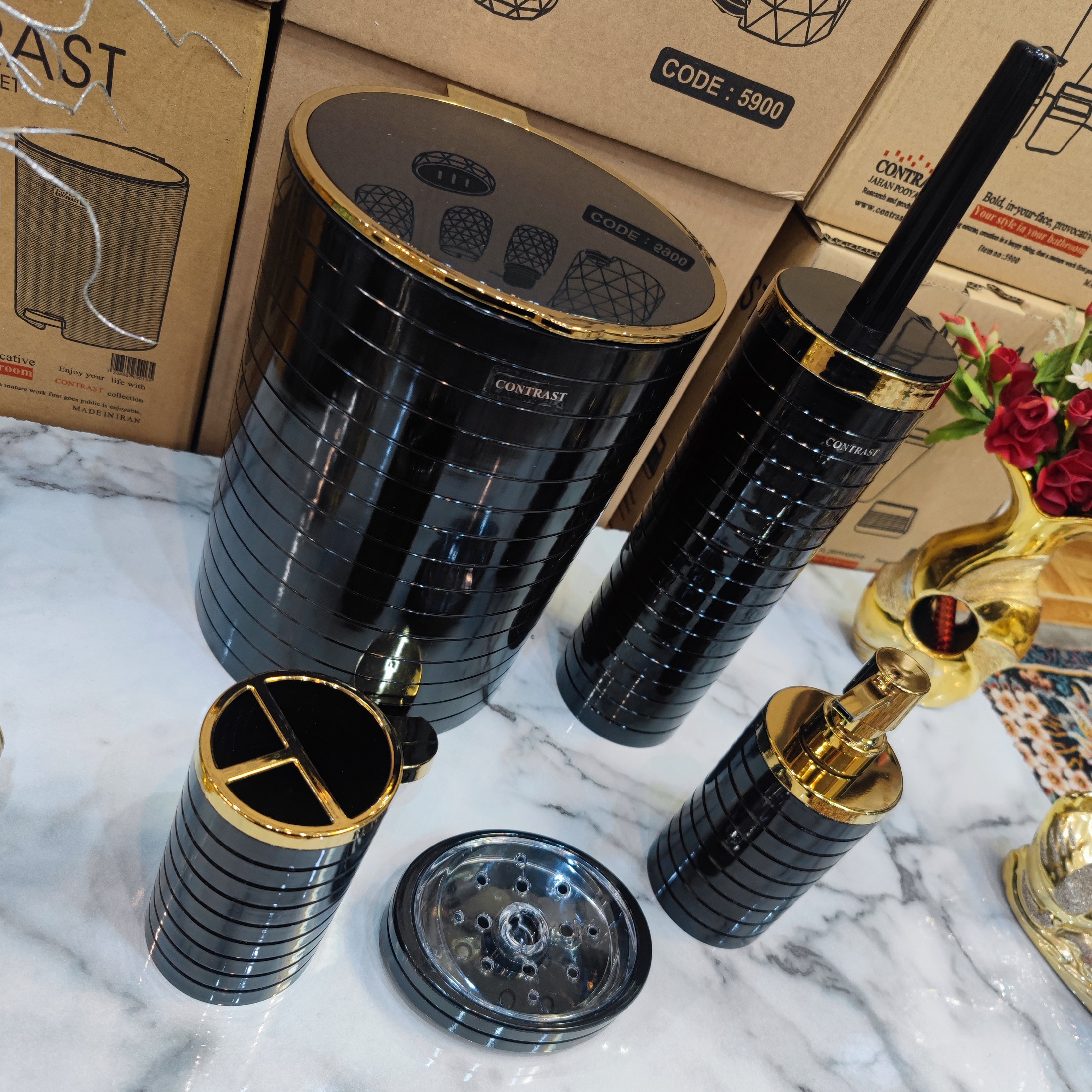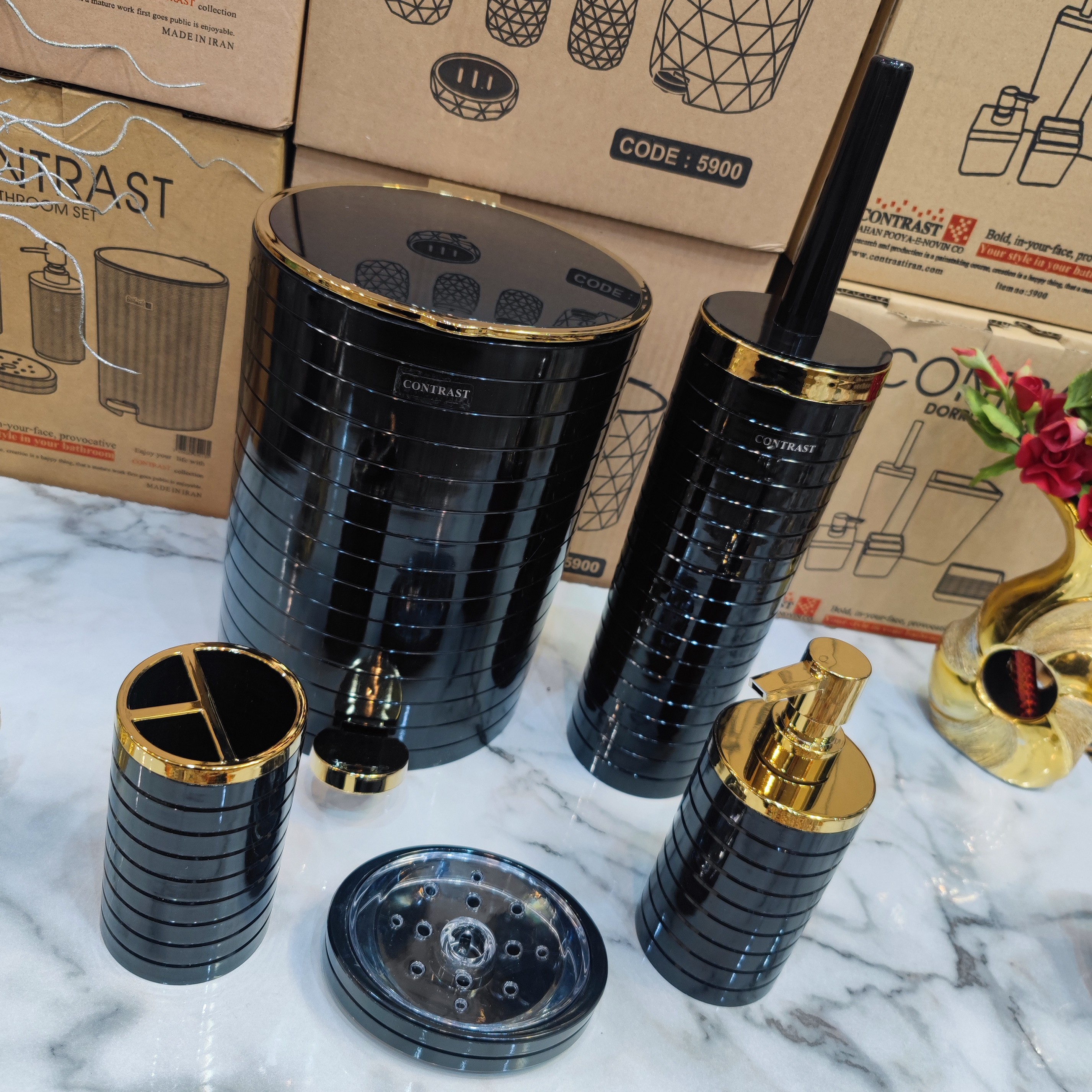 ست سرویس بهداشتی 5 پارچه طرح خط درشت برند کنتراست رنگ بسیار پرفروش و شکیل مشکی طلایی نو آکبند مبلمونسرا مدل 265738