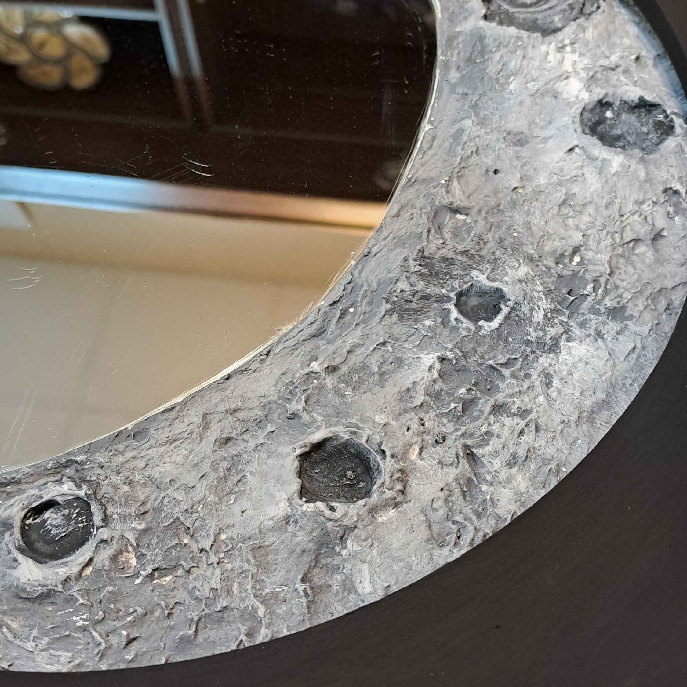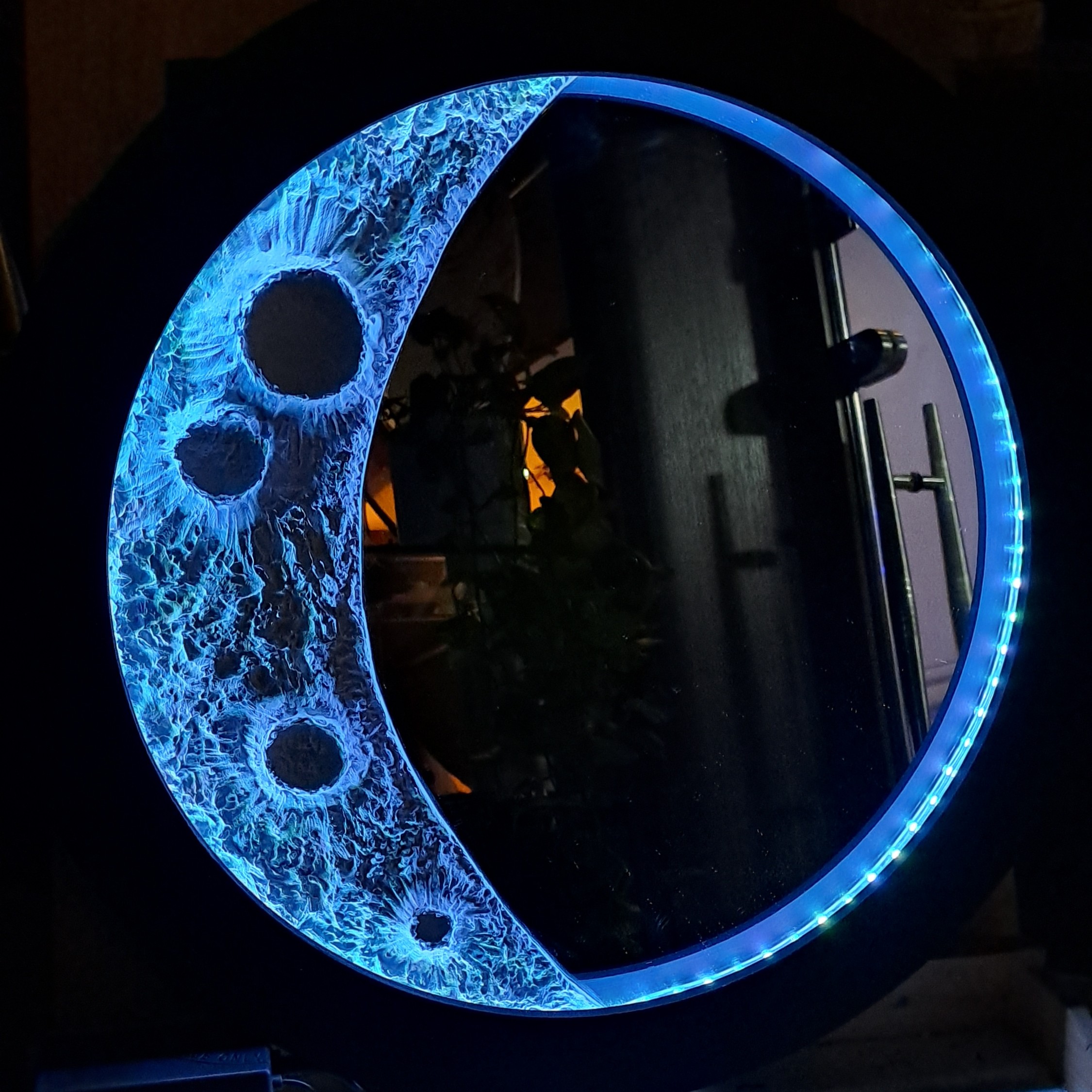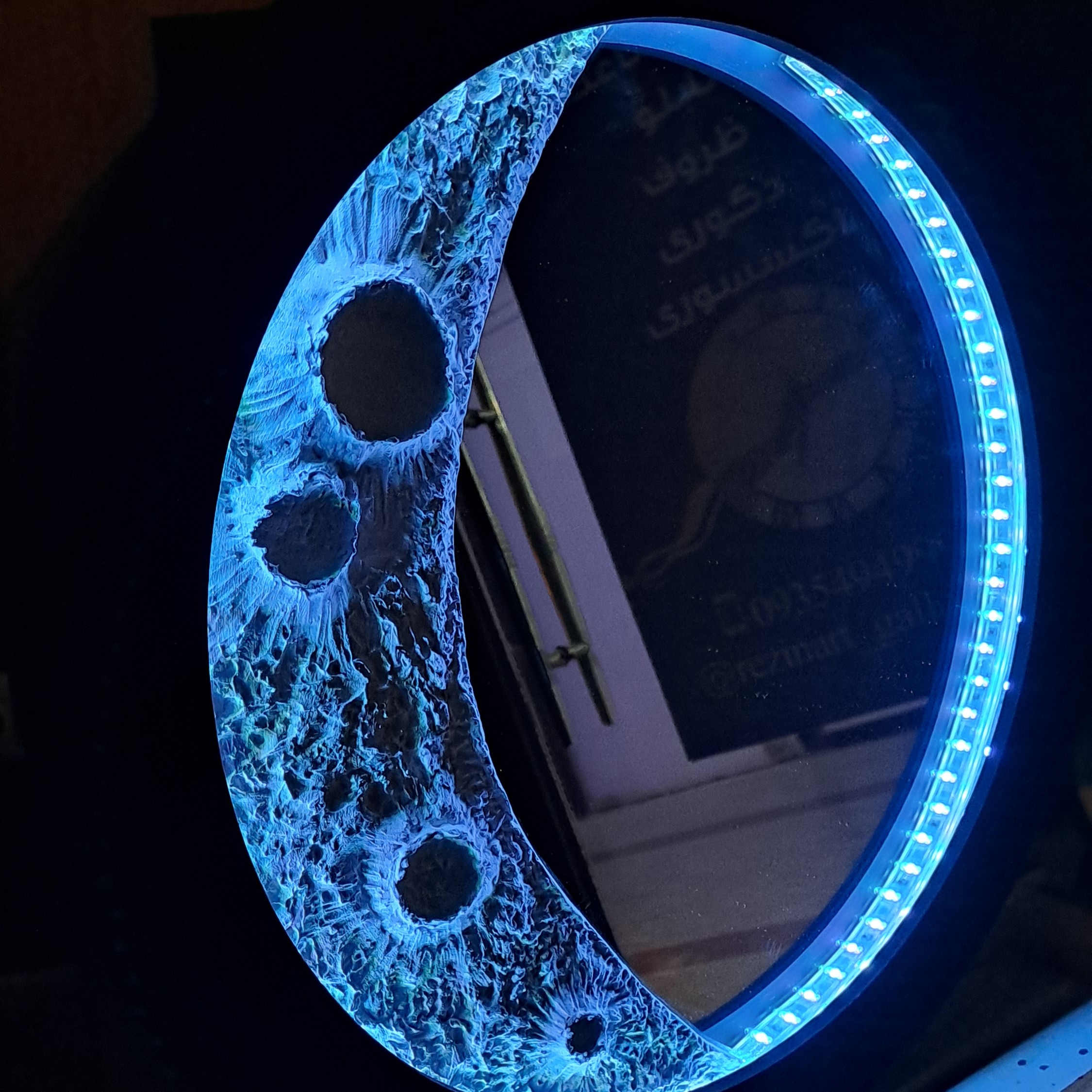 آینه ماه با نور مخفی حلال ماه محدب پتینه کاری شده قاب دار قیمت برای ابعاد ۵۰ میباشد ابعاد بزرگ تر قابل سفارش حالت نور میتواند ریموتی باشد با قابلیت کم و زیاد کردن نور و بیش از ۷ رنگ متغیر