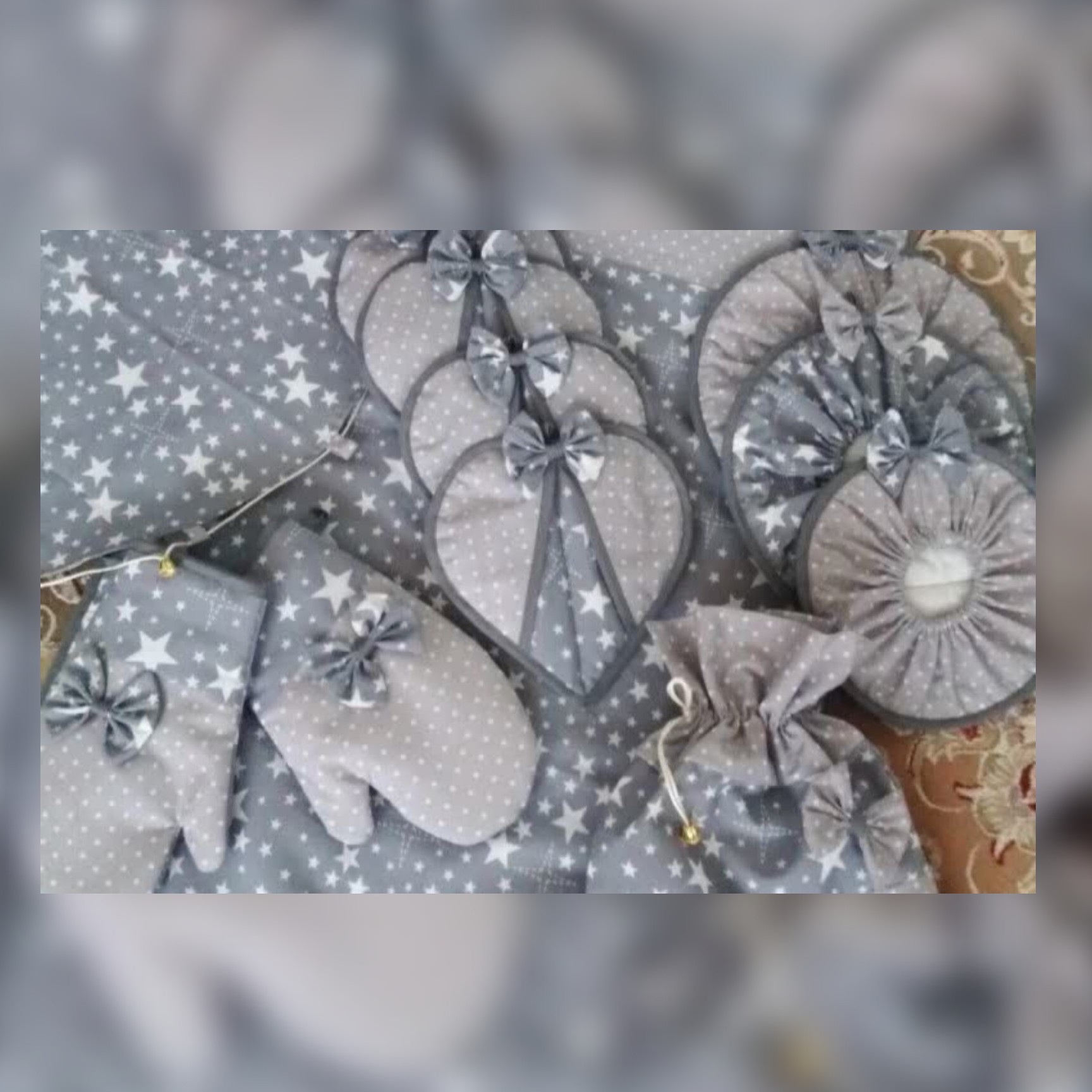 این محصول شامل یک عدد نمگیر 1.5متری یک عدد کاور قابلمه پیکنیک دمکن در سه سایز24.28.32 دو جفت دستگیره قلبی یک جفت دستکش فر یک عدد کیسه نان یک عدد کیسه سبزی یک عدد سفره قند در طرح و رنگی که شما سفارش دهید رنگ پارچه ها و طرحهای مختلف در عکس موجود میباشد شما میتوانید تیکه هارا کم یا زیاد کنید