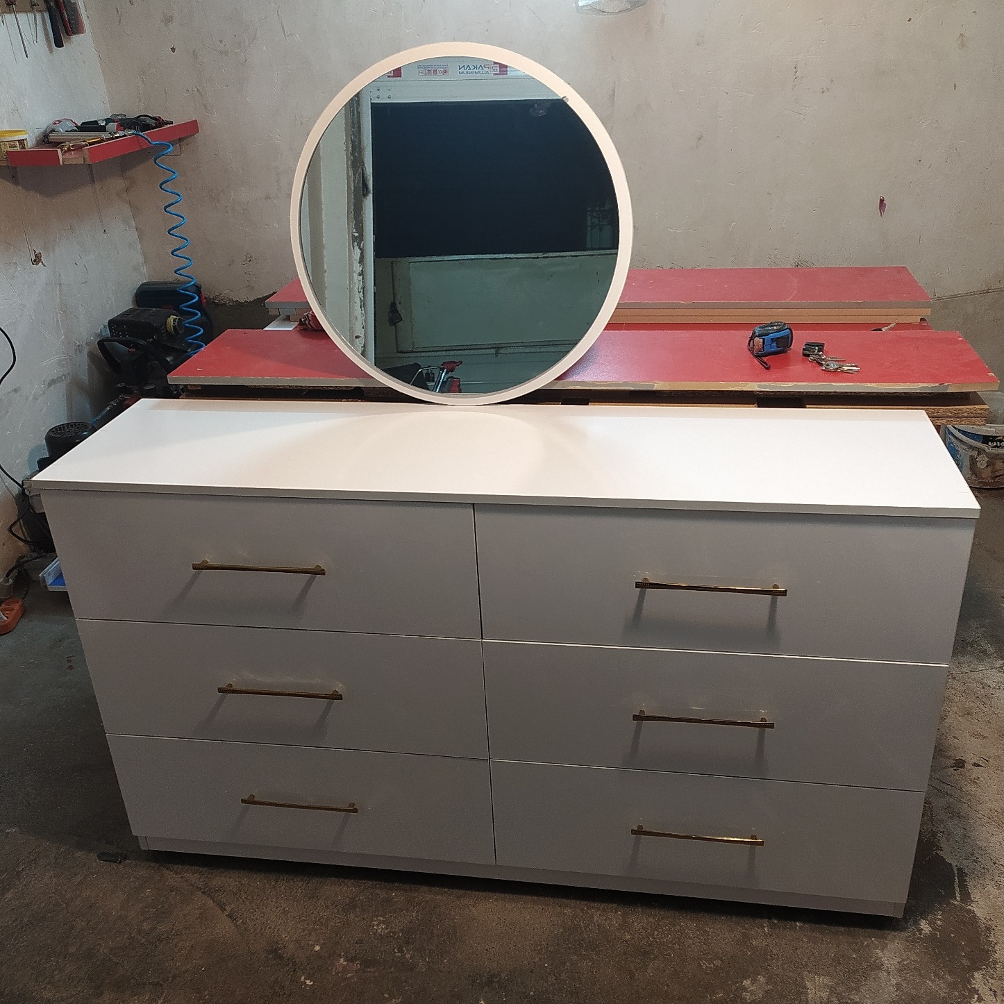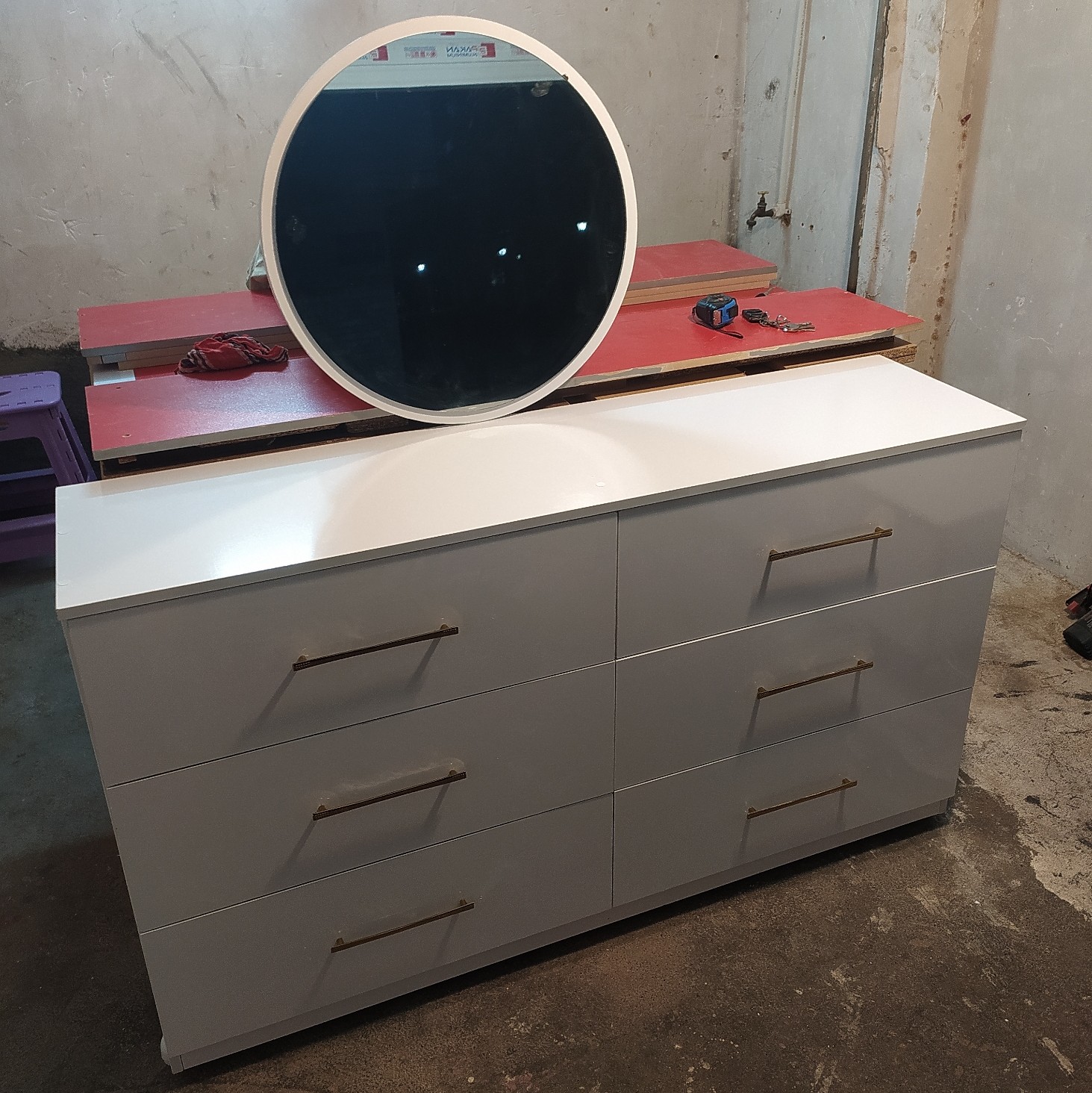 آینه دراور مدل ۶ کشو دراور به همراه یک عدد آینه گرد ارسال میشود✅ جنس ملامینه رنگ سفید براق دستگیره ها طلایی کشو ها عمیق و جادار ابعاد ۱۲۰ در ۸۰ ارسال رایگان بسته بندی ایمن