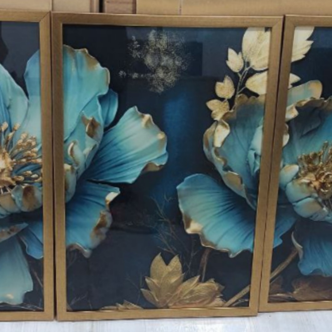تابلو دکوراتیو گل آبی وطلایی سه تکه مبلمونسرا مدل 267358