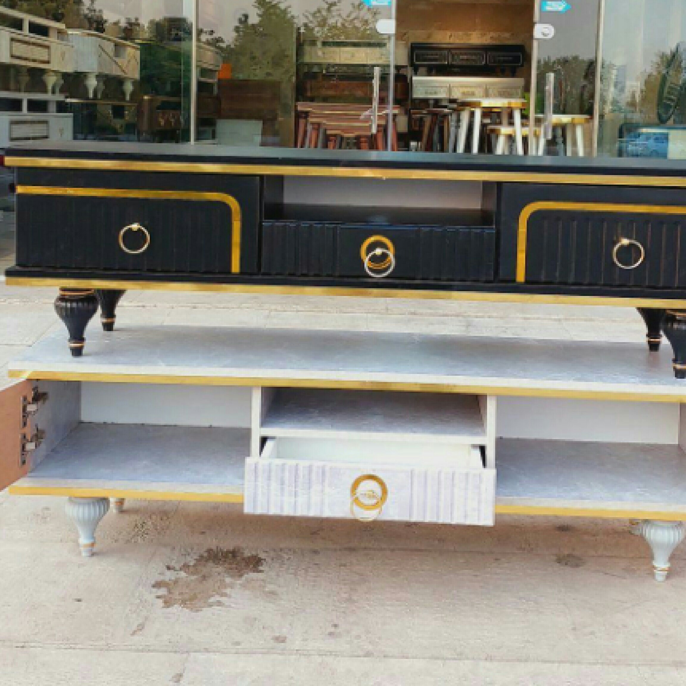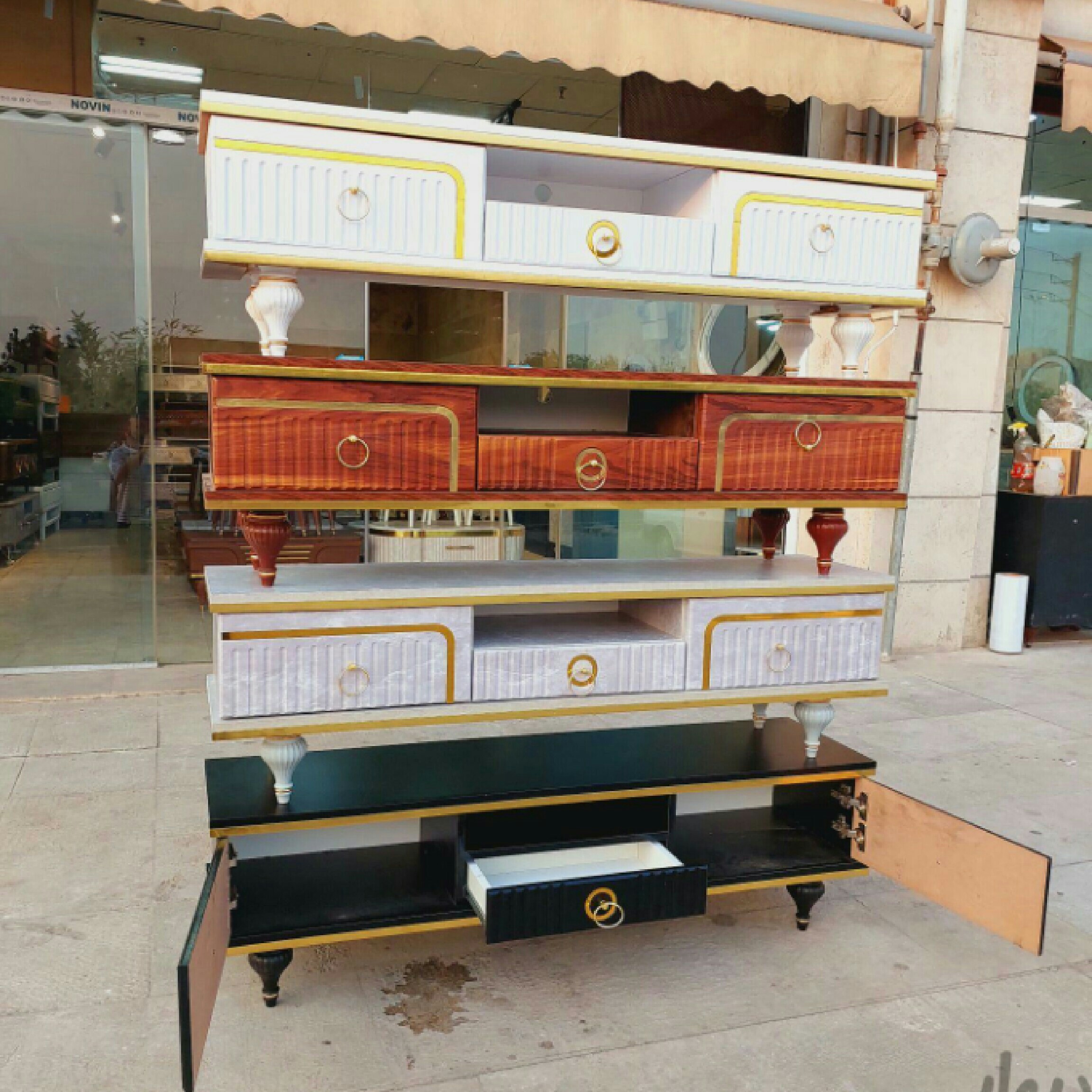 میز تلویزیون مدل دلکان 140 سانت در عرض 36 مناسب تا تلویزیون پنجاه و پنج اینچ دارای رنگبندی سفید . مشکی. قهوه ای آنتیک. قهوه ای فندقی. رنگ کاج استخوانی با مقاومت بالا دارای پایه های فلزی و گنبدی