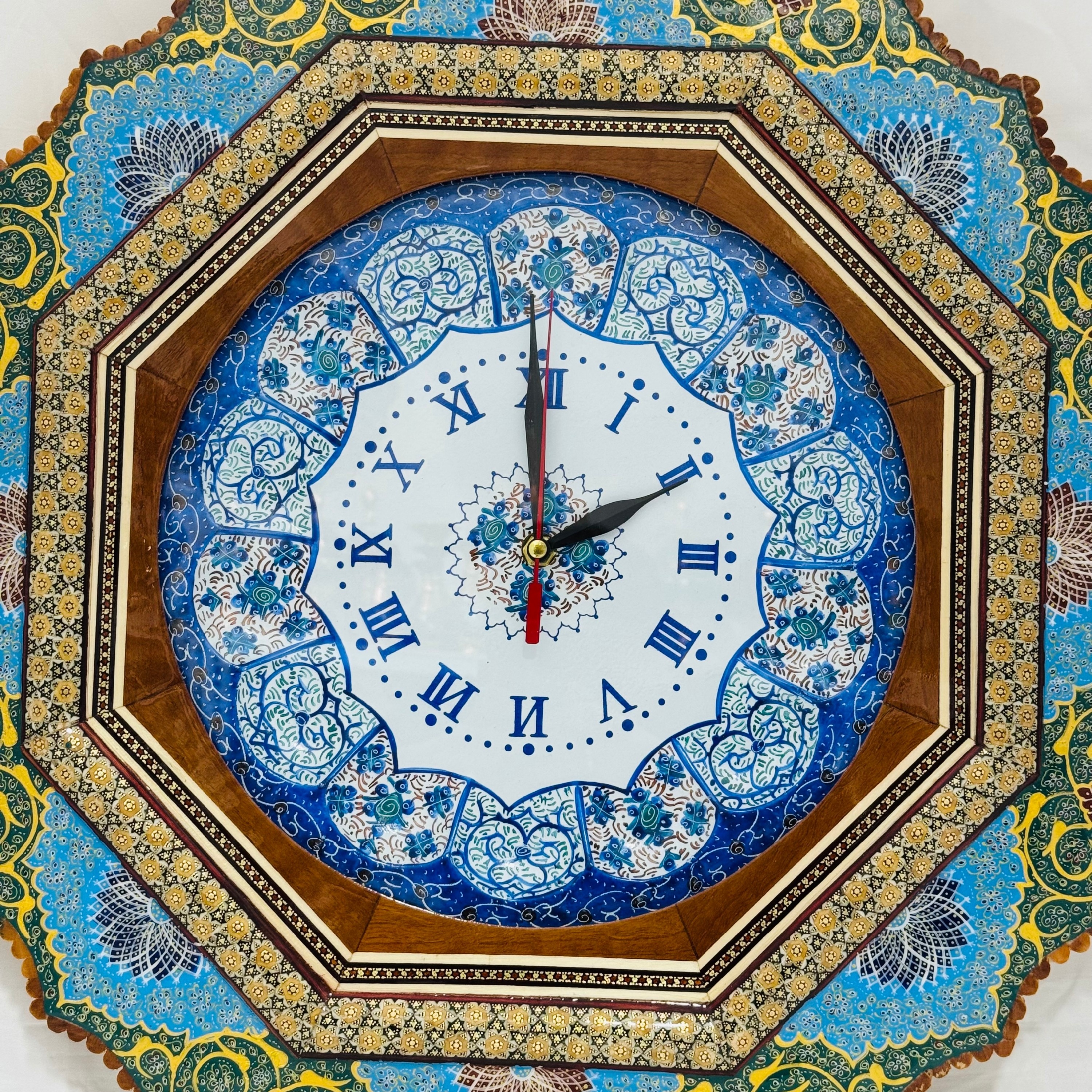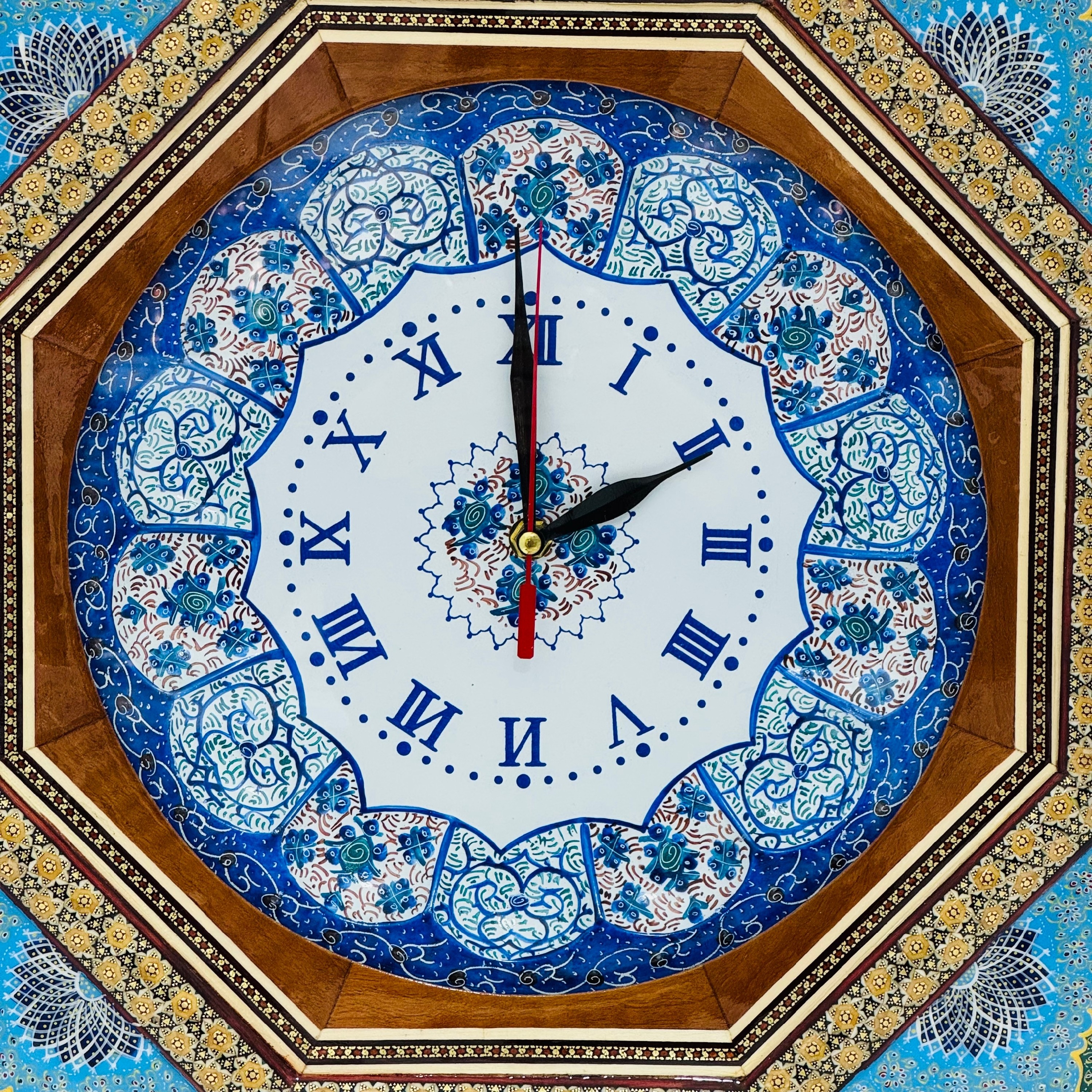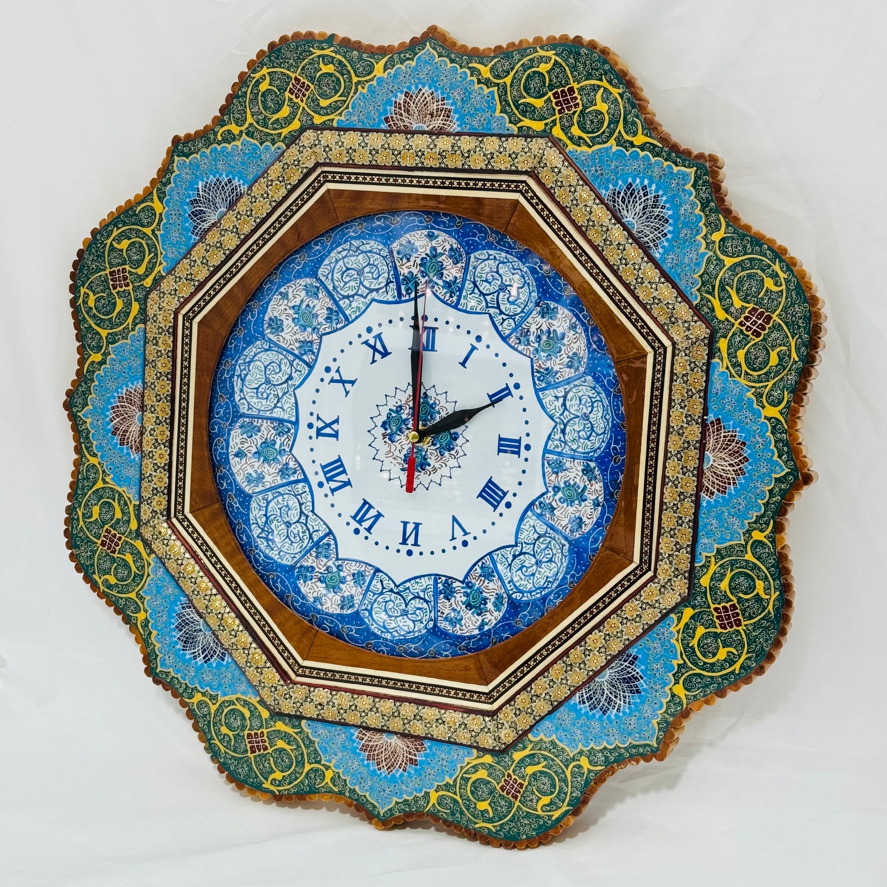 ساعت دیواری خاتم کاری مدل تذهیب دالبری به همراه صفحه میناکاری شده قل دار(ساده نیست) ، قطر صفحه داخلی این ساعت 25 سانتی متر و قطر کامل این ساعت دیواری 48 سانتی متر است بر روی کل کار پس از خاتم کاری، سه لایه پلی استر زنی شده تا جلوه و دوام کار دو چندان گردد.موتور آرام گرد و دارای محافظ موتور اعلاء می باشد. لطفا قبل از سفارش رنگ مورد نظرتون رو انتخاب کنید در غیر اینصورت یکی از طرح های زیبای تذهیب برای شما ارسال خواهد شد.
