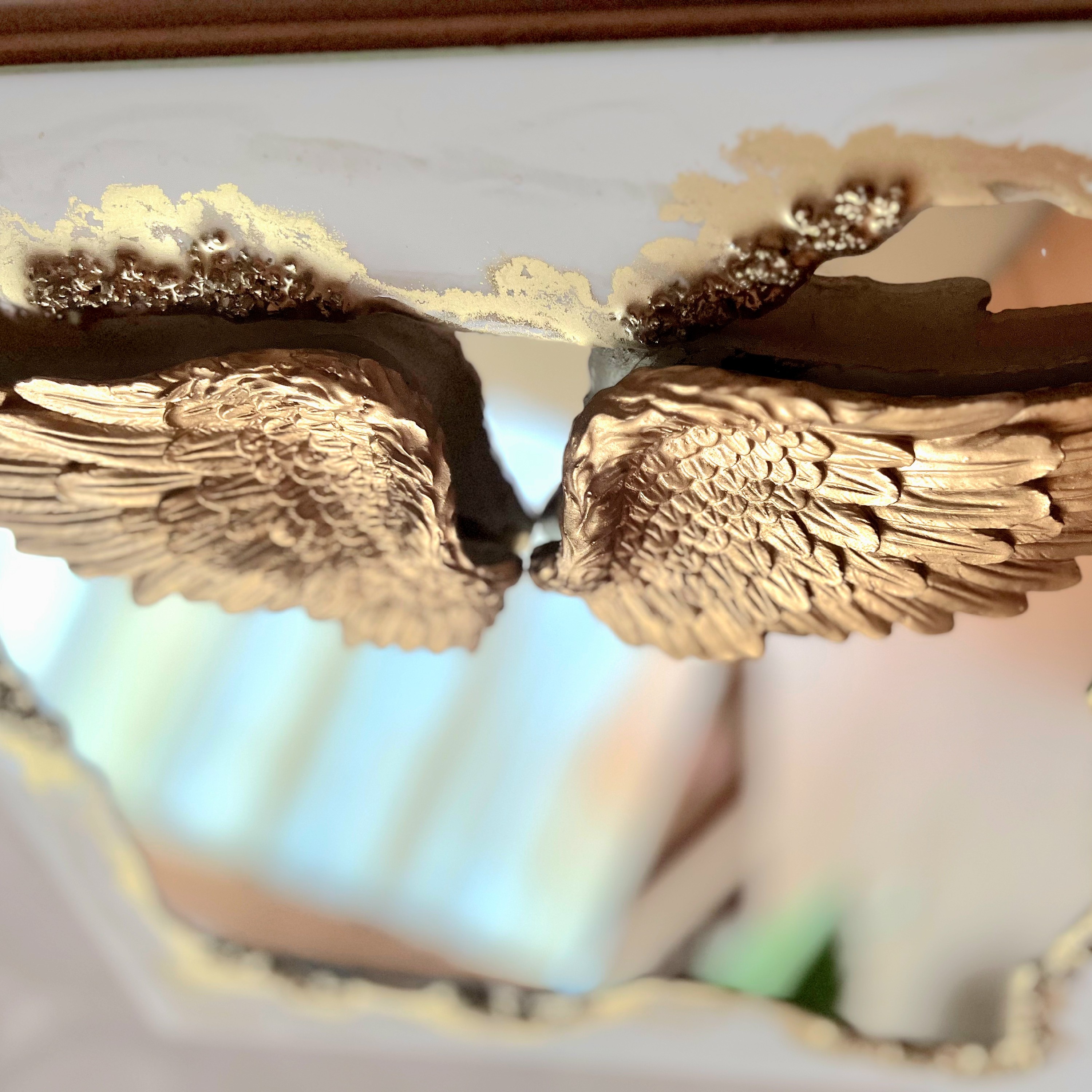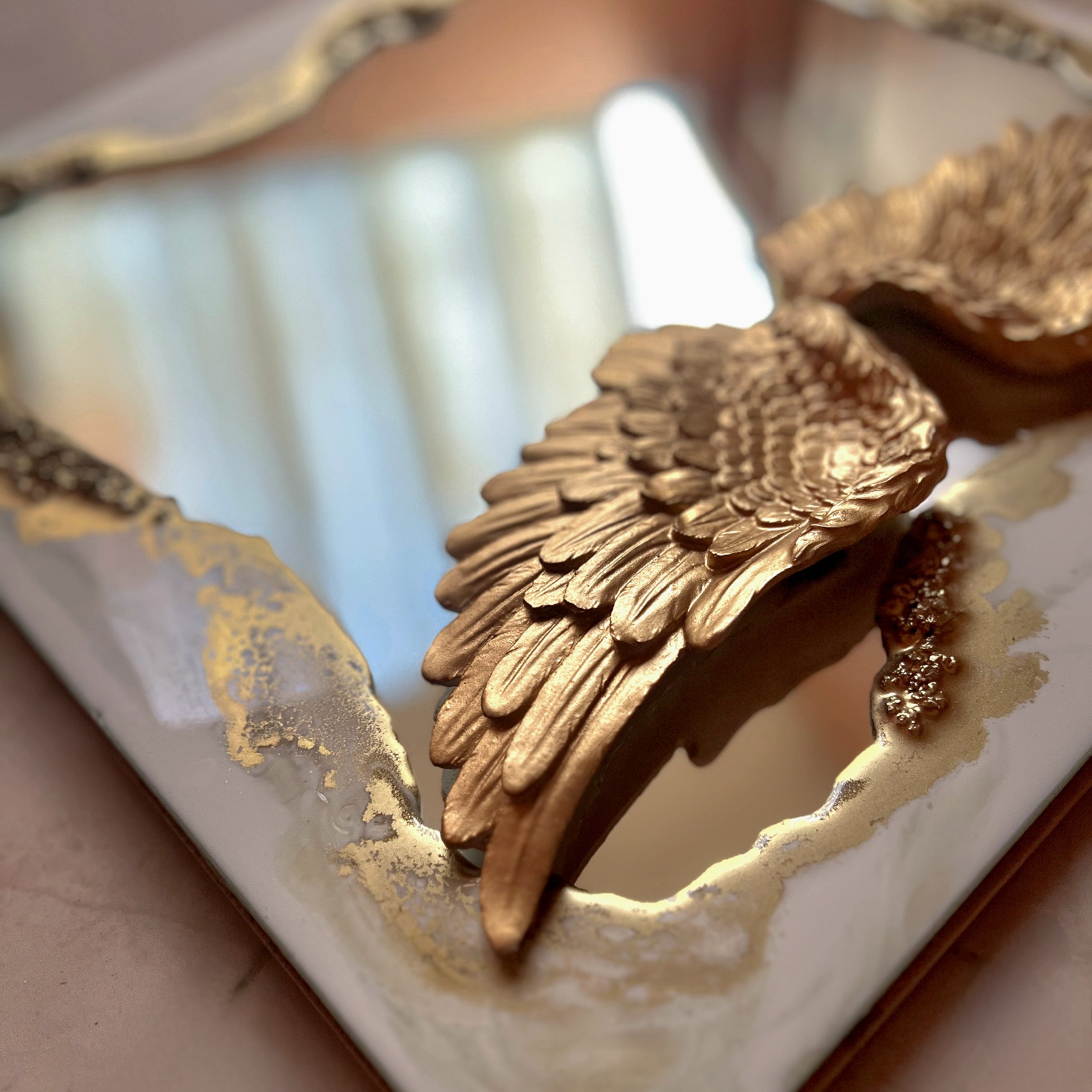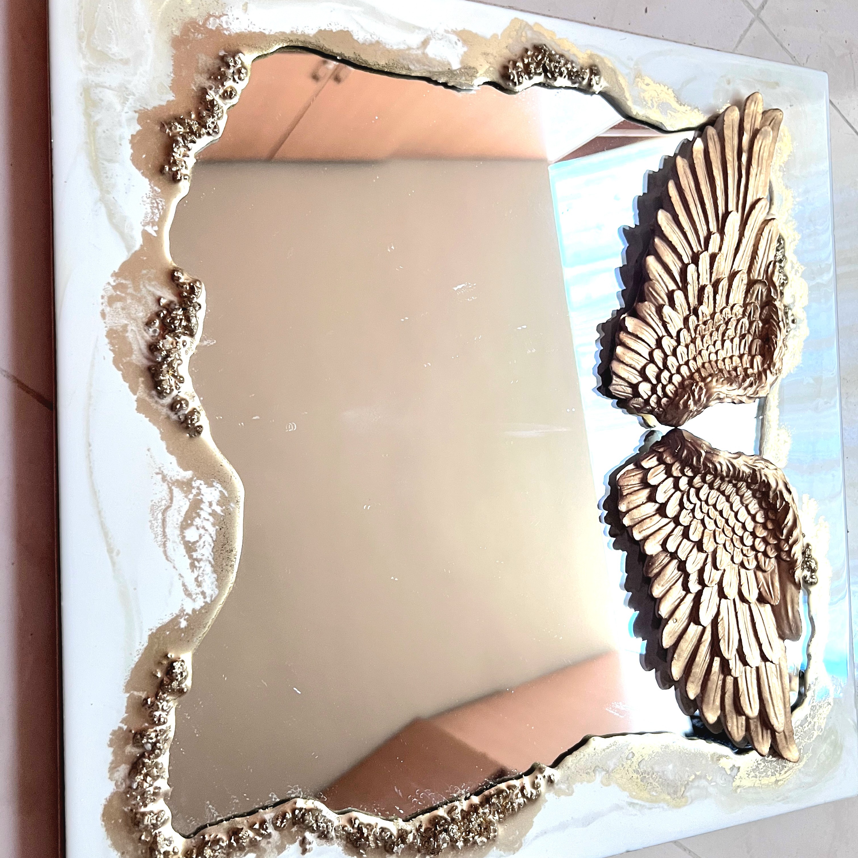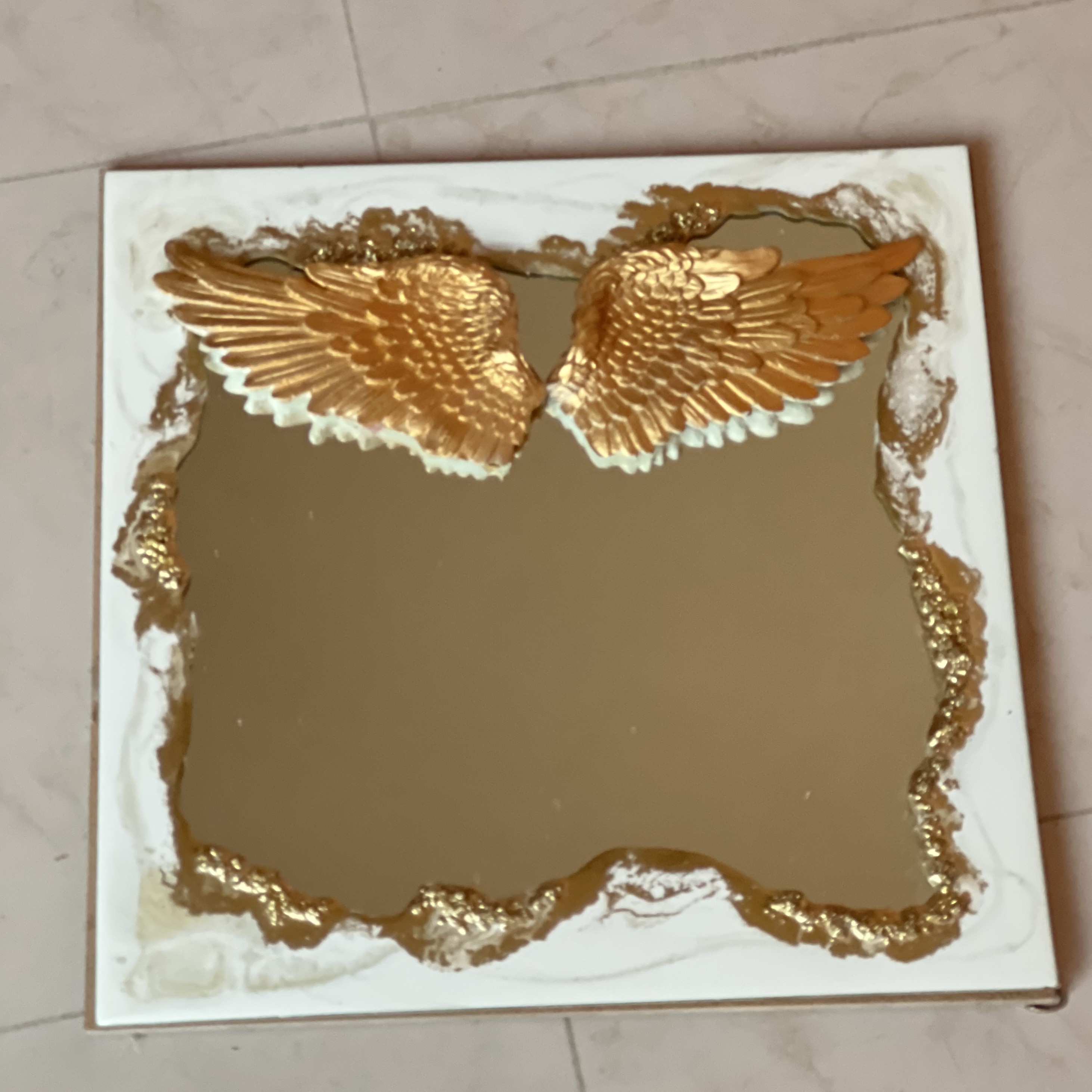 آینه ۴۵ در ۴۵ تزئین شده با رزین اپوکسی سفید طلایی همراه با بال فرشته طلایی خاص و زیبا مناسب هدیه به عزیزانتون آویز در اتاق سالن سرویس بهداشتی مناسب آینه هفت سین دست ساز و تزئینات رنگ ثابت