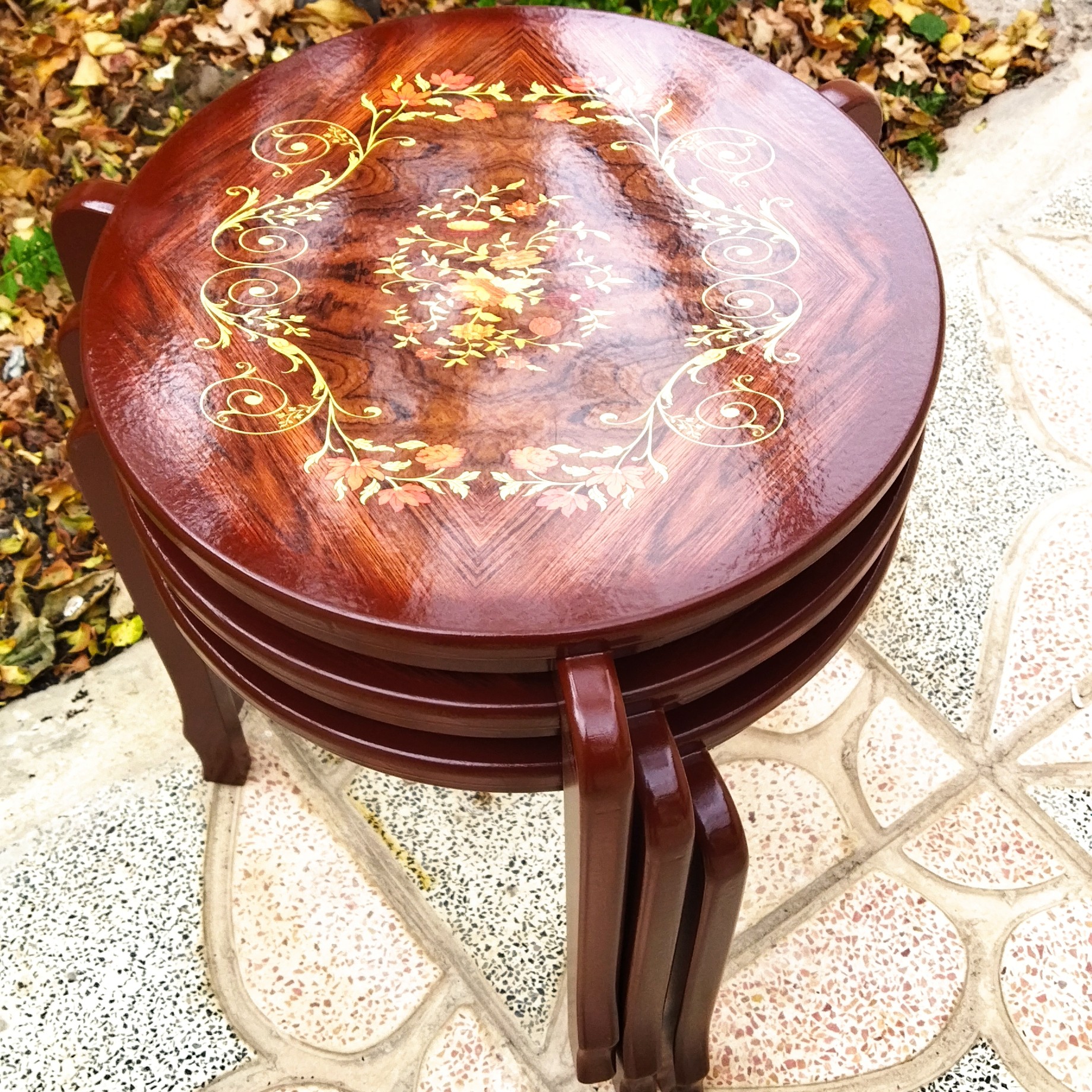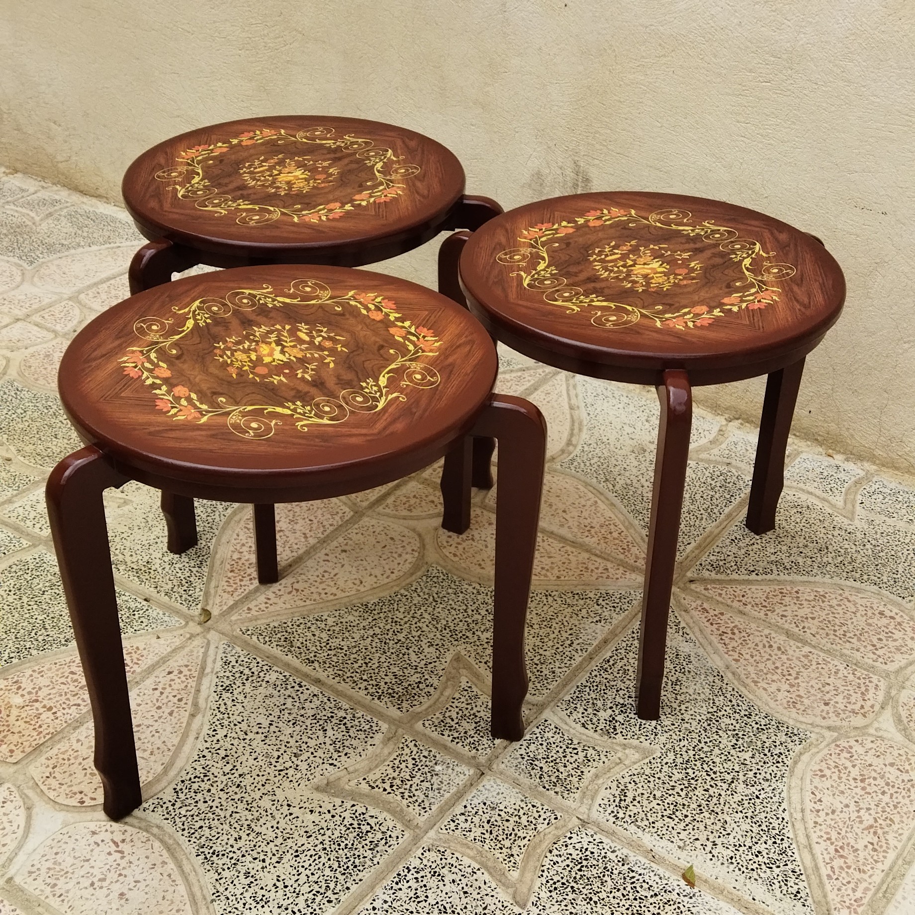 میز عسلی سه عددی رویه معرق چاپی براق ضد خش و اب جنس ام دی اف روکش چوب با کیفیت بالا و تحمل وزن بالا و در عین حال سبک سایز 40 در ارتفاع 42 مدل کاملا کم جا و مناسب پذیرایی مناسب منازل در کمجا بودن