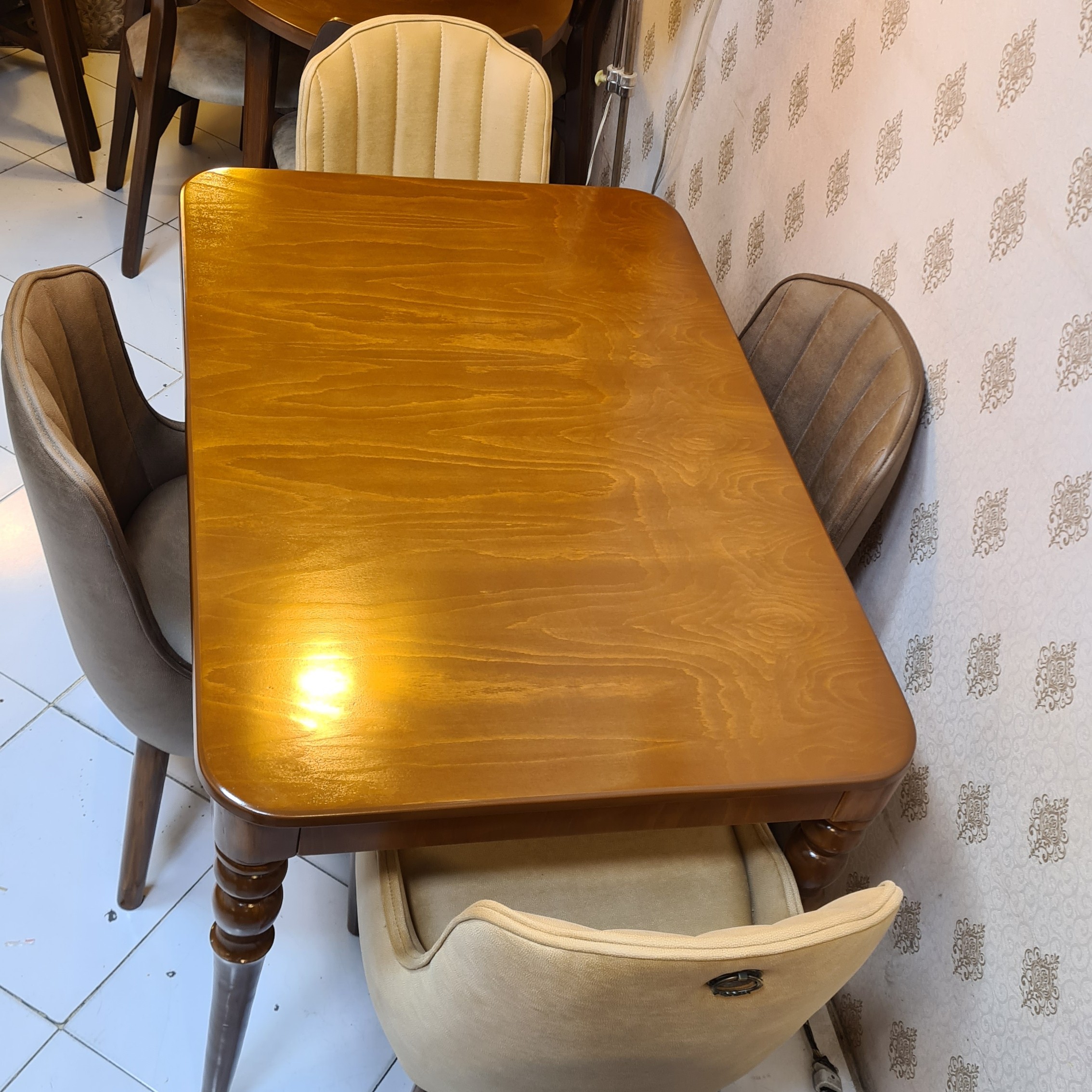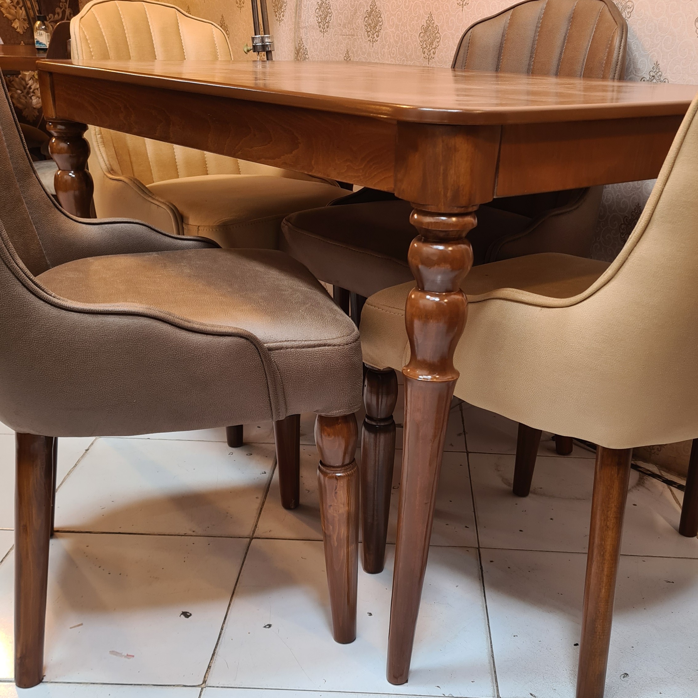 میز و صندلی غذاخوری مدل زیبا و خاصی مارال این کار هم 4 نفره هم 6 نفره هم 8 موجود هست یه کاره ساده و شیک صفحه میز ام دی اف روکش راش پایه میز چوب روسی هستش پایه میز پیج و مهره ای است و قابلیت بازو بسته شدن دارد کل کلاف صندلی ها چوب روسی و پارچه ی کار مایا هست پایه میز با پایه جلوی صندلی ها ست هستش هم رنگ پارچه هم رنگ چوب به دلخواه مشتری قابل تغییر است 🟢اسفنج کف:35 کیلویی ابعاد میز 4 نفره این کار ارتفاع میز 79 سانتی متر 🔴برای تغییره رنگه چوب و پارچه 7 روز کاری زمان لازمه 🟢هزینه و باربری و اسنپ به عهده مشتری عزیز میباشد🌹❤️