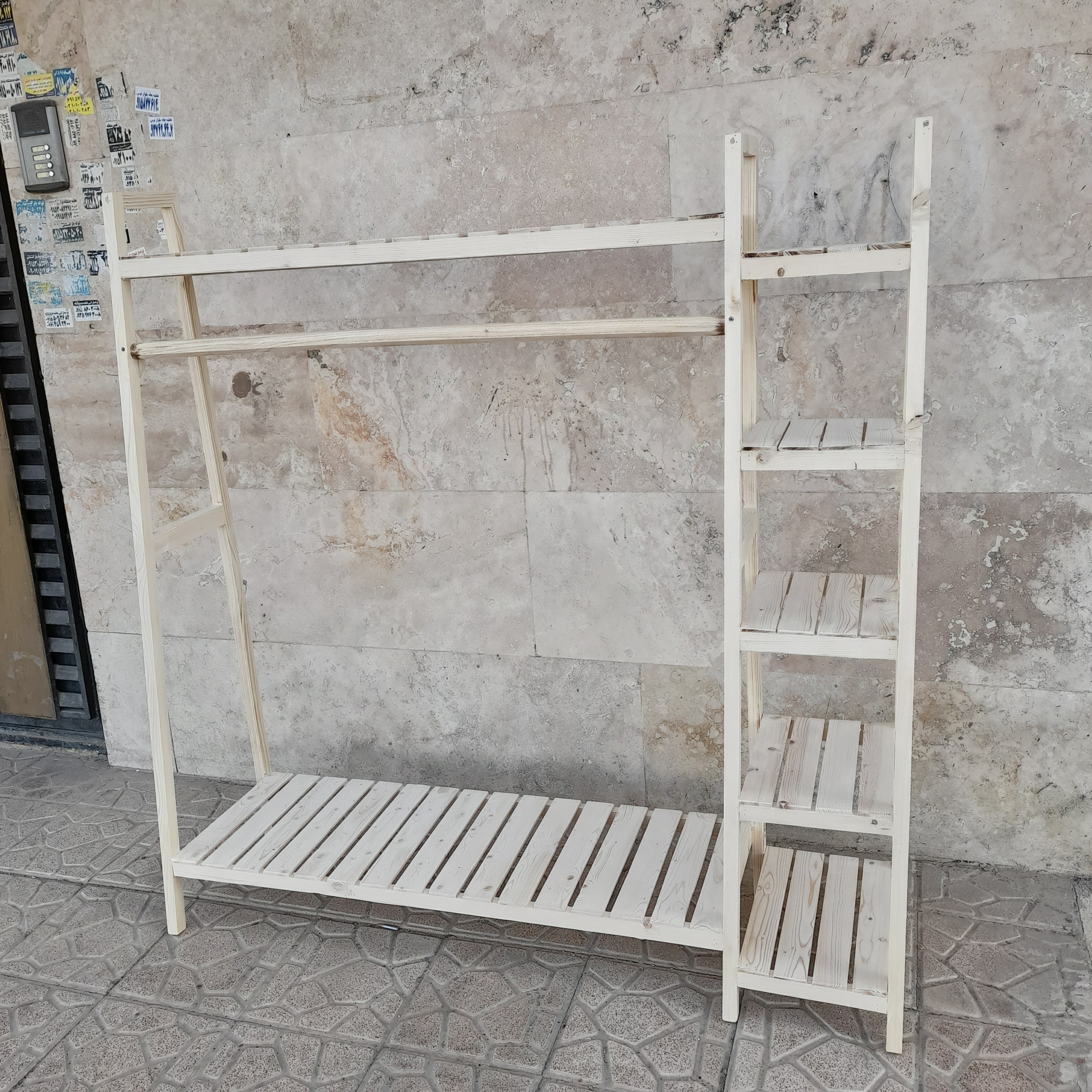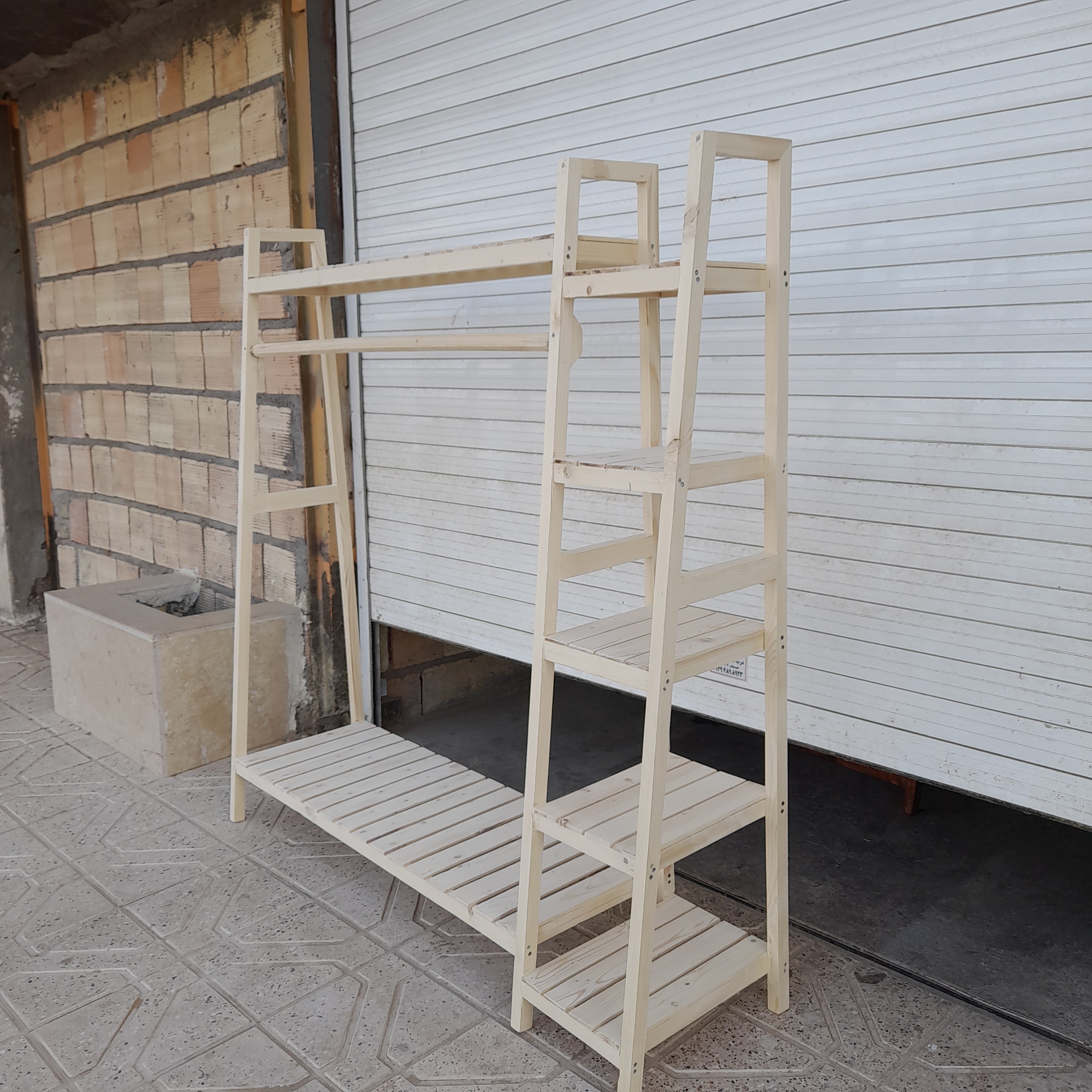 رگال لباس چوبی مدل ذوزنقه ایی ابعاد این نمونه رگال به طول ۱۳۰ در ارتفاع ۱۵۰ و عمق ۴۵ سانتی متر میباشد رنگ کرم همان خودرنگ چوب جلاخورده میباشد