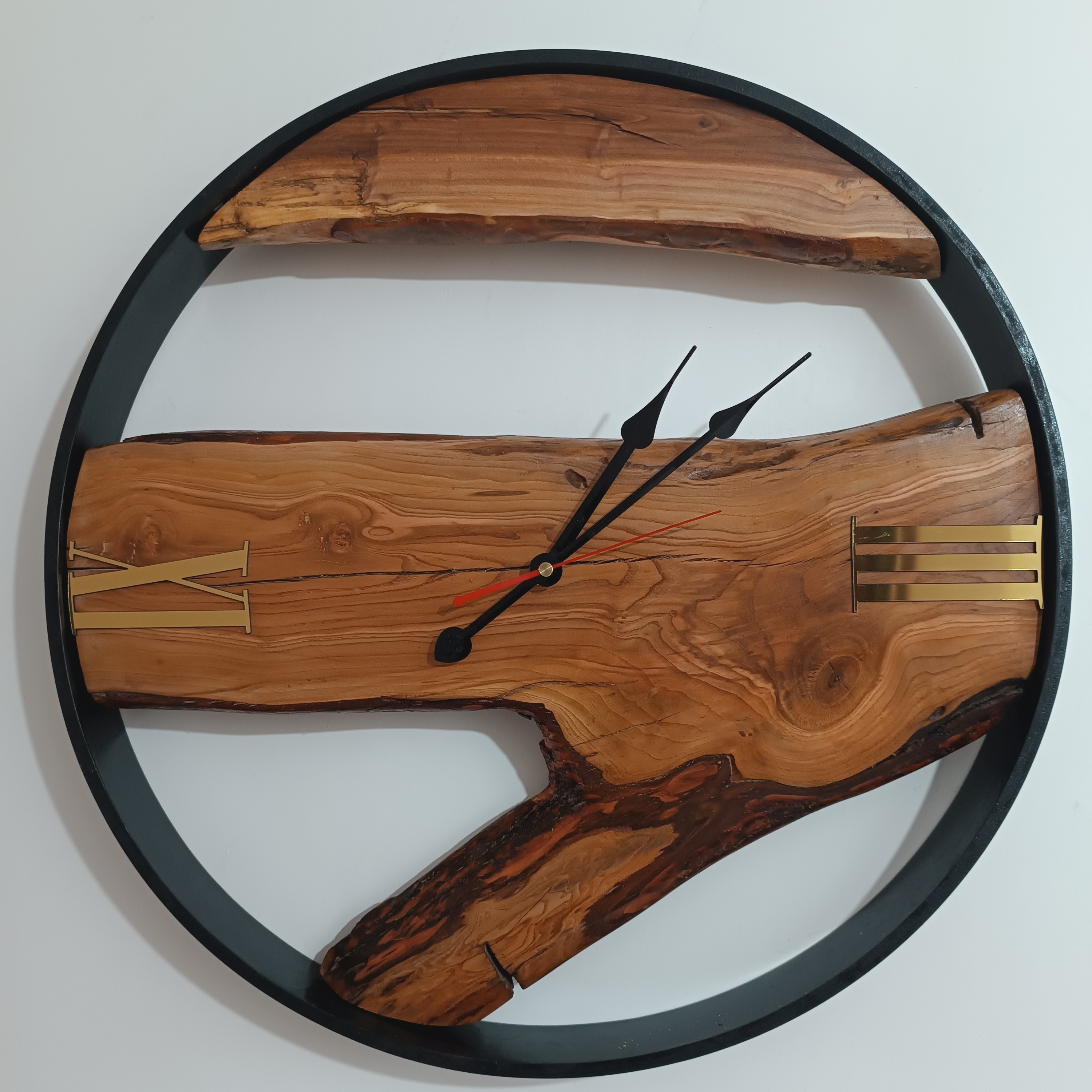 ساعت دیواری چوبی روستیک رینگ فلزی قطر۵۰سانت چوب مقاوم وکمیاب آلو رنگ اصلی چوب پوشش روغن گیاهی