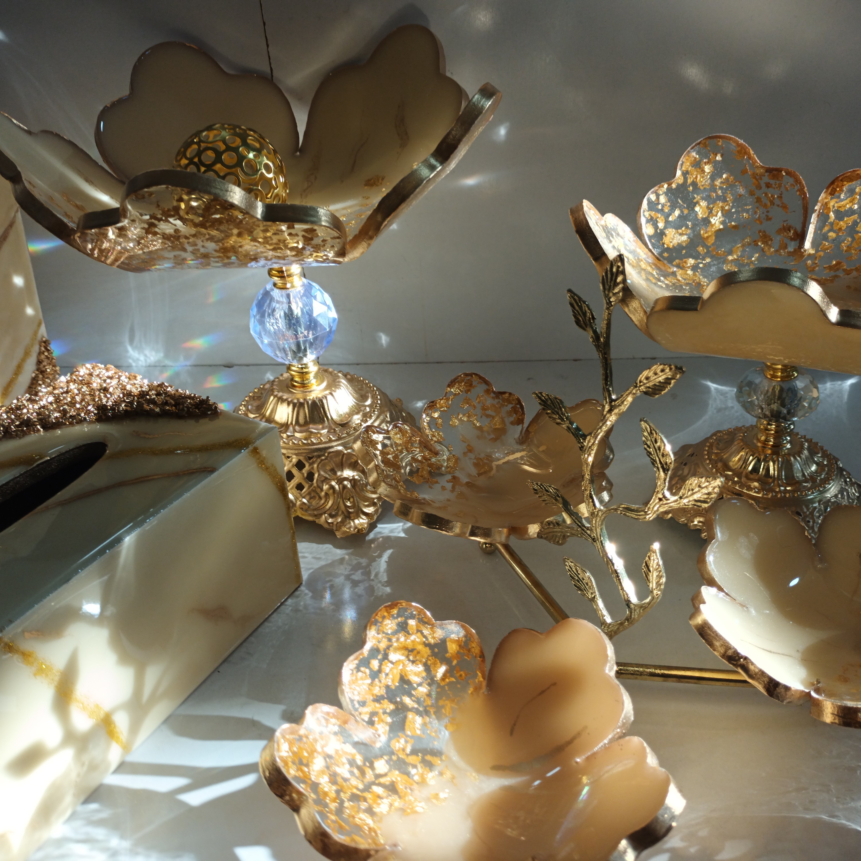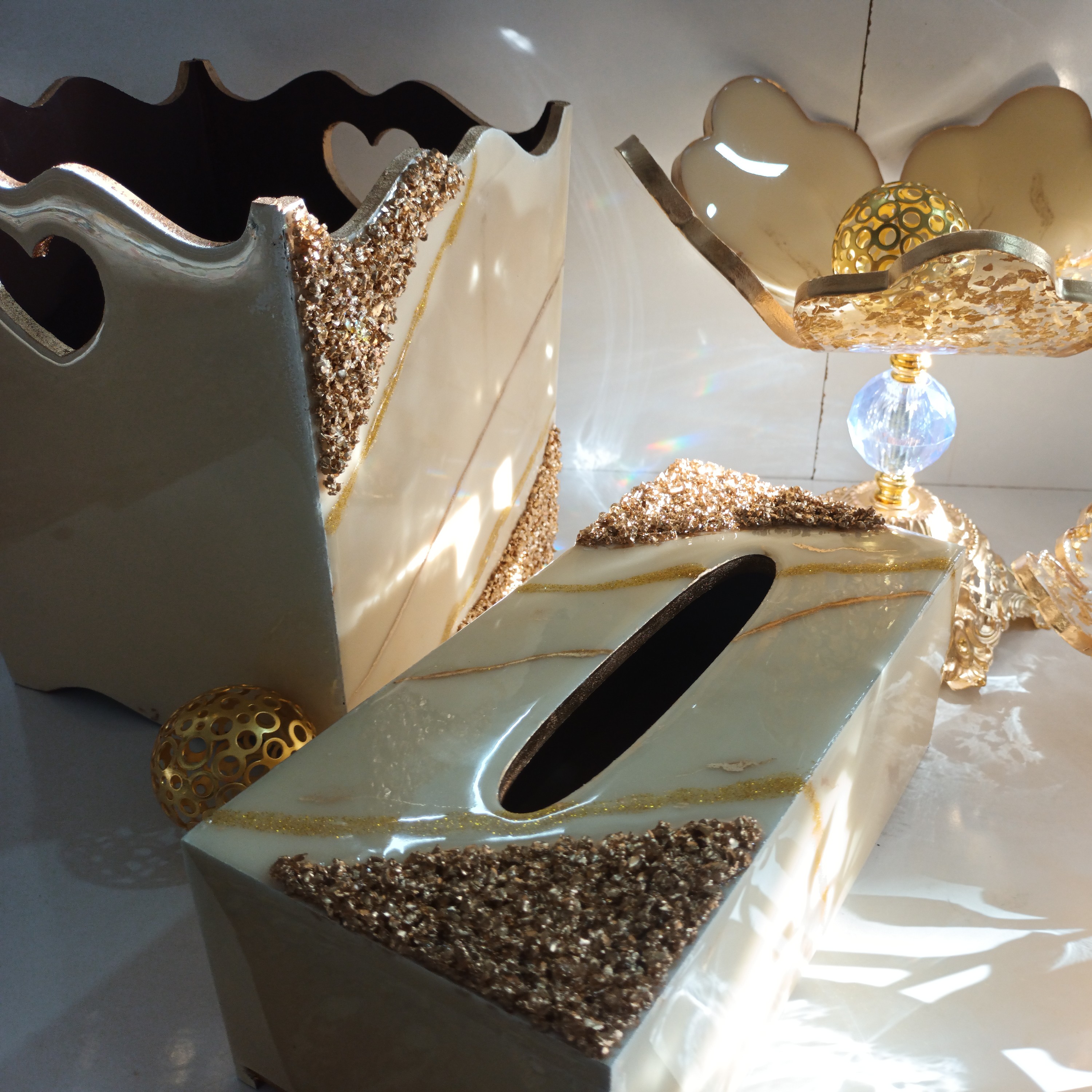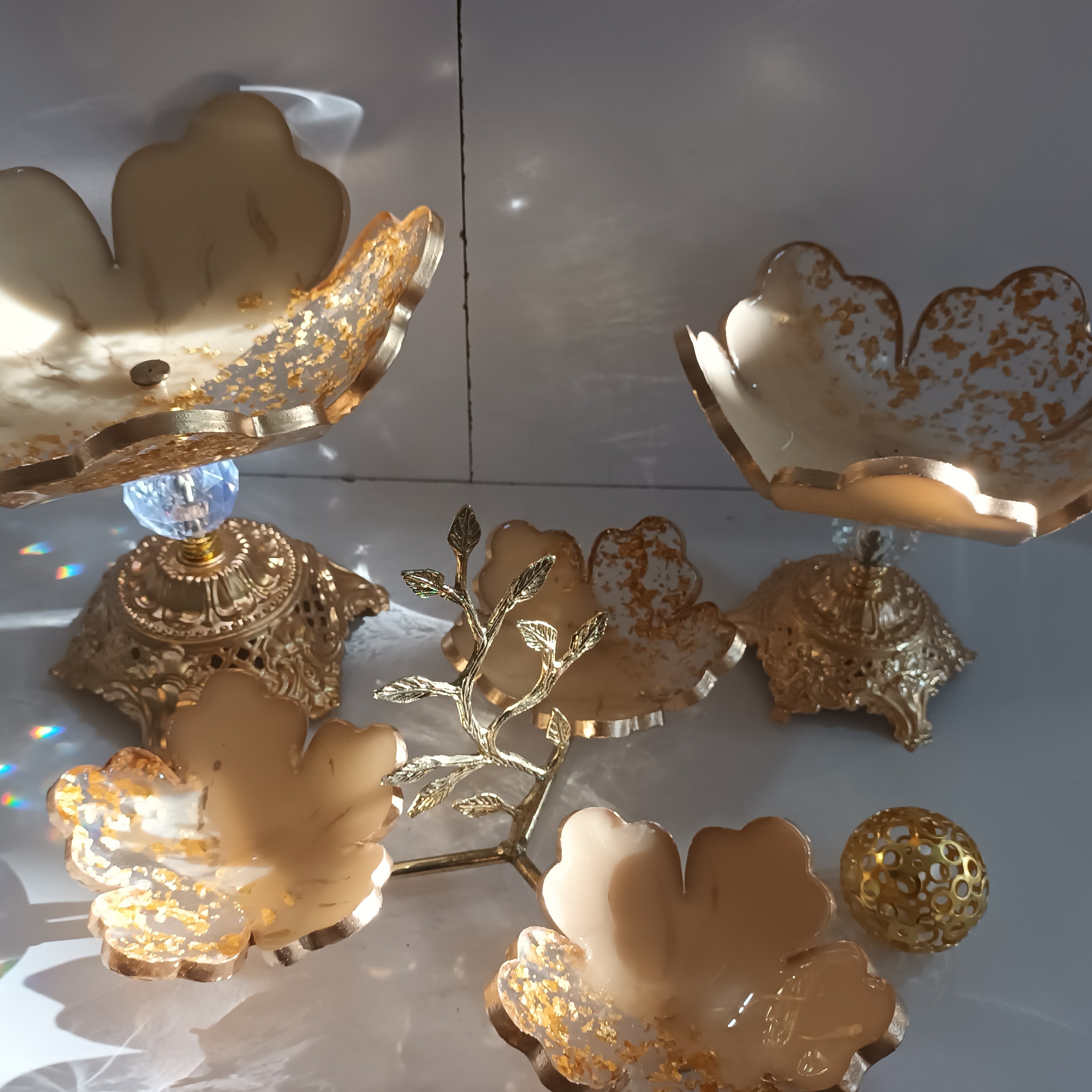 ست پذیرایی زیبا و شیک شامل : ساعت دیواری 50 سانت شیرینی خوری دو طبقه اردو خوری آجیل خوری شکلات خوری جعبه دستمال و سطل کل کار قابل اجرا به طرح و رنگ دلخواه شما ضمانت کیفیت و زیبایی ظروف قابل شستشو. سبک و تا 80 درصد نشکن ساعت دیواری دارای کارت ضمانت یکساله هست که به همراه ساعت برای شما ارسال میشود