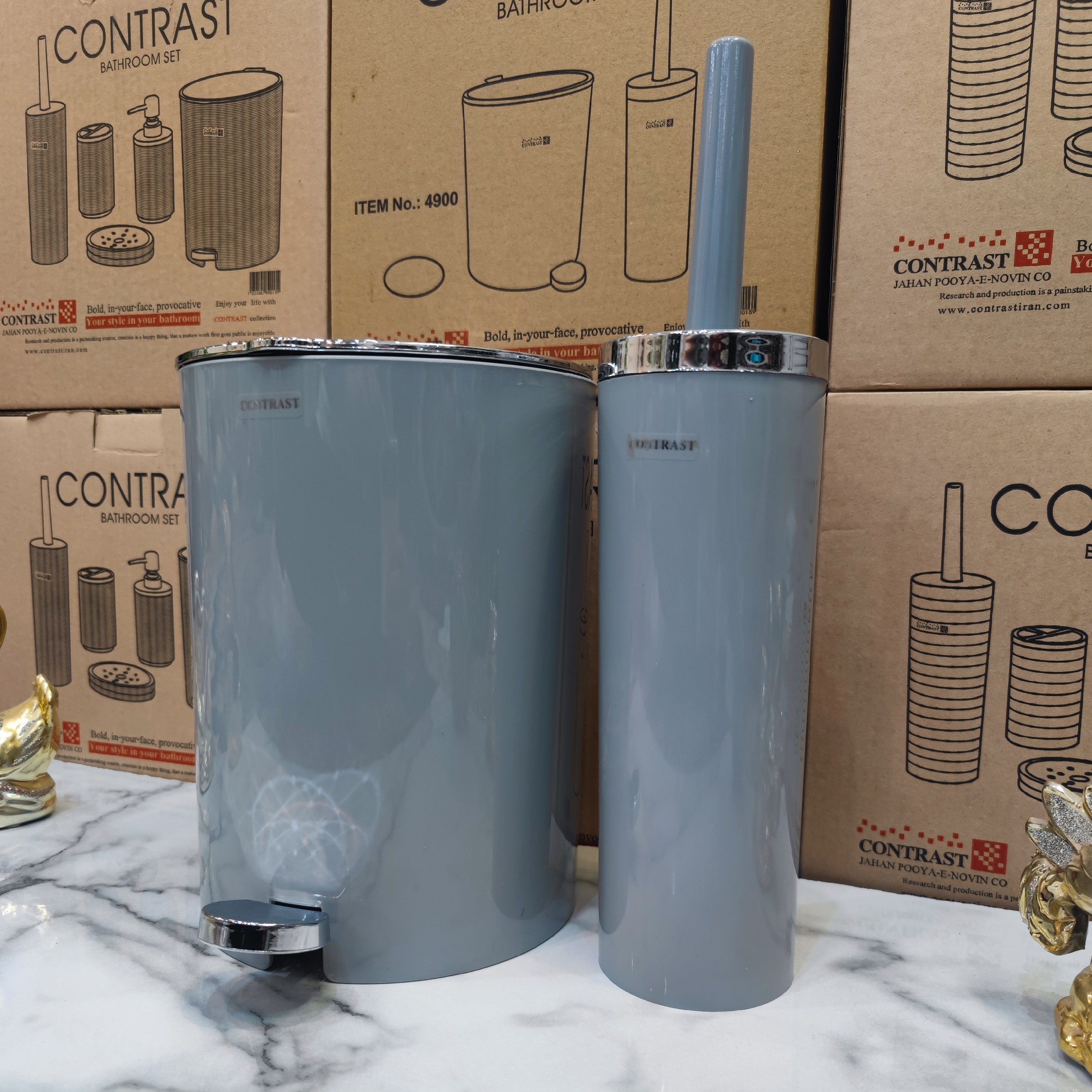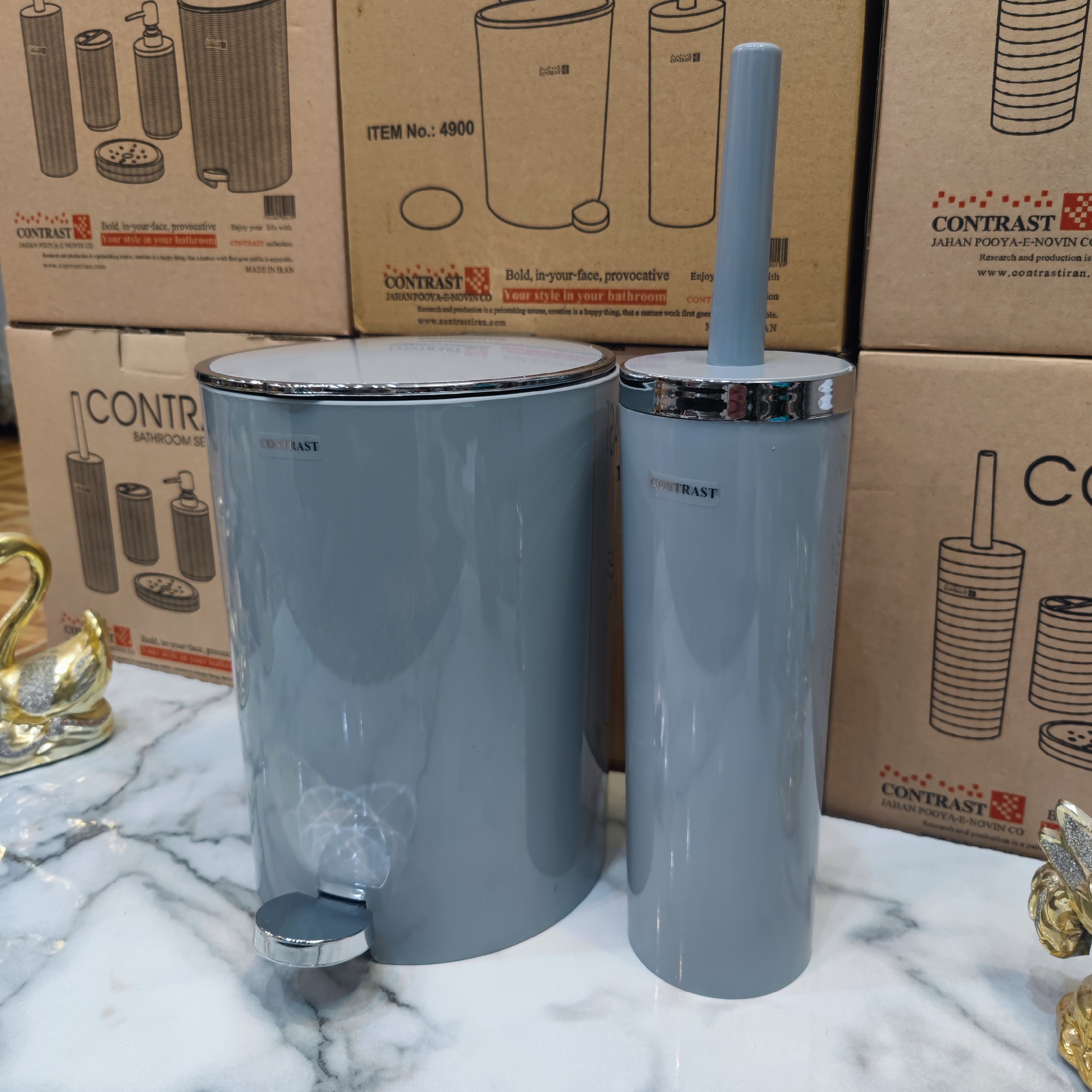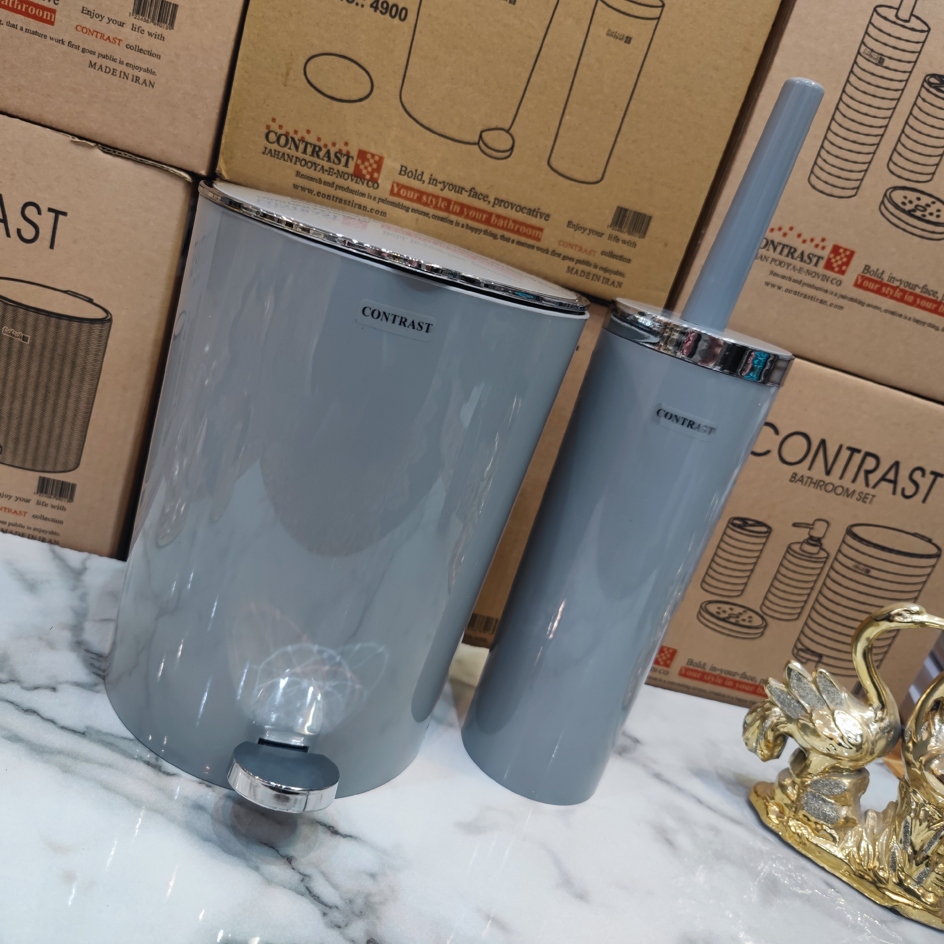 ست سرویس بهداشتی سطل و فرچه برند کنتراست ارسال سریع رنگ طوسی روشن کروم