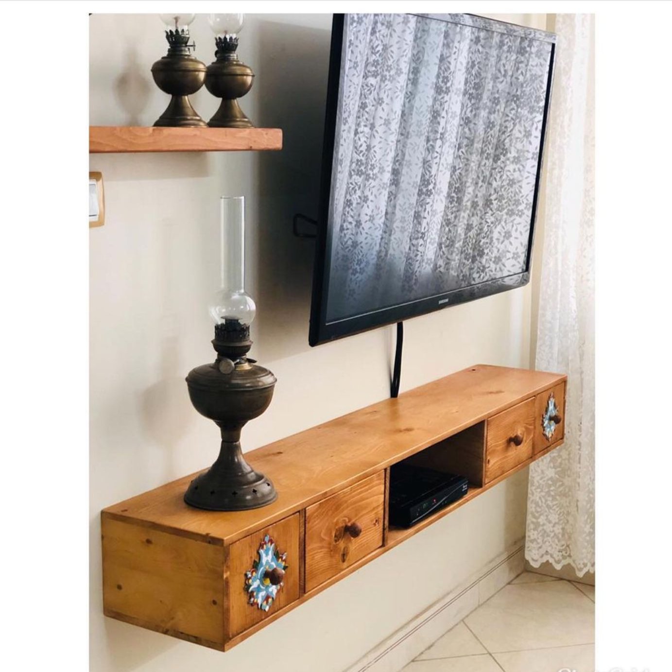 میز تلویزیون با باکس و شلف ترکیب چوب و سرامیک، چهار کشو مبلمونسرا مدل 220045