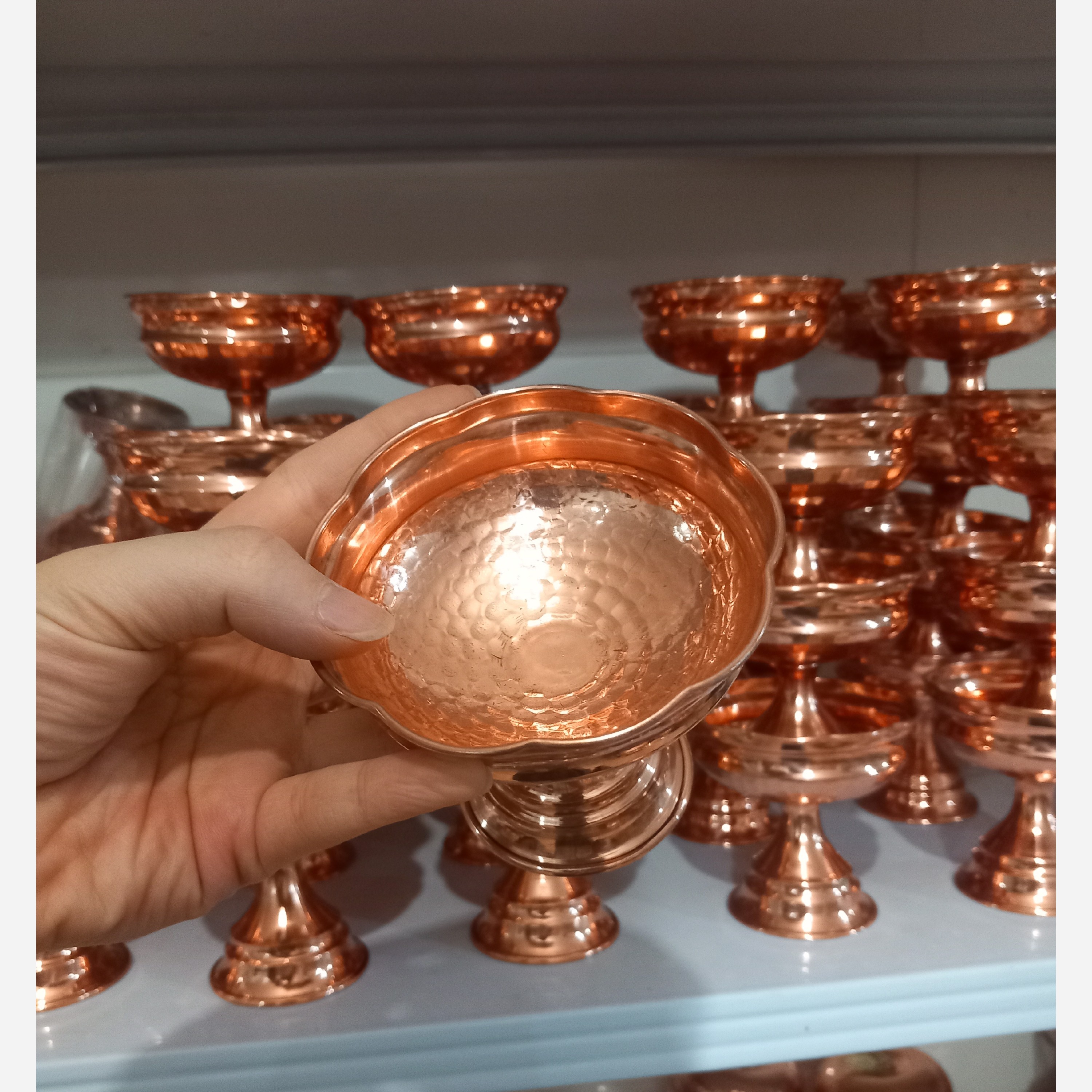 شش عدد ظرف هفت سین که برای پذیرایی با تنقلات هم مناسب است داخل قلع شده مسی چکش کاری شده کاملا دست ساز تک پایه،قطر ۱۰ سانت ارتفاع ۹ دور چین دار نانو شده و رنگ ثابت مناسب آجیل و یا هفت سین نوروزی و بستنی خوری ارسال رایگان